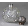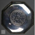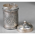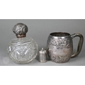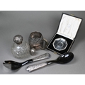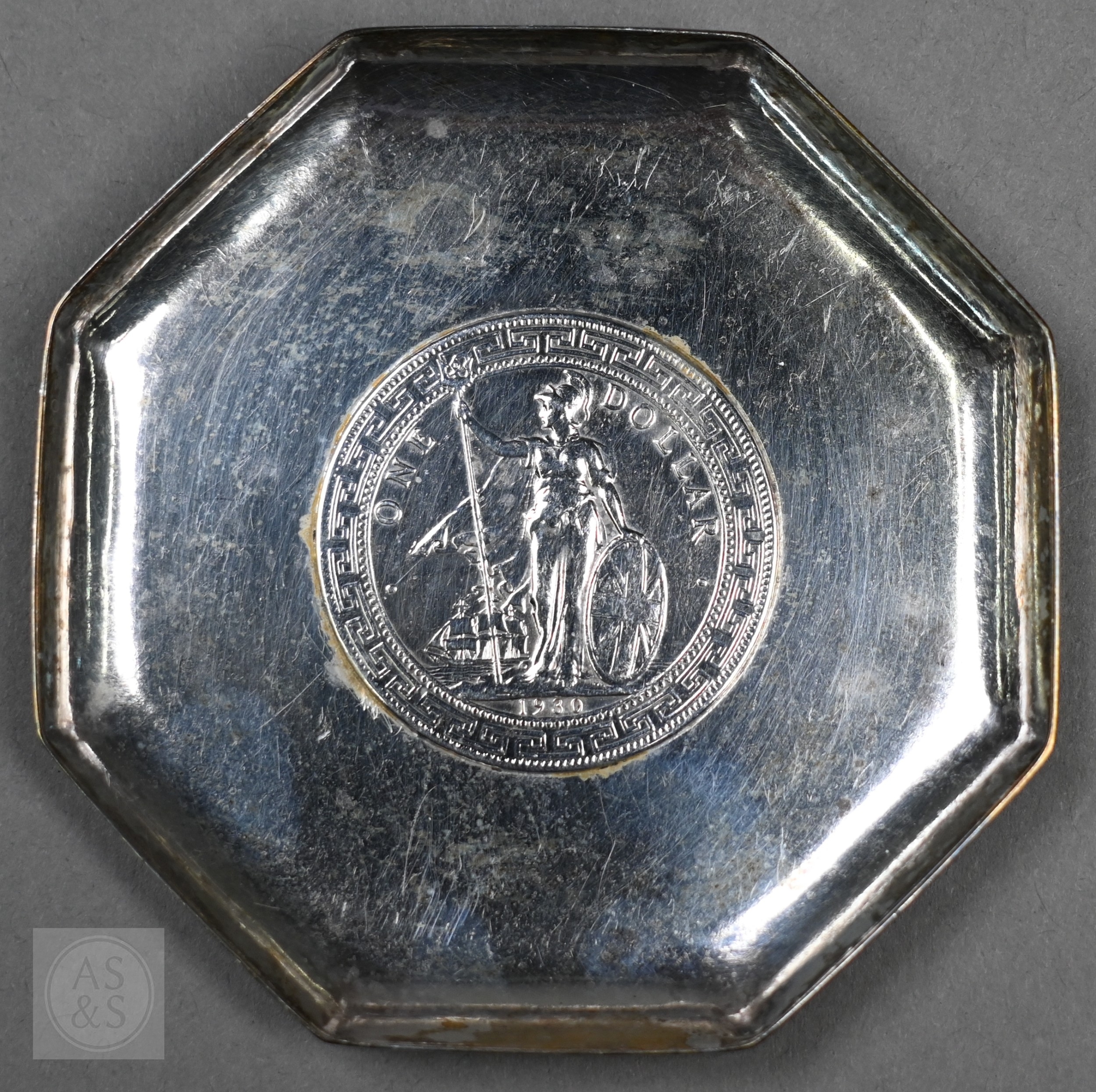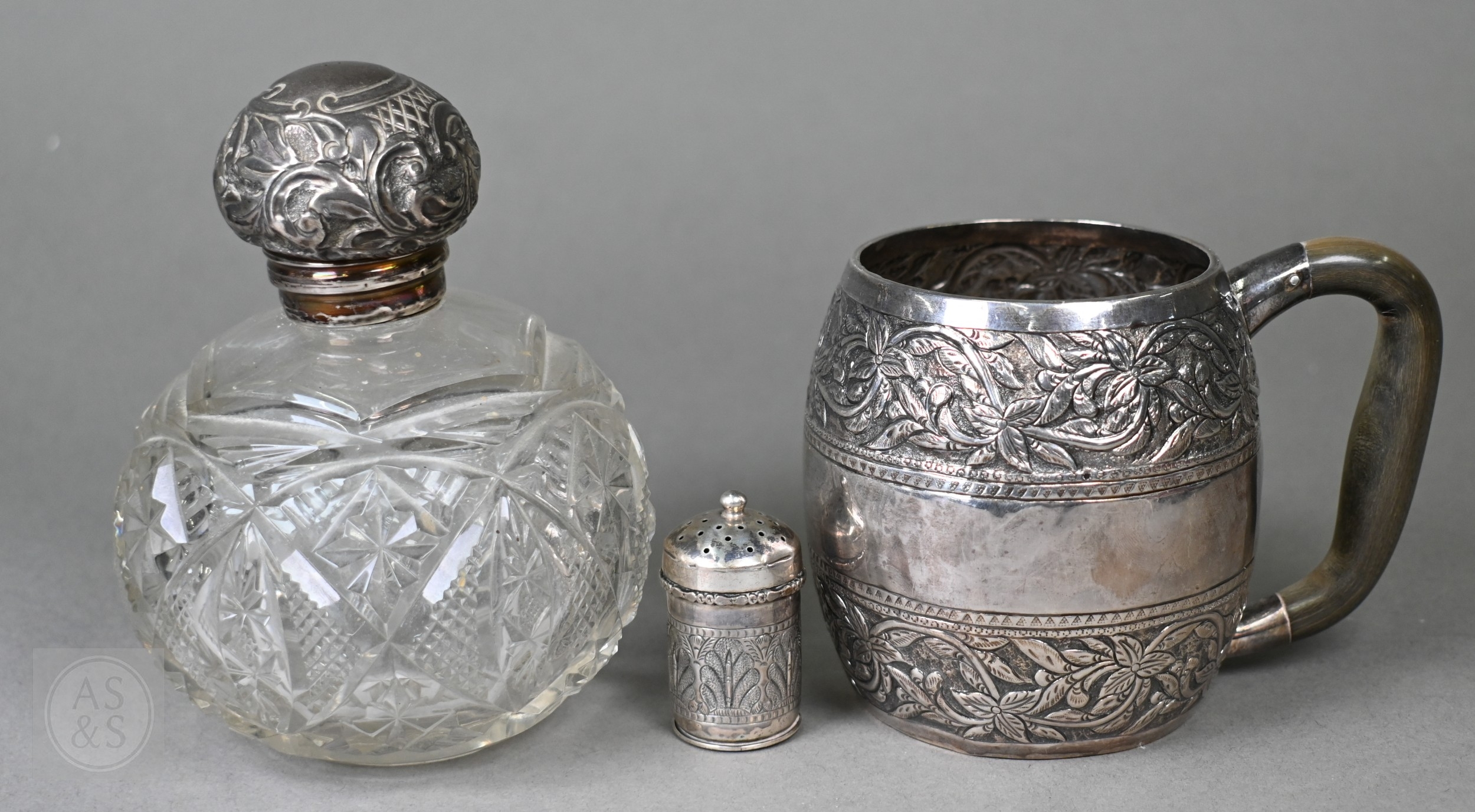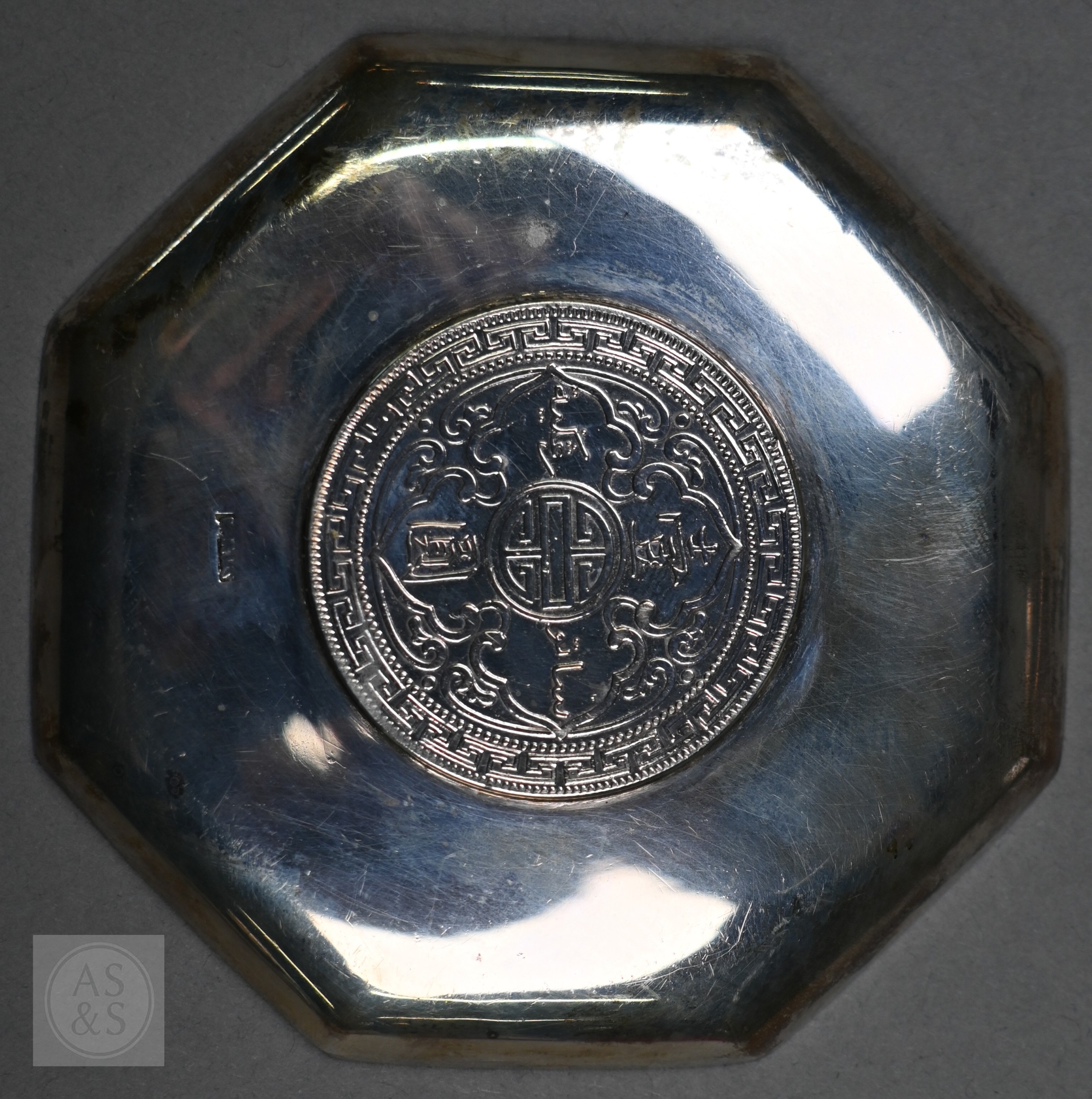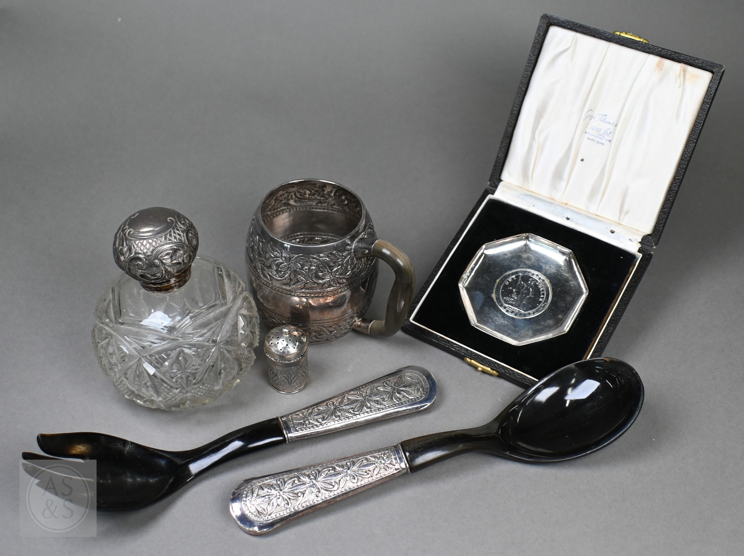 A cased Chinese silver octagonal pin-dish, set with a 1930 Hong Kong dollar; lot also includes an Asian floral-chased white metal mug of barrel form with horn handle, a pair of horn salad servers with similar white metal handles and a pepperette, to/w an Edwardian cut glass globular scent bottle with silver screw bun cover, Birmingham 1906