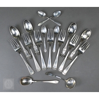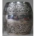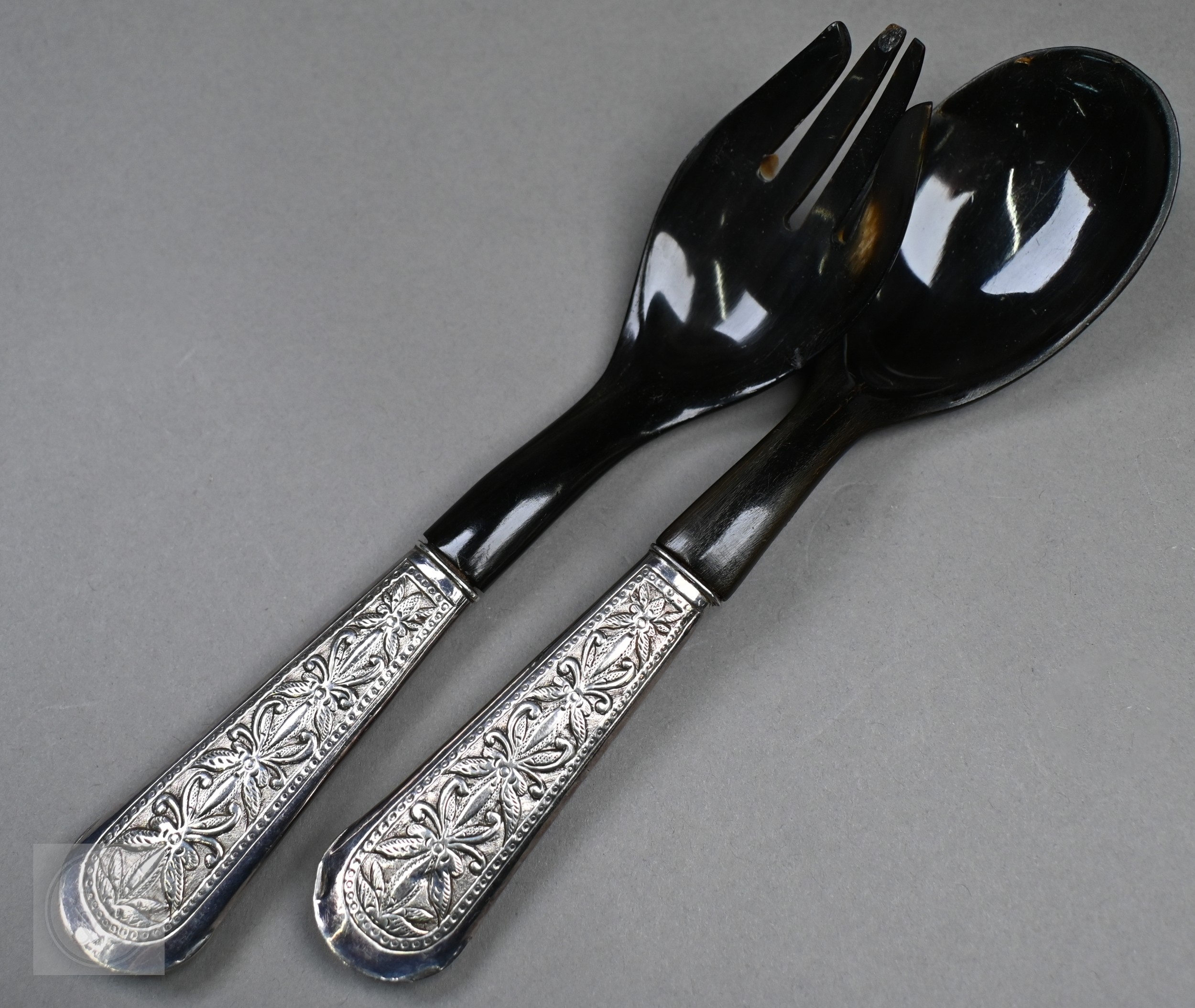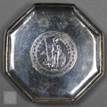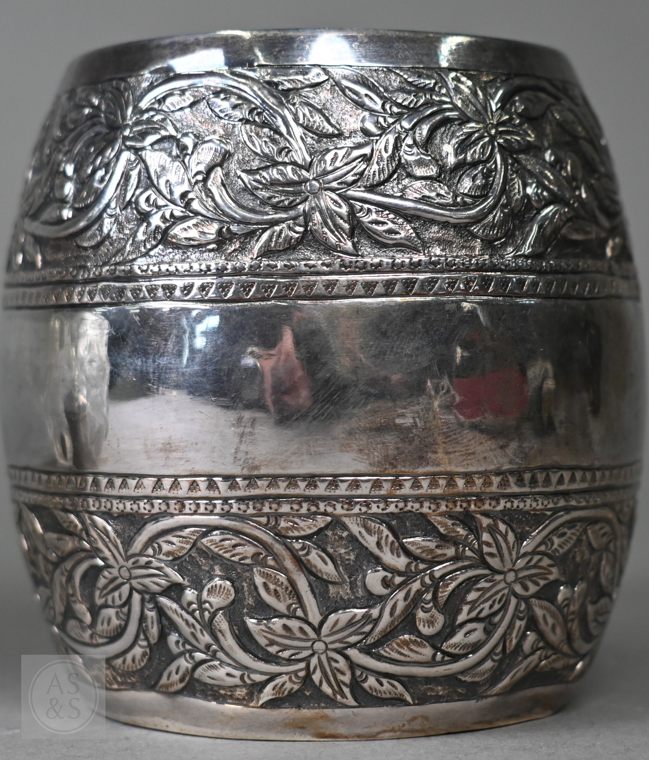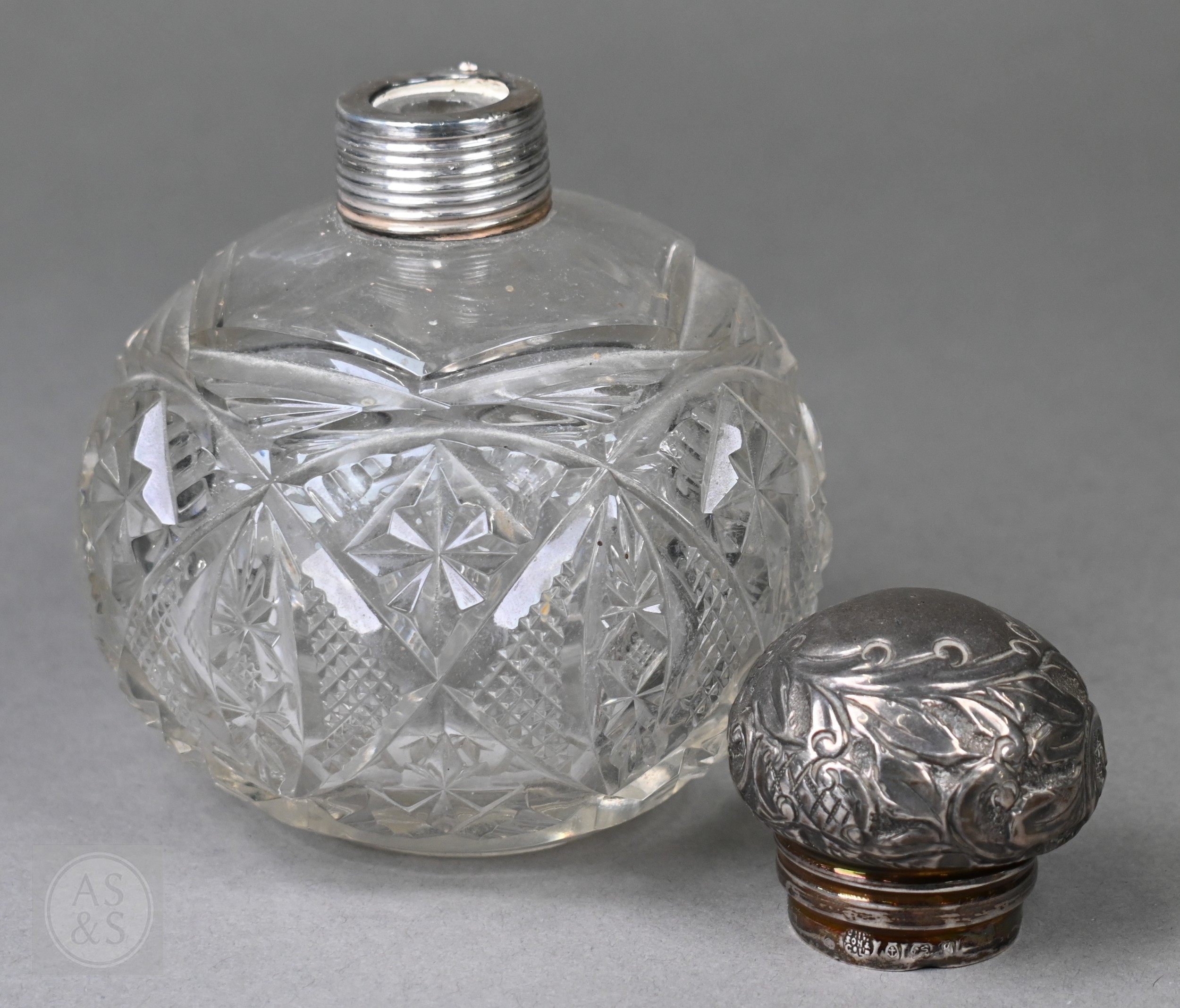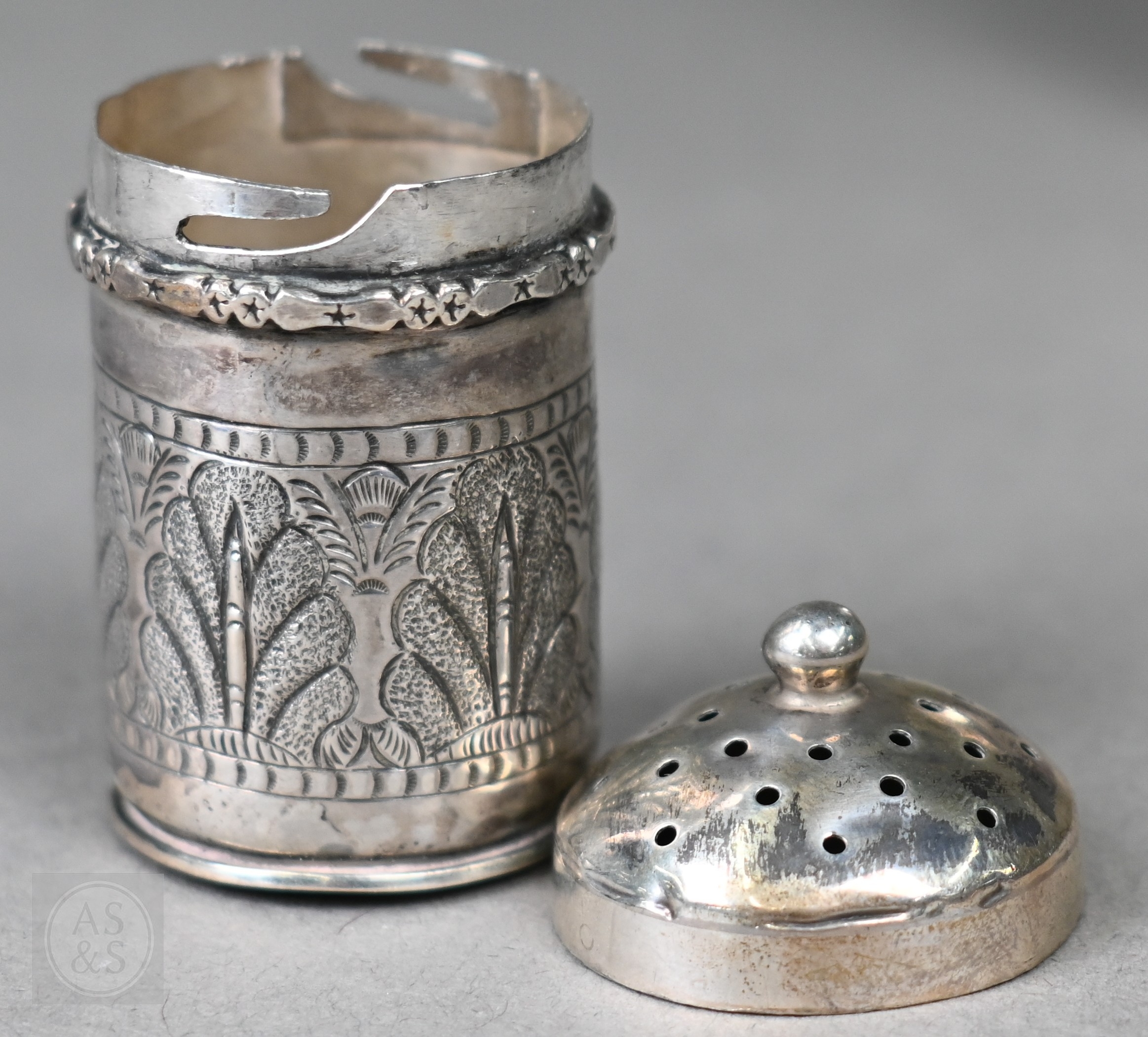 A cased Chinese silver octagonal pin-dish, set with a 1930 Hong Kong dollar; lot also includes an Asian floral-chased white metal mug of barrel form with horn handle, a pair of horn salad servers with similar white metal handles and a pepperette, to/w an Edwardian cut glass globular scent bottle with silver screw bun cover, Birmingham 1906