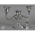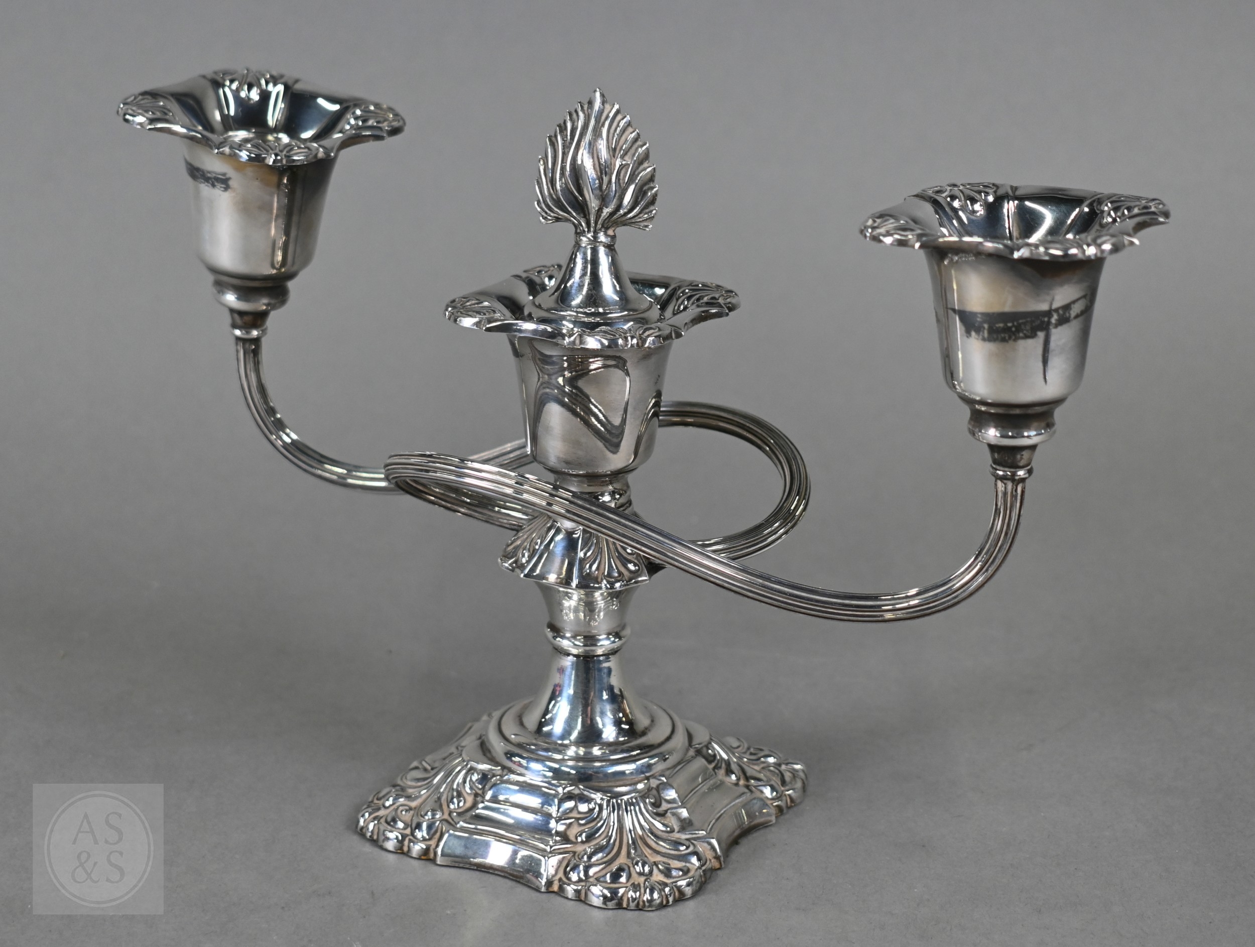 A loaded silver three-sconce candelabrum with twin branches and detachable central flame finial, Birmingham 1969, 18cm high
