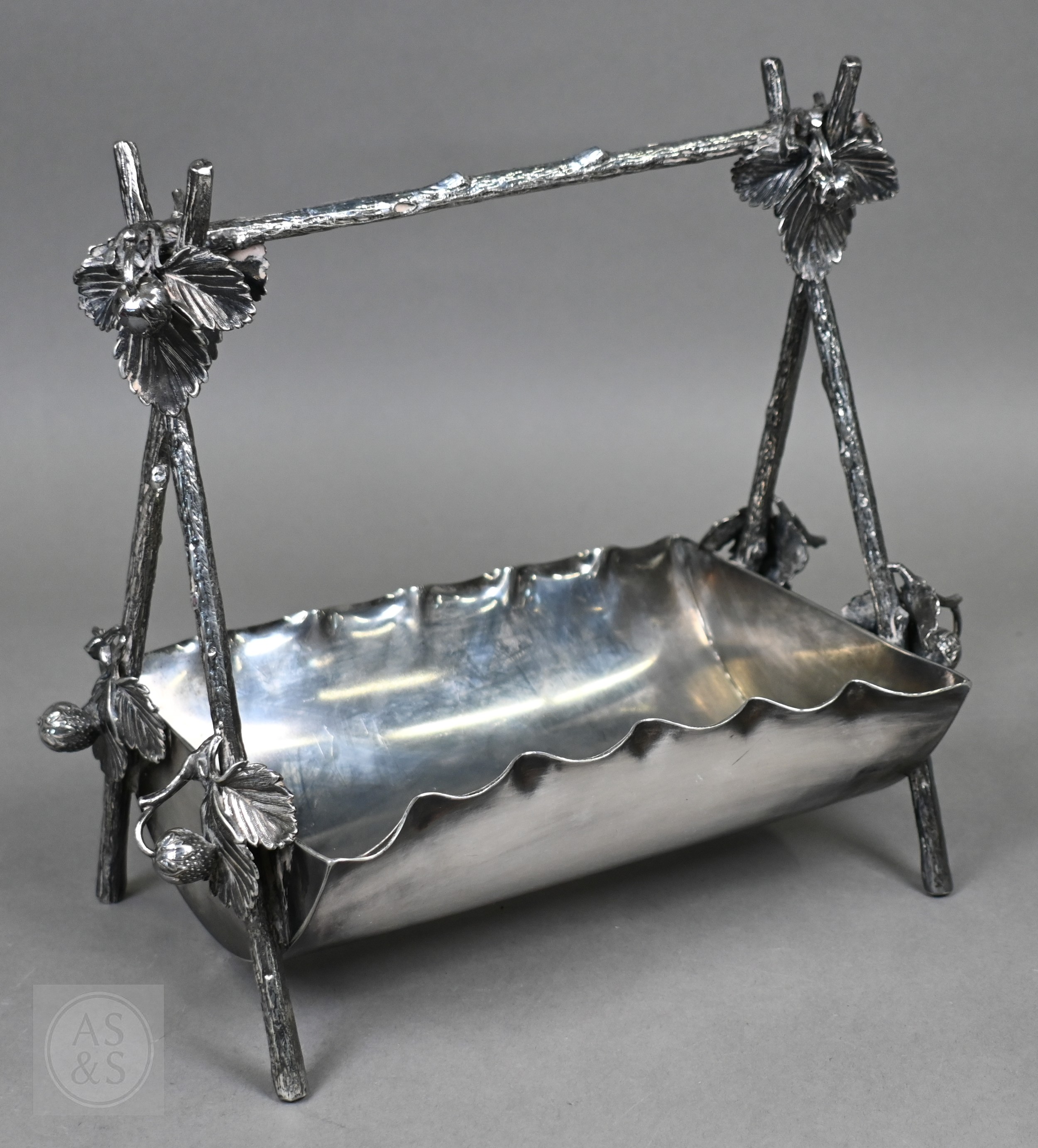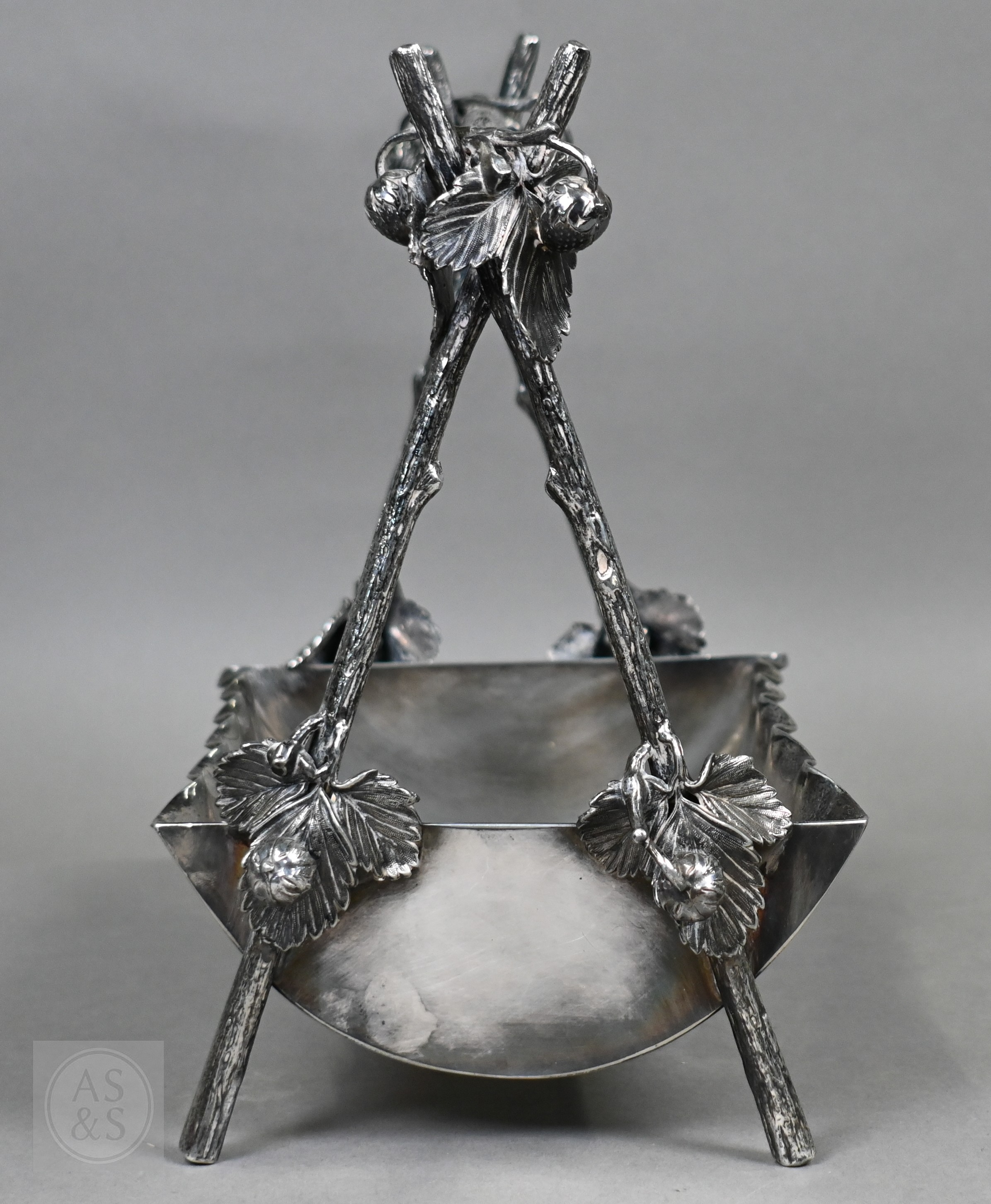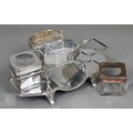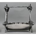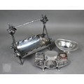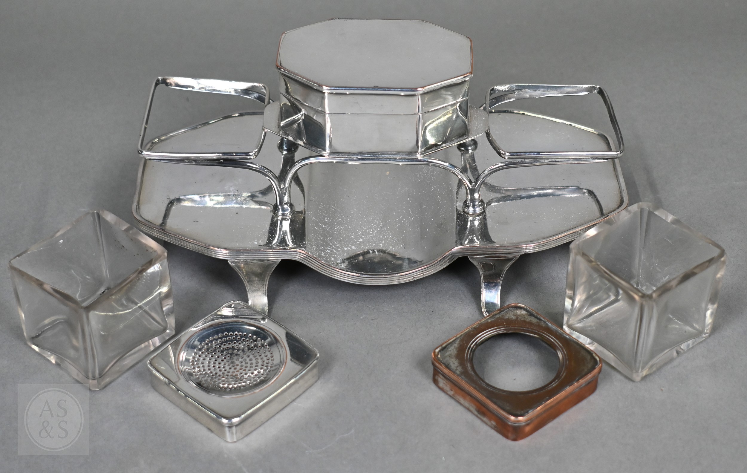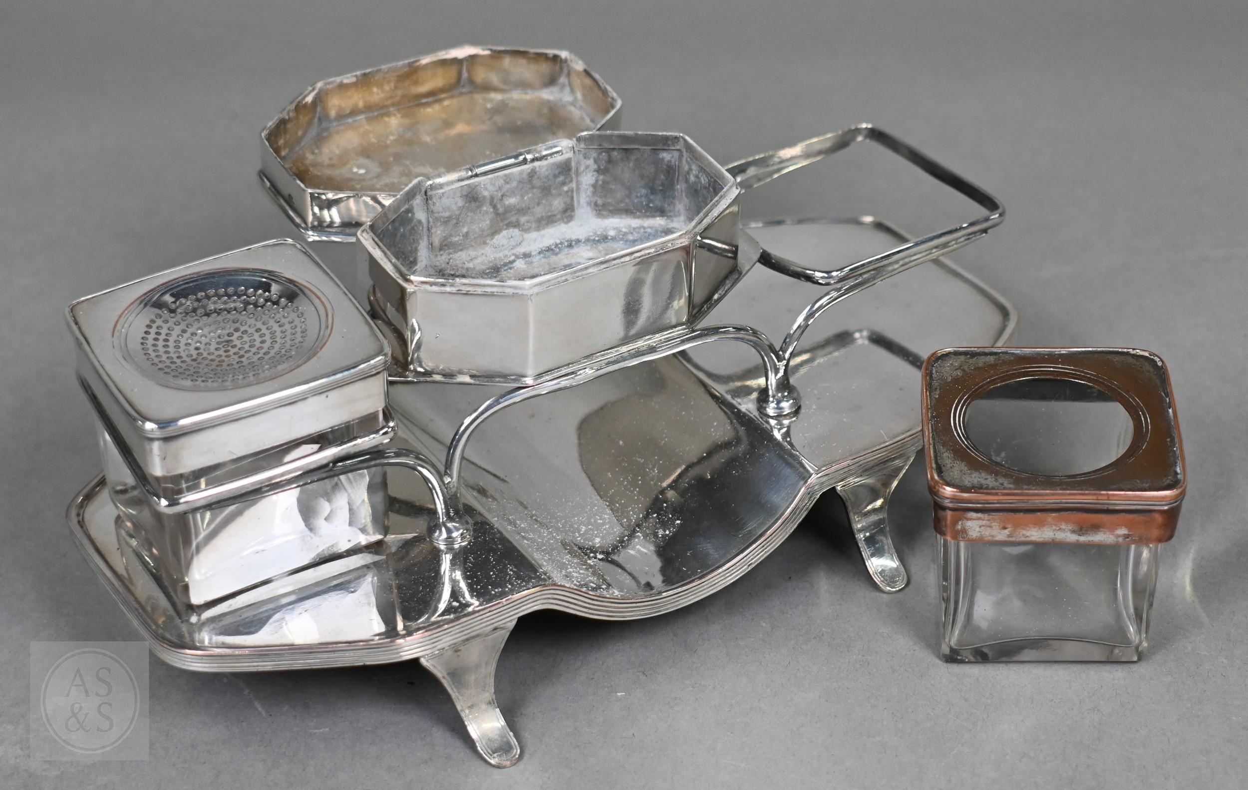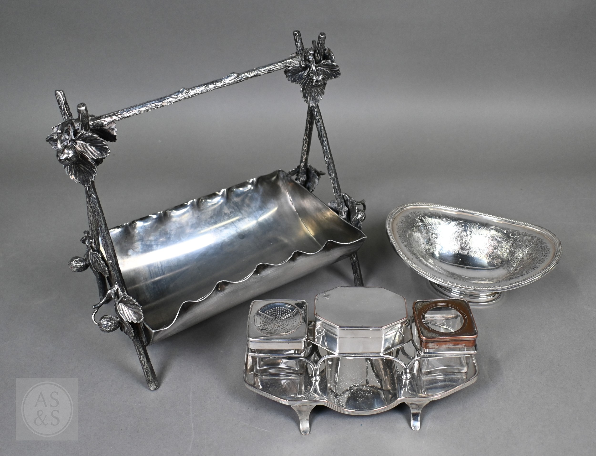 A Regency Old Sheffield Plate desk-stand fitted with nib-box flanked by two square glass pots with metal tops, 20cm wide; lot also includes a Victorian EPBM strawberry basket and a electroplated on copper oval sweetmeat bowl on stemmed foot (3)