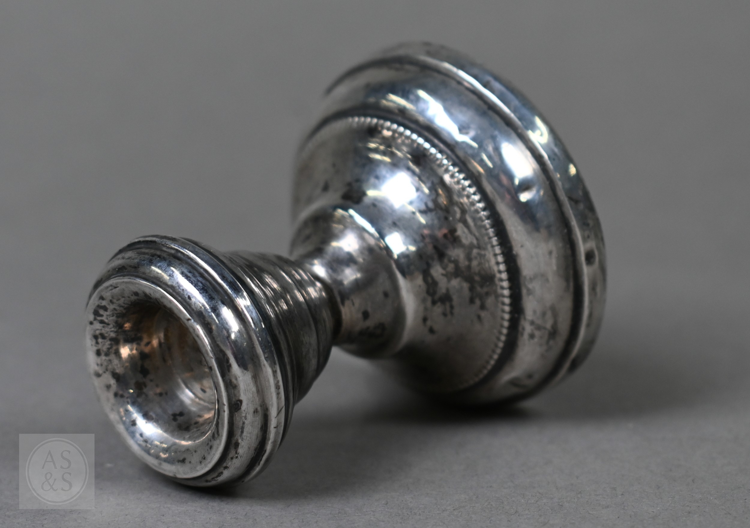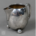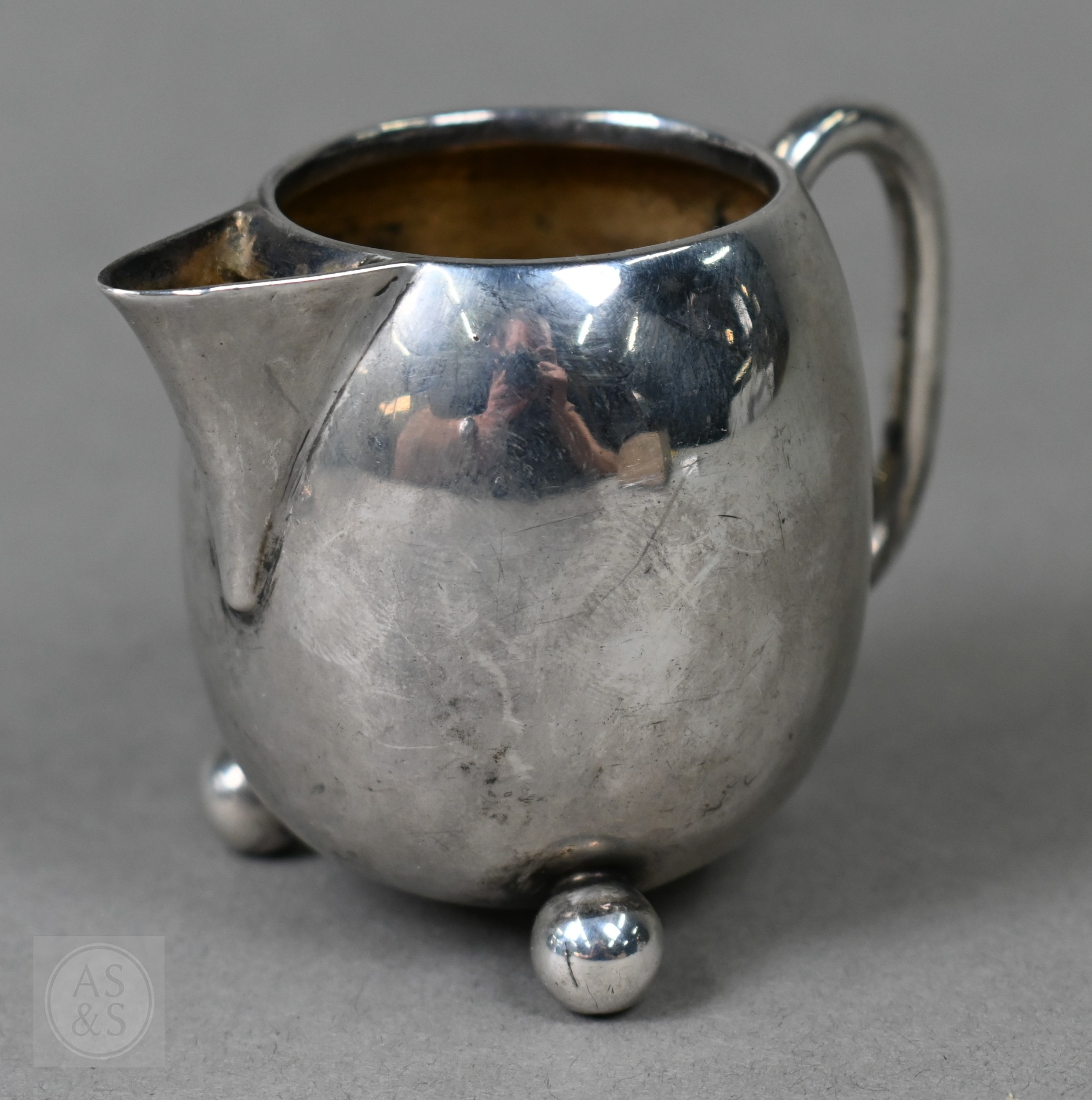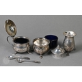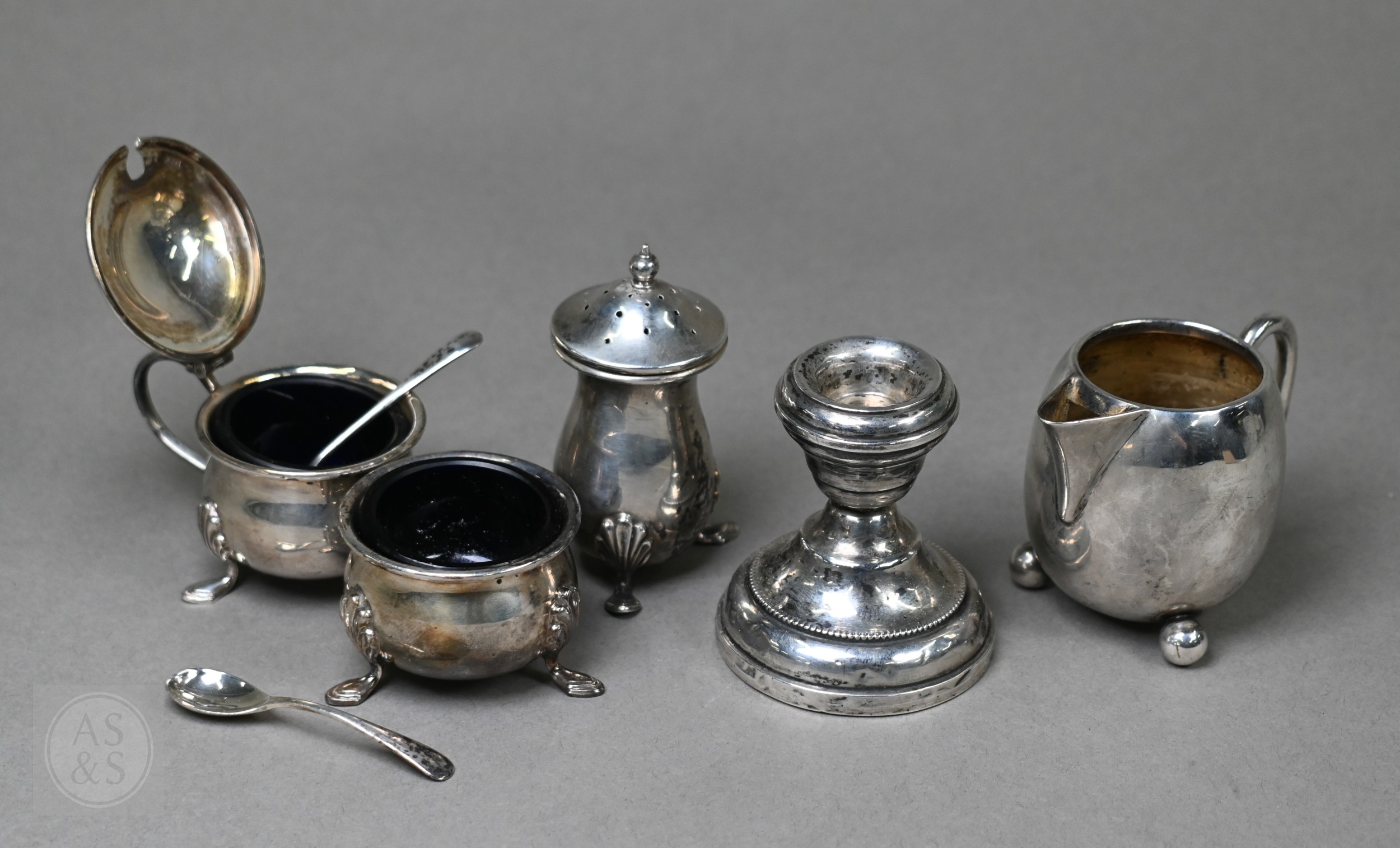 A small Victorian silver ovoid cream jug on ball feet, Charles Boyton II, London 1883, to/w a condiment set on hoof feet, Birmingham 1959 and a small loaded silver candlestick; 6.9oz of weighable silver