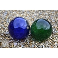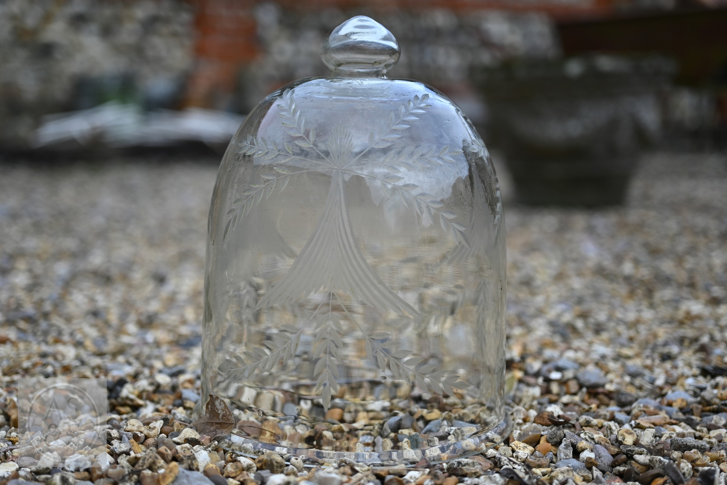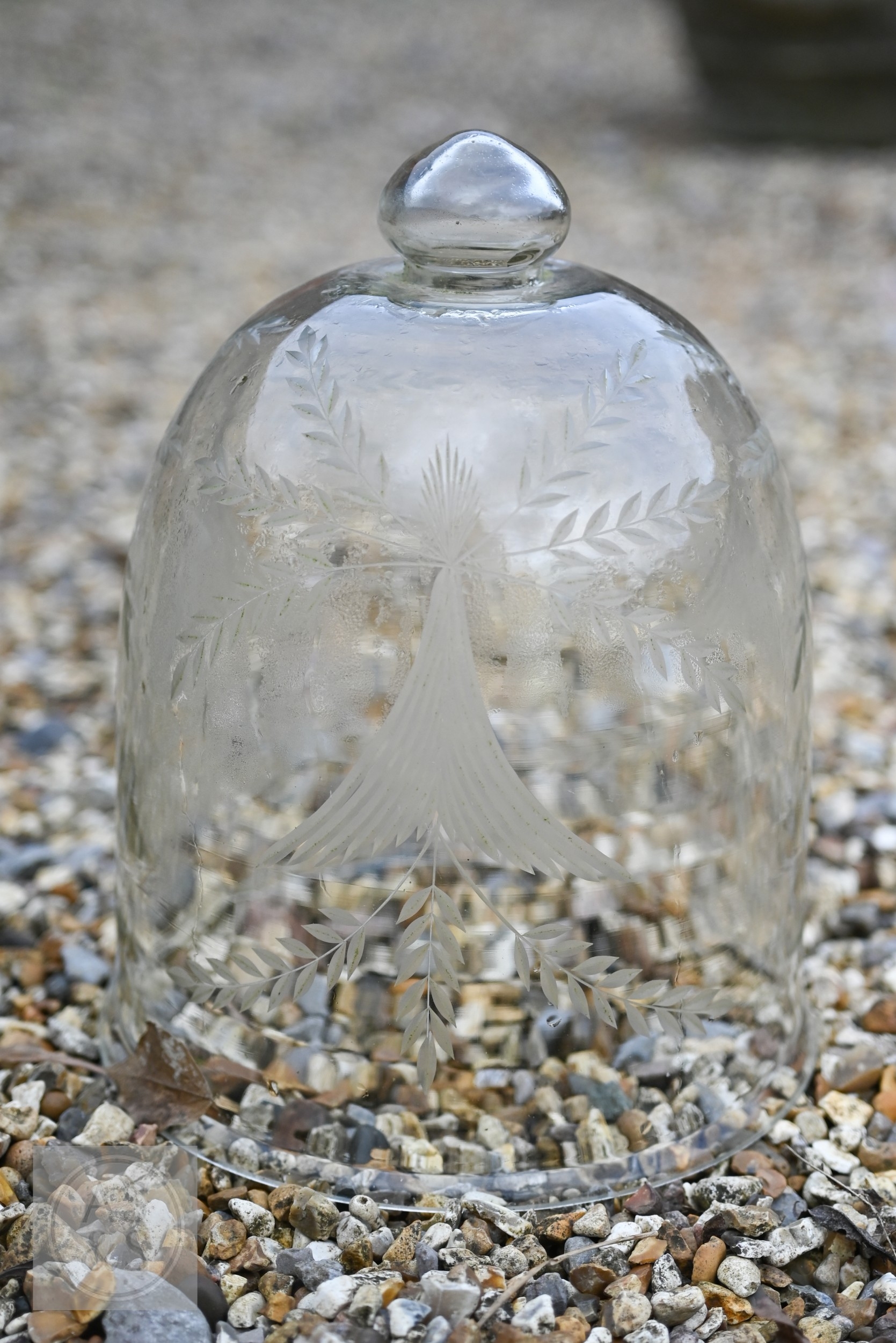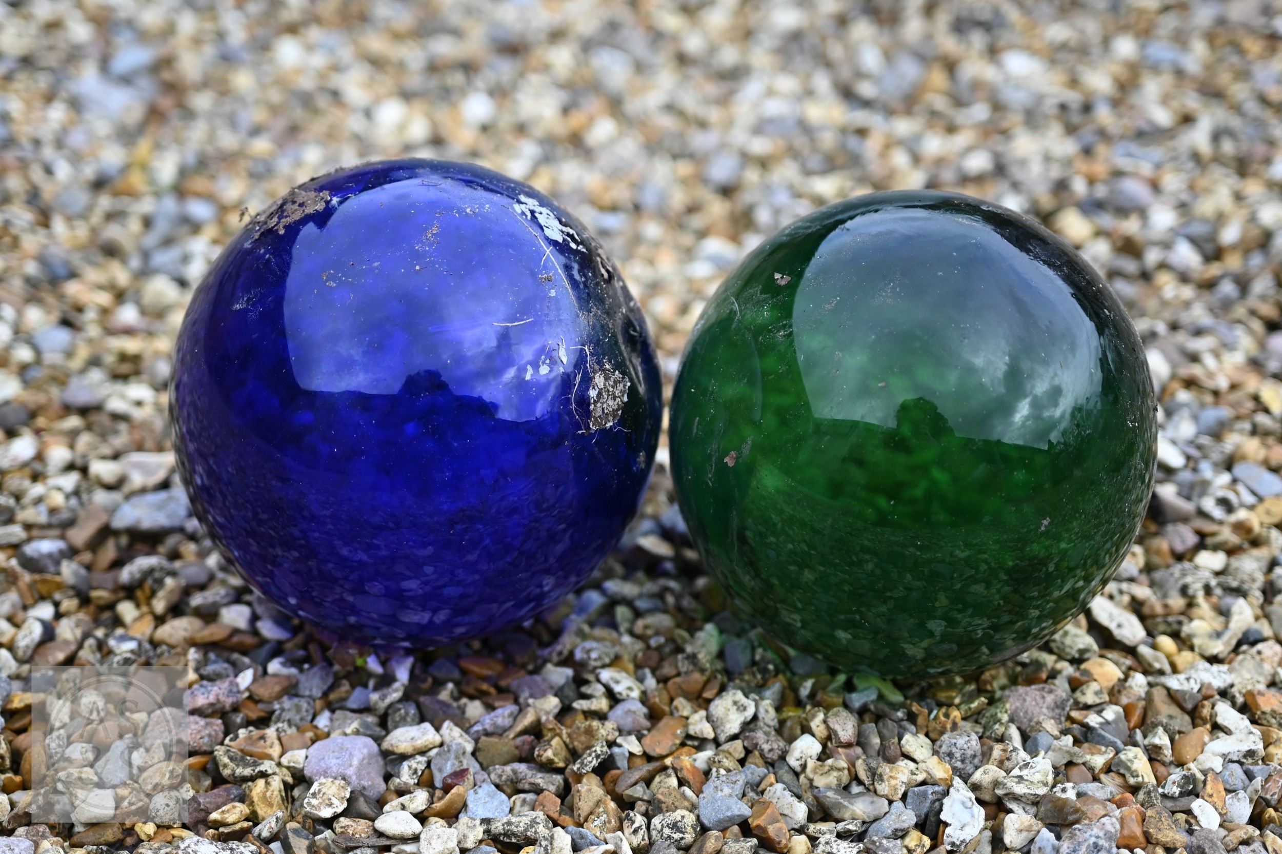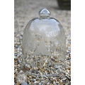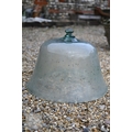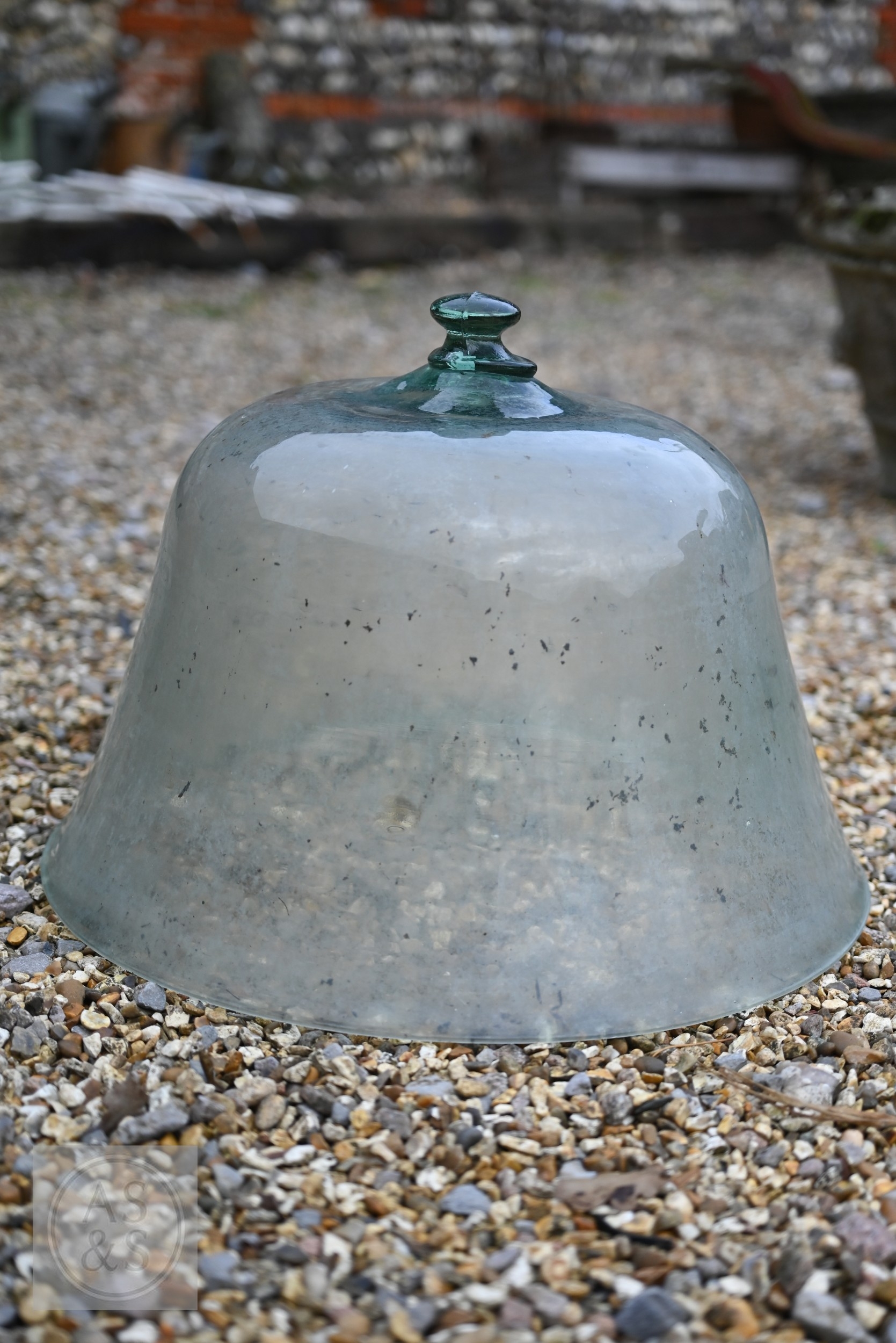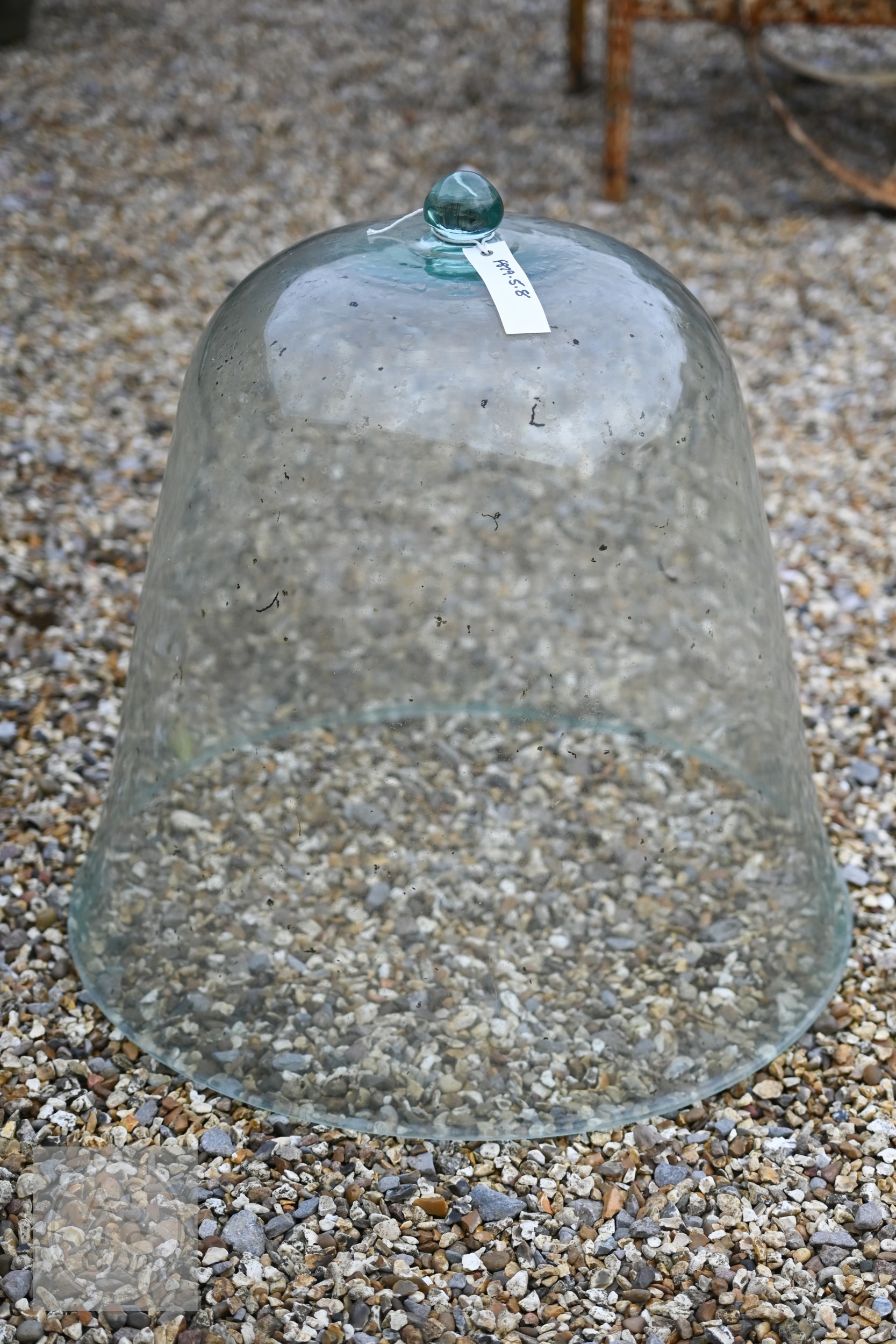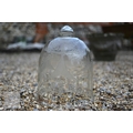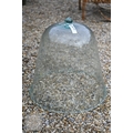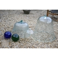 Two large old clear glass garden bell cloches, the largest 45 cm dia. x 48 cm h to/with a smaller etched glass cloche and two coloured glass balls (5)