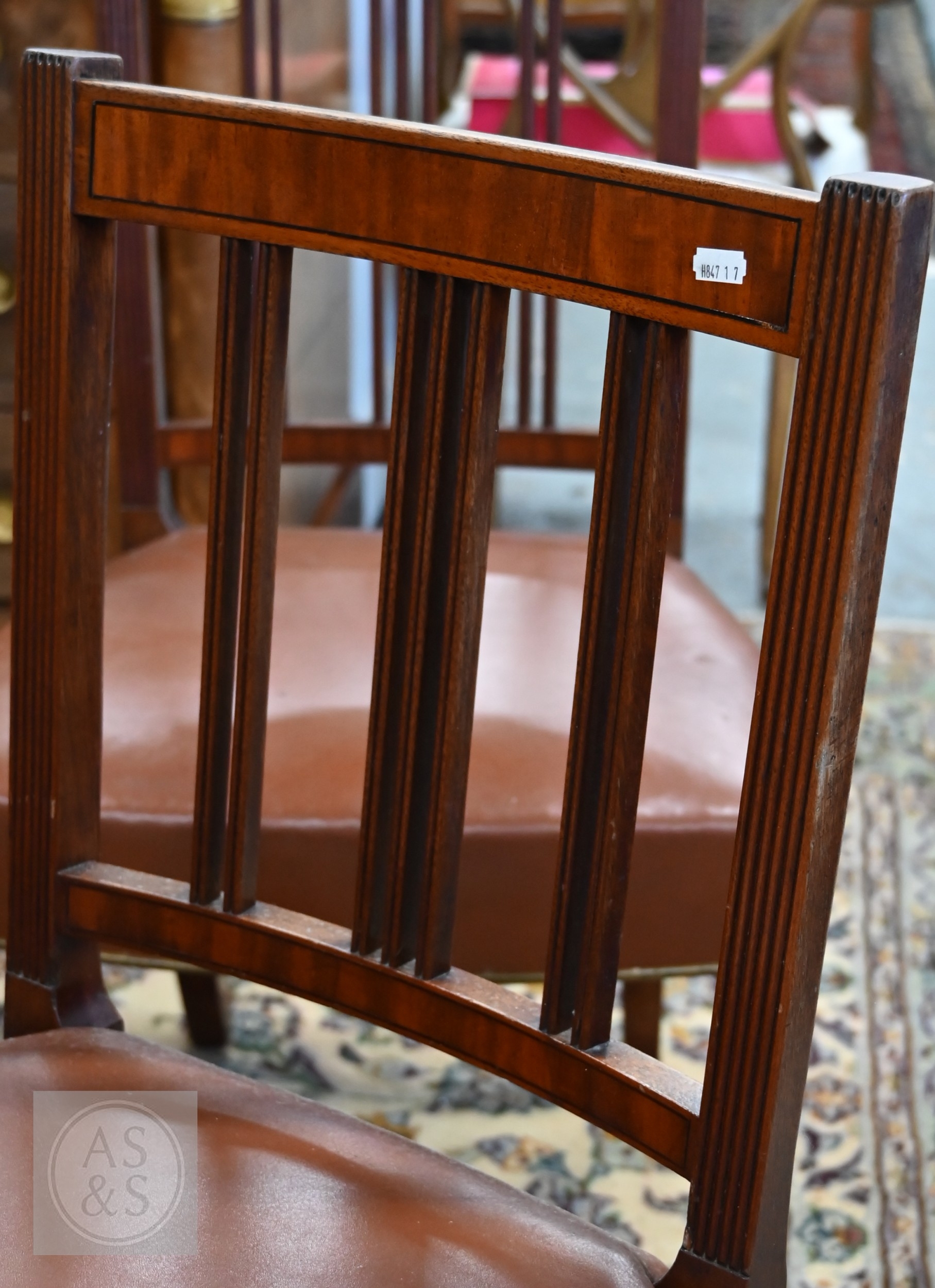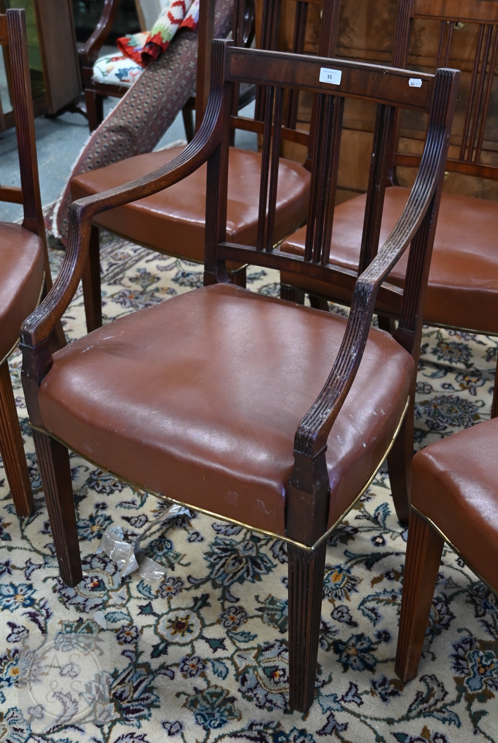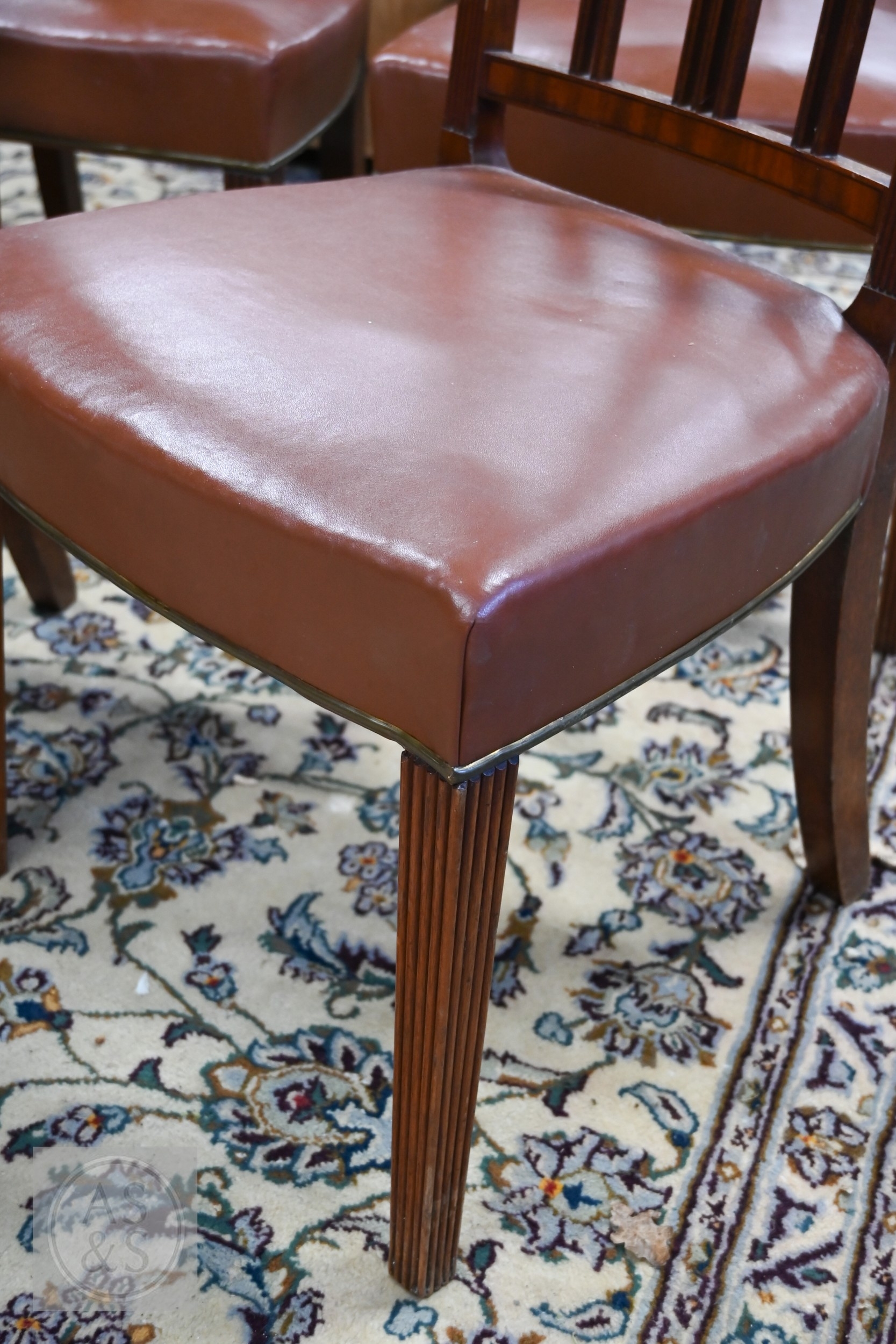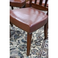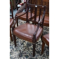A set of six late 19th century refurbished dining chairs, with mid tan leather overstuffed seats with brass edging, raised on moulded square front legs, comprising five side chairs, one carver (6)