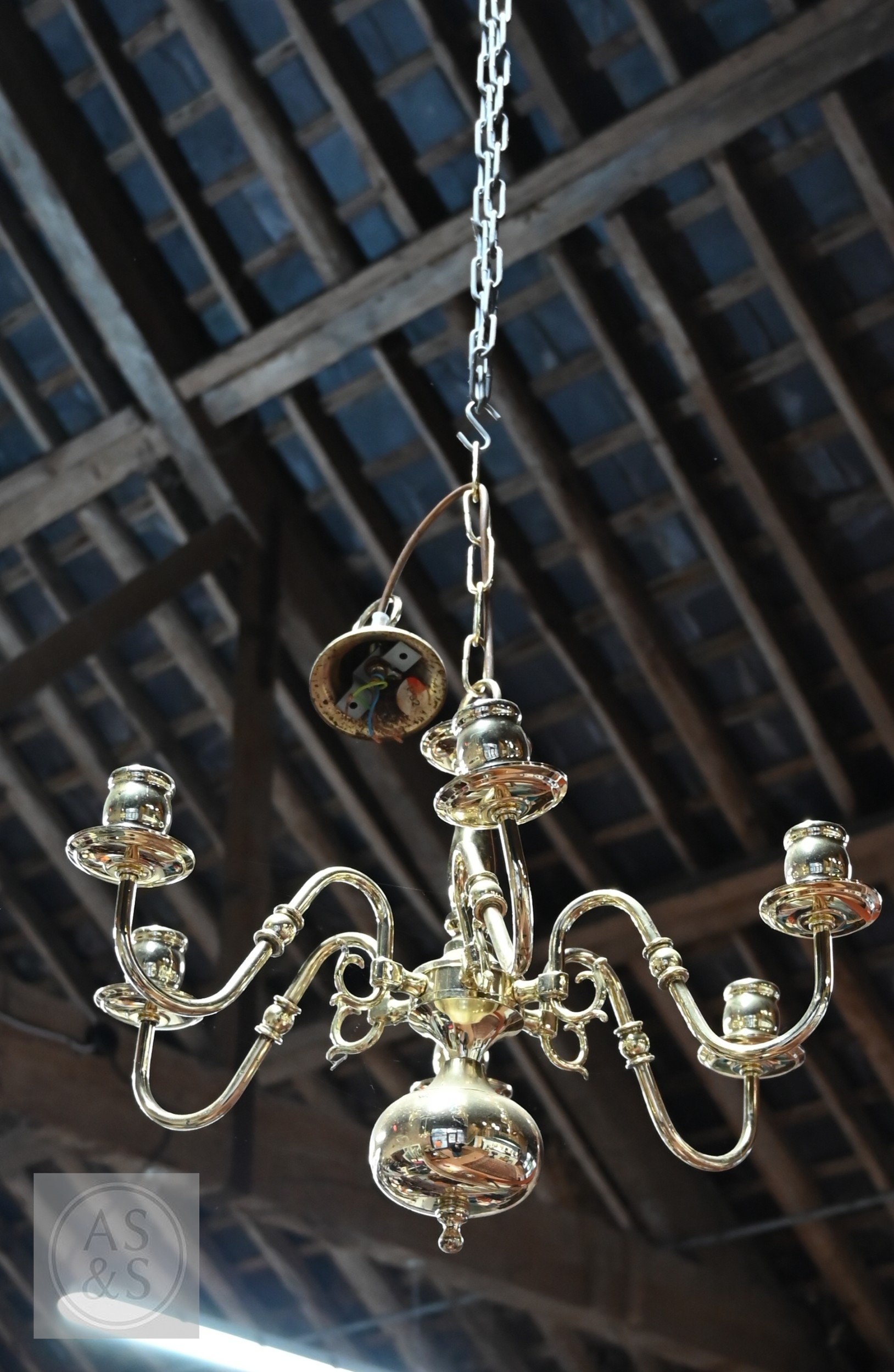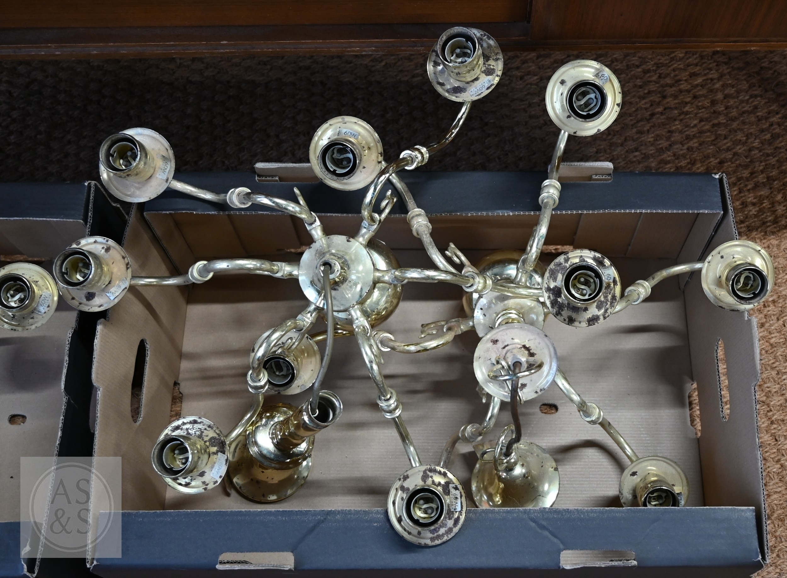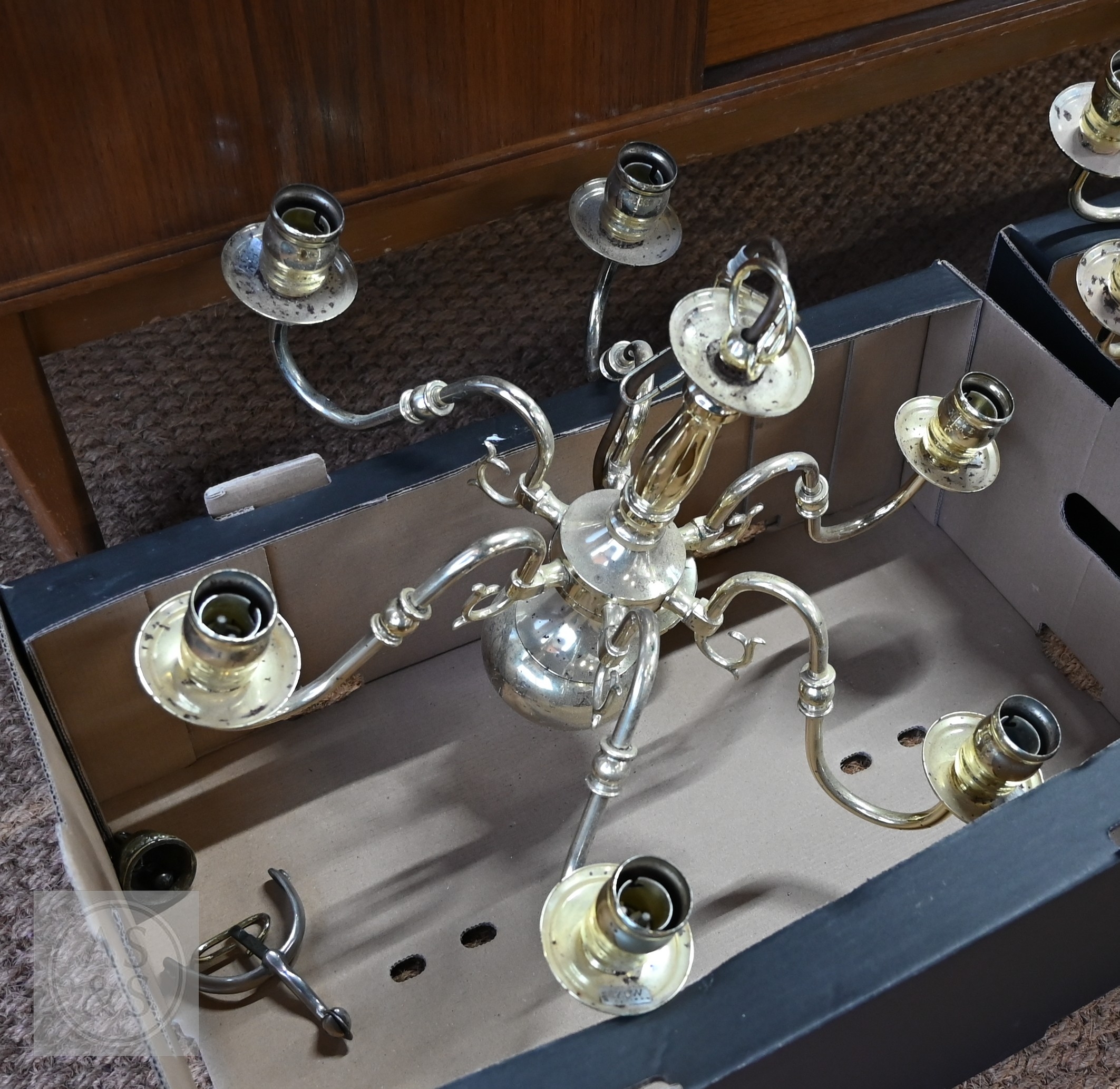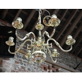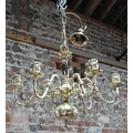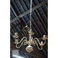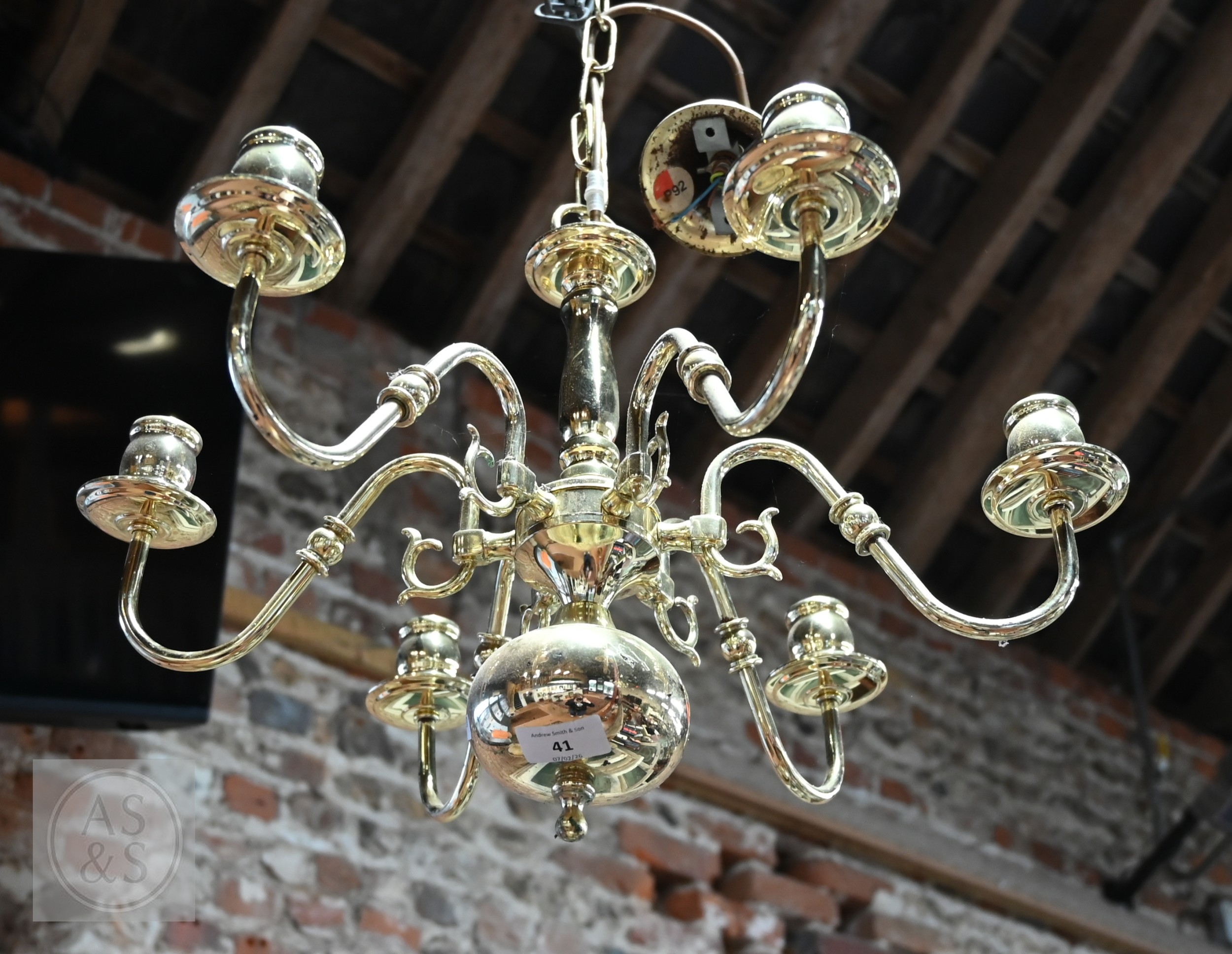 Five Dutch style lacquered brass six branch electroliers, with suspension chains and ceiling roses, approx. 52 cm dia., all a/f