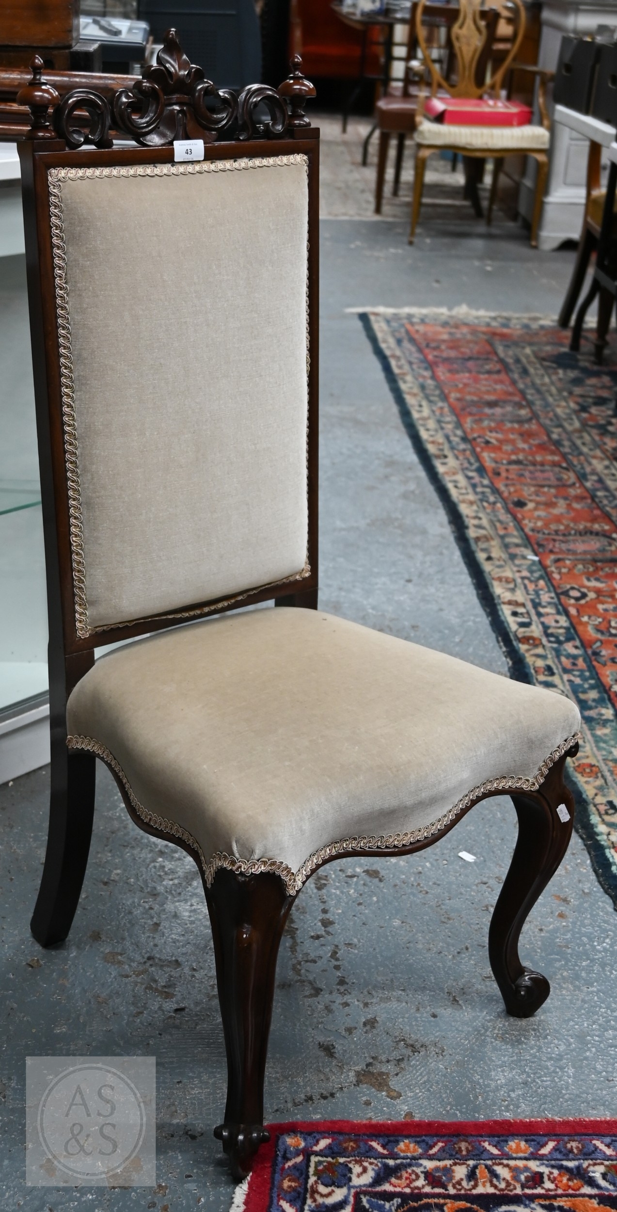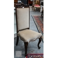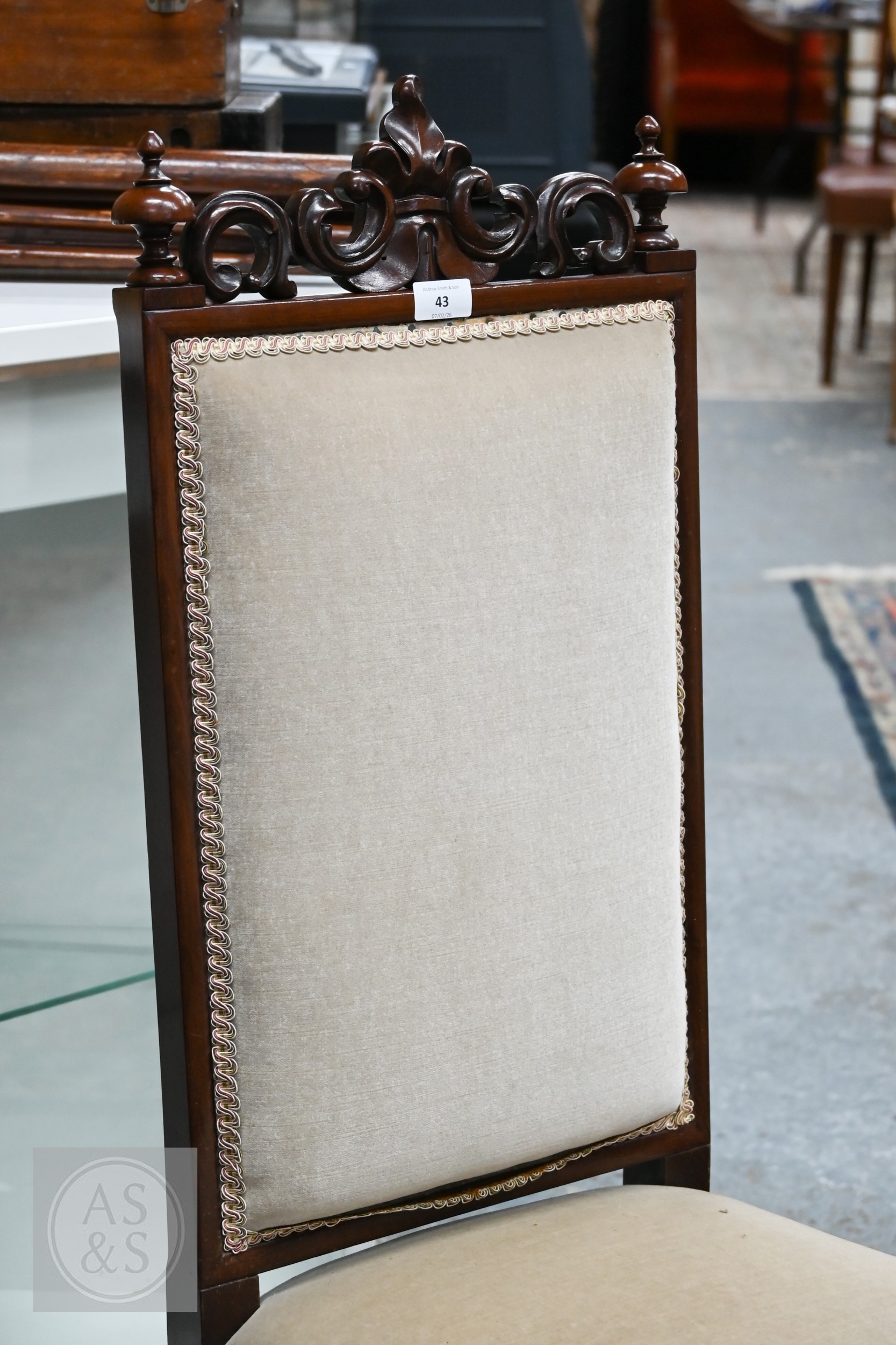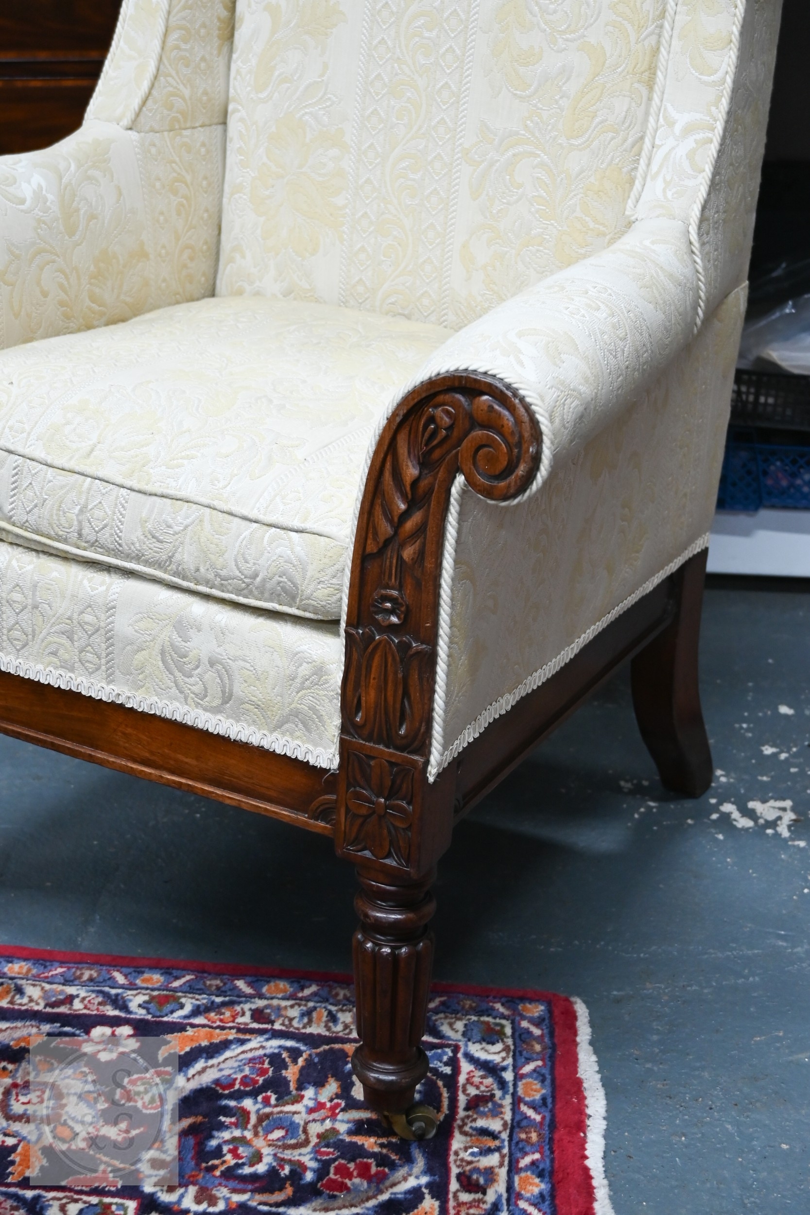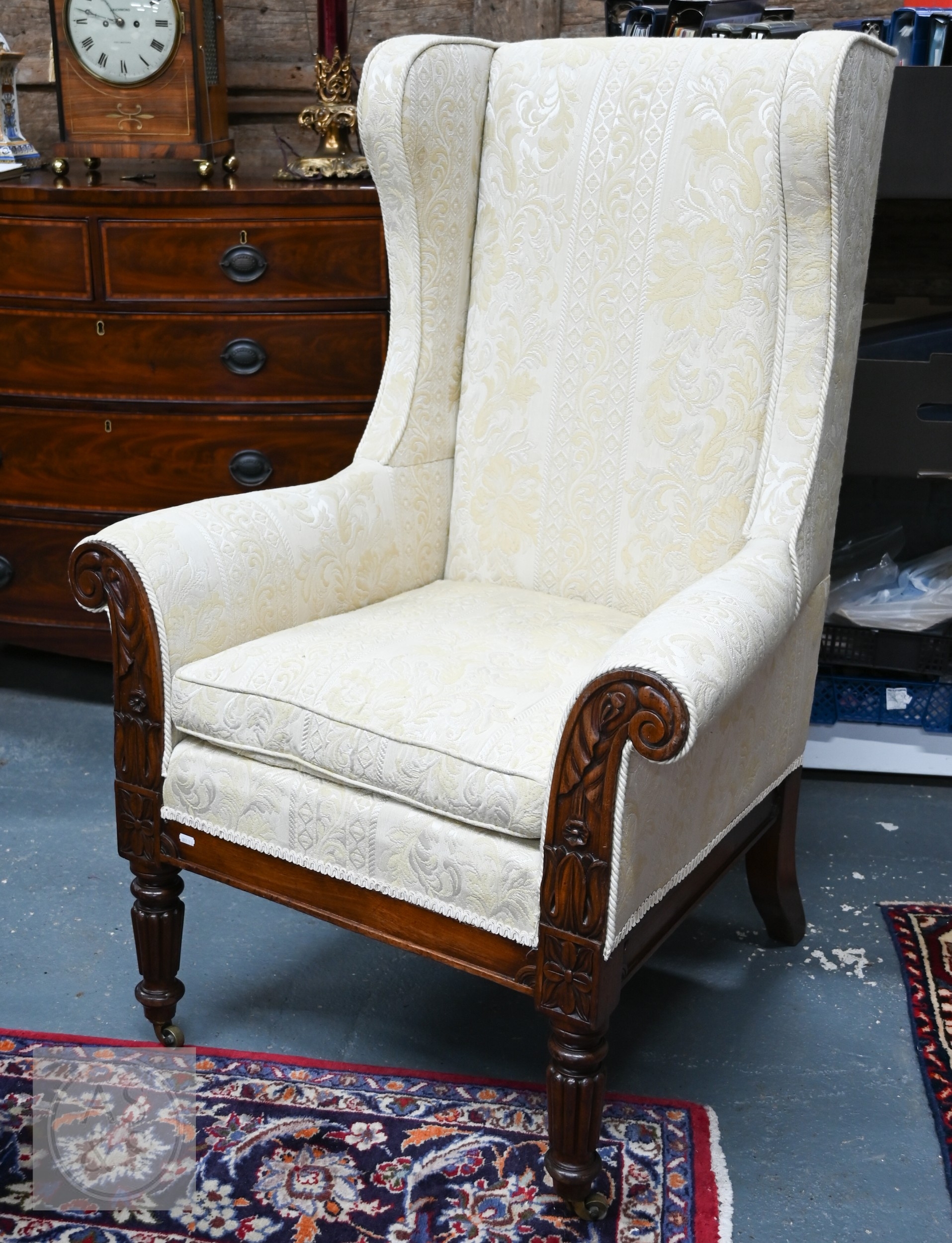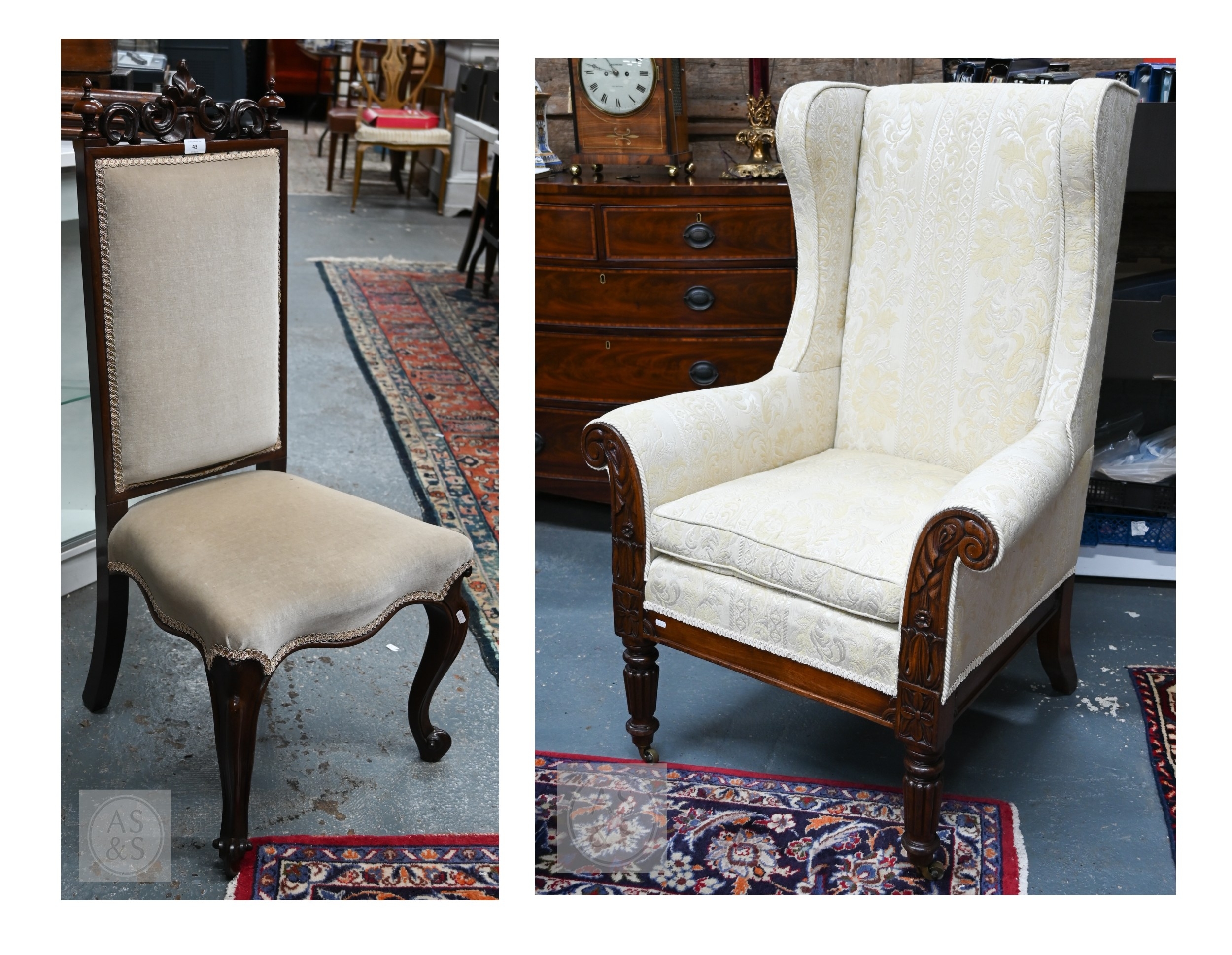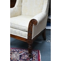 A substantial Victorian moulded mahogany framed wingback armchair, with later cream upholstery, raised on turned gadrooned front legs on brass castors to/with a Victorian cream upholstered mahogany framed side chair (2)