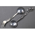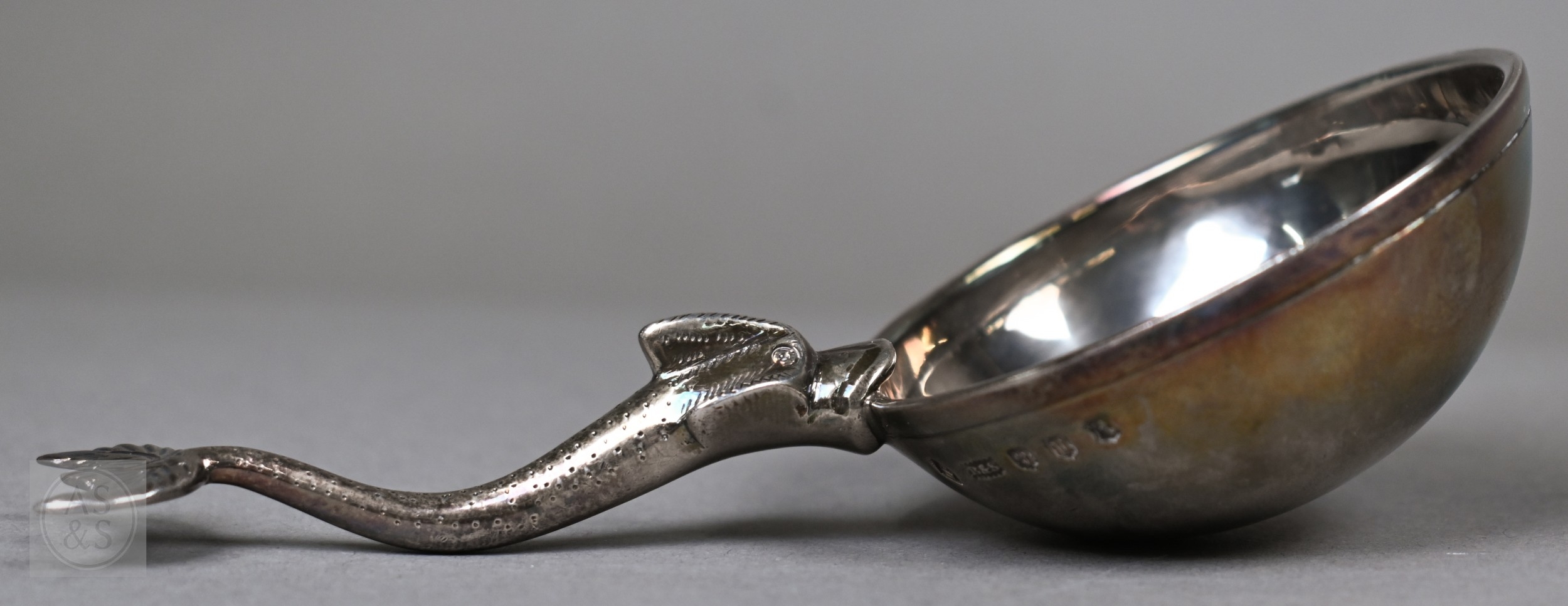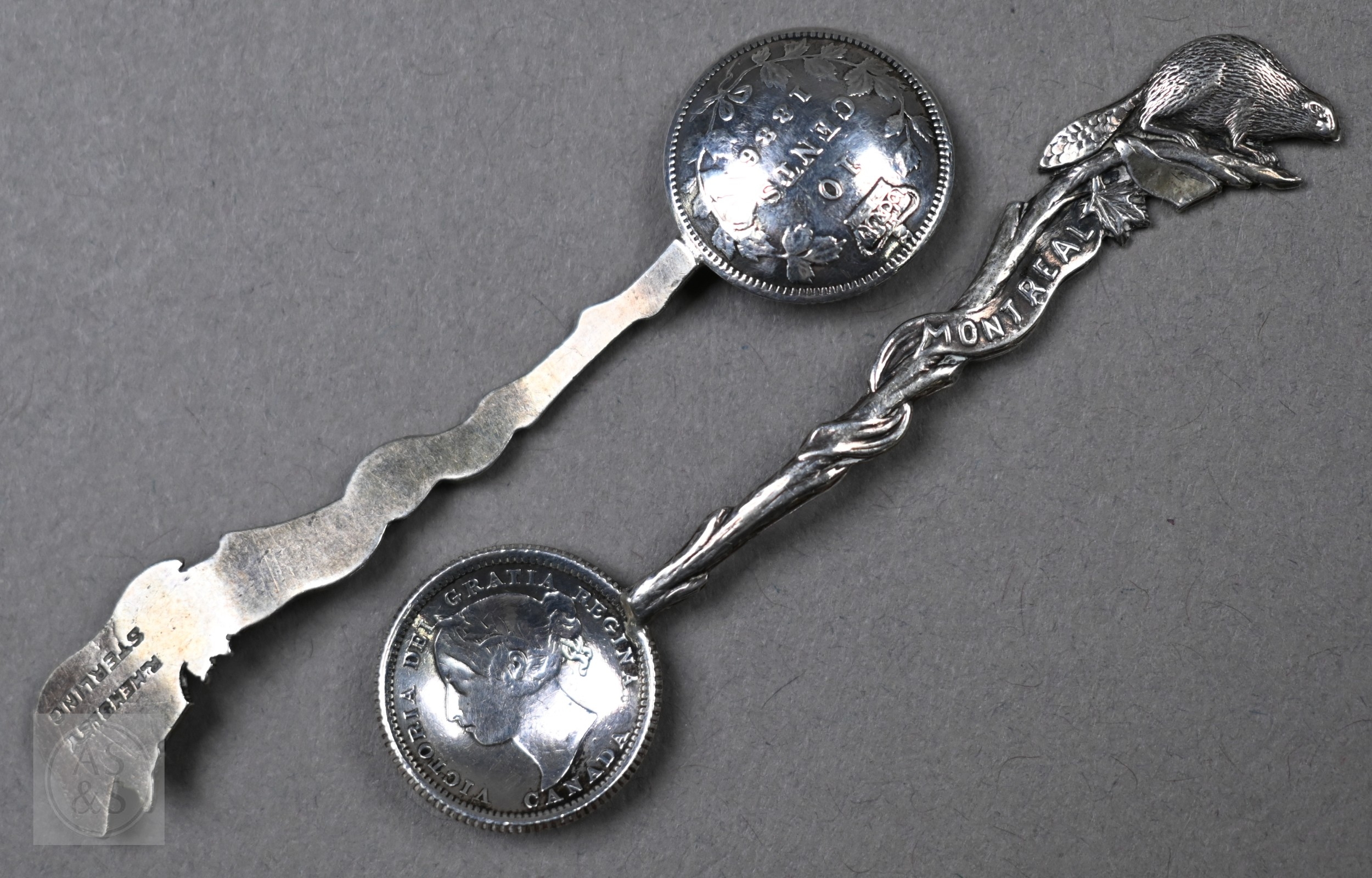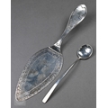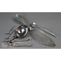 A Swedish .830 grade pastry slice with bright-cut blade, to/w a pair of Tiffany & Co. Sterling patt. 1899 sugar tongs, a pair of Victorian Canadian Hemsley Sterling salt spoons with 10 cent coin bowls and beaver finials; lot also includes a Scottish silver Traprain ladle with fish handle, Brook & Son, Edinburgh 1922 and an Arts & Crafts preserve spoon, John Grinsell & Sons, Birmingham 1914 (6), 7.4oz all in