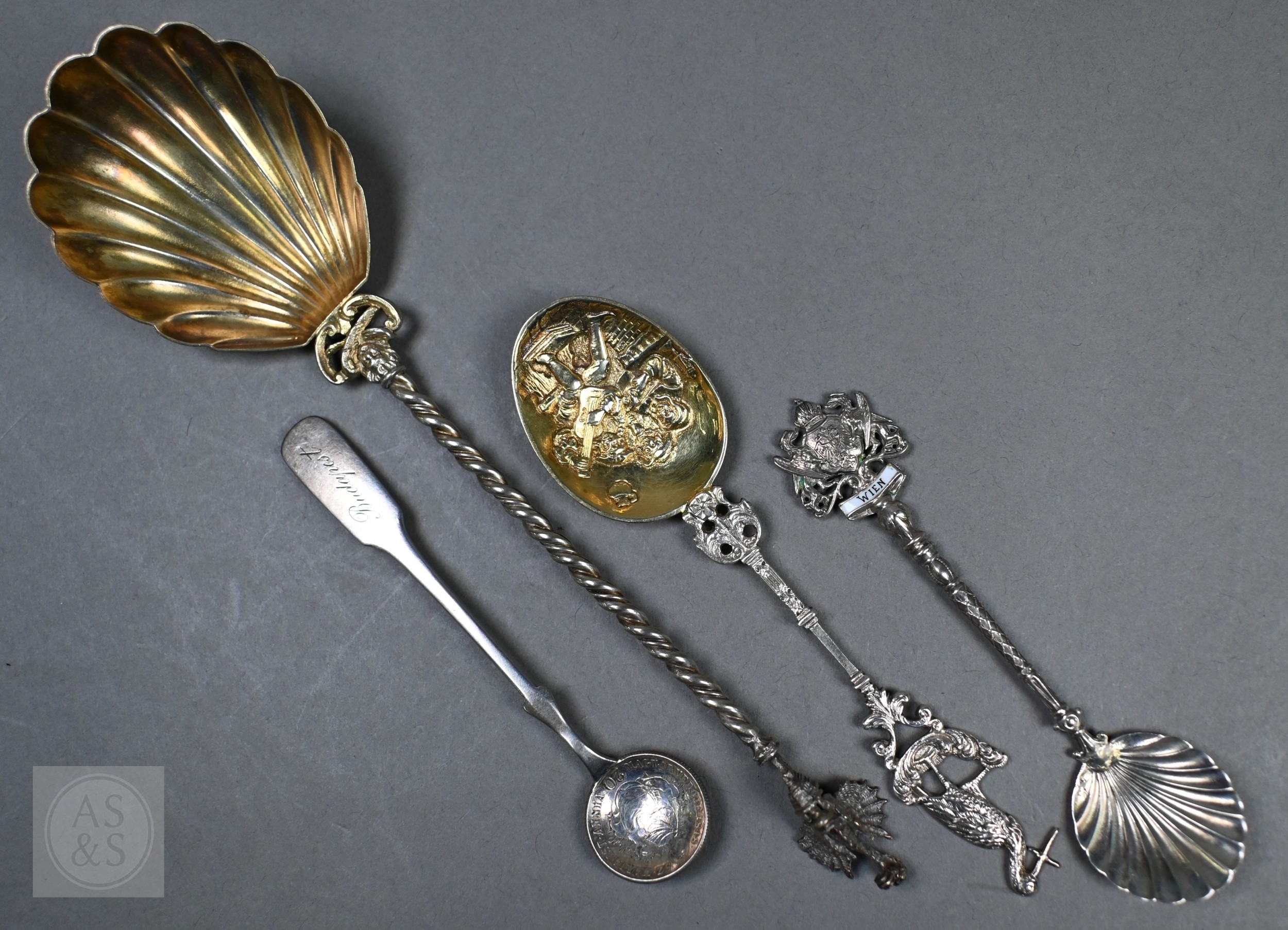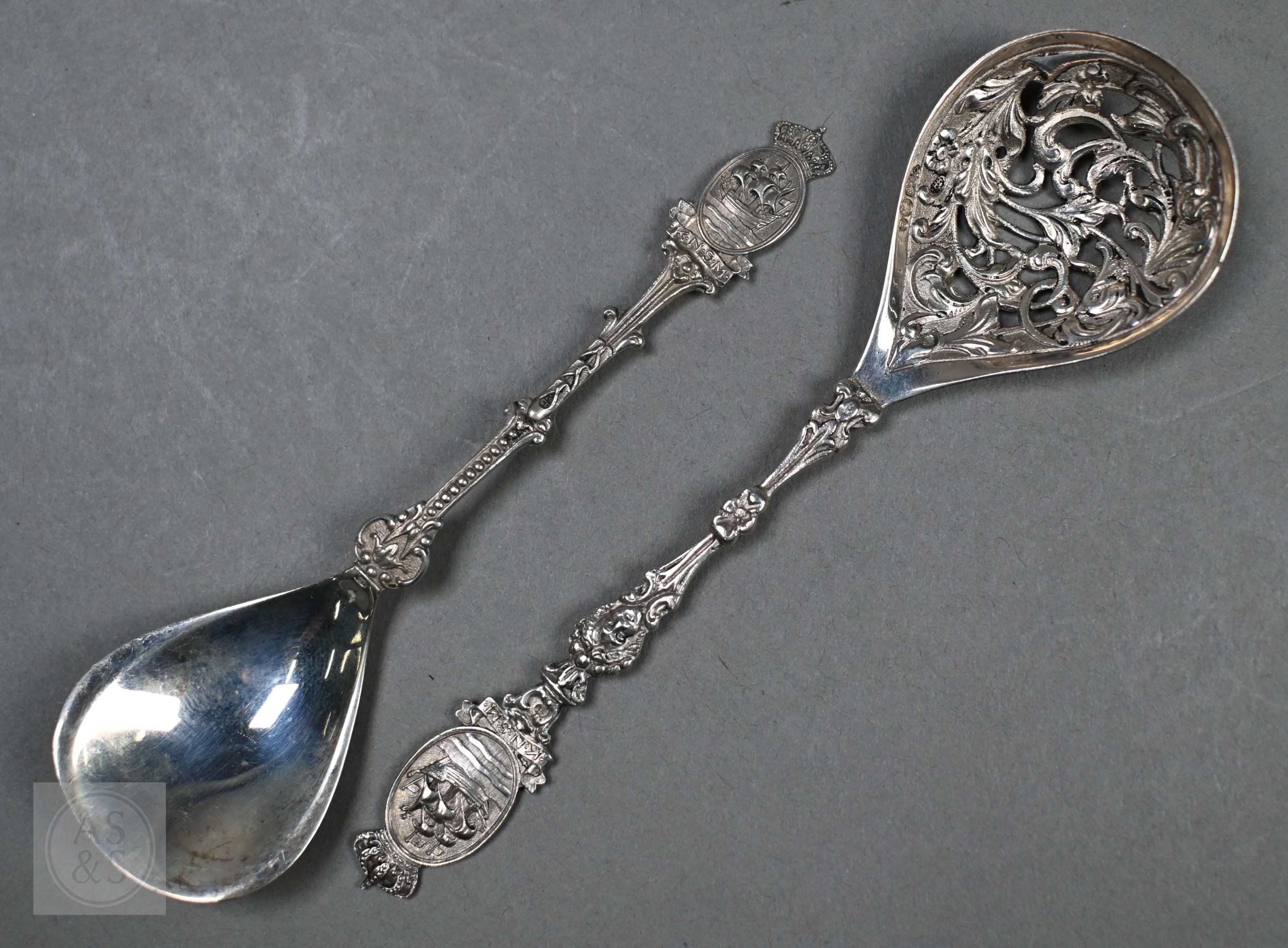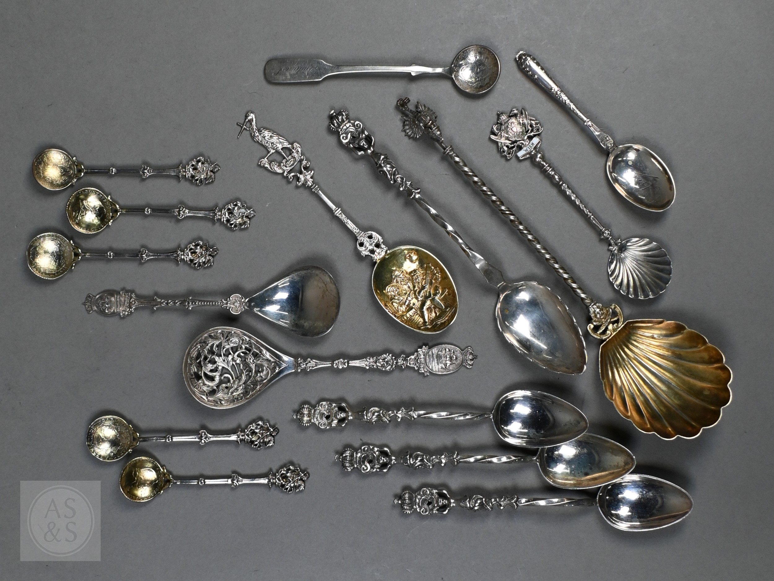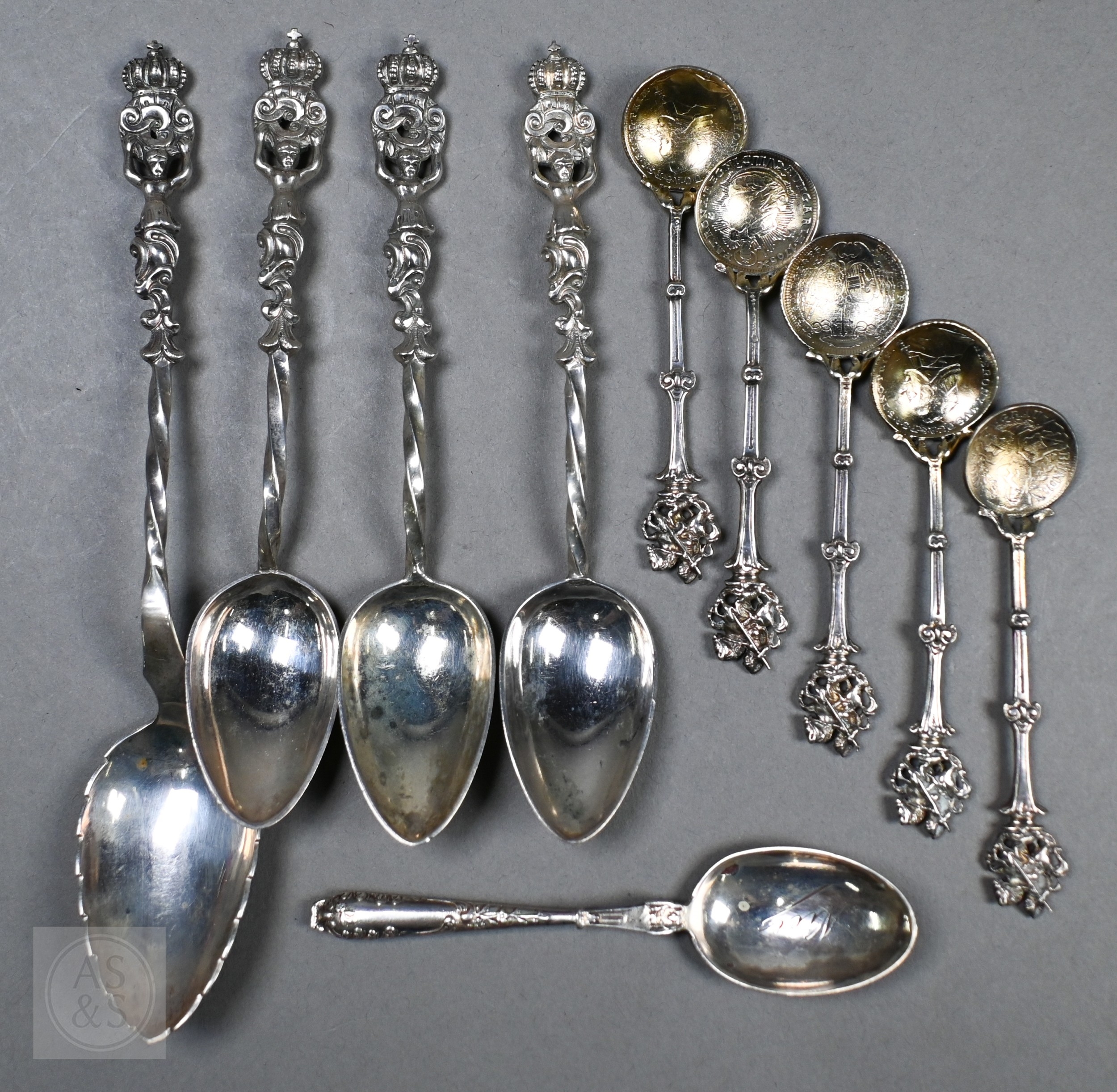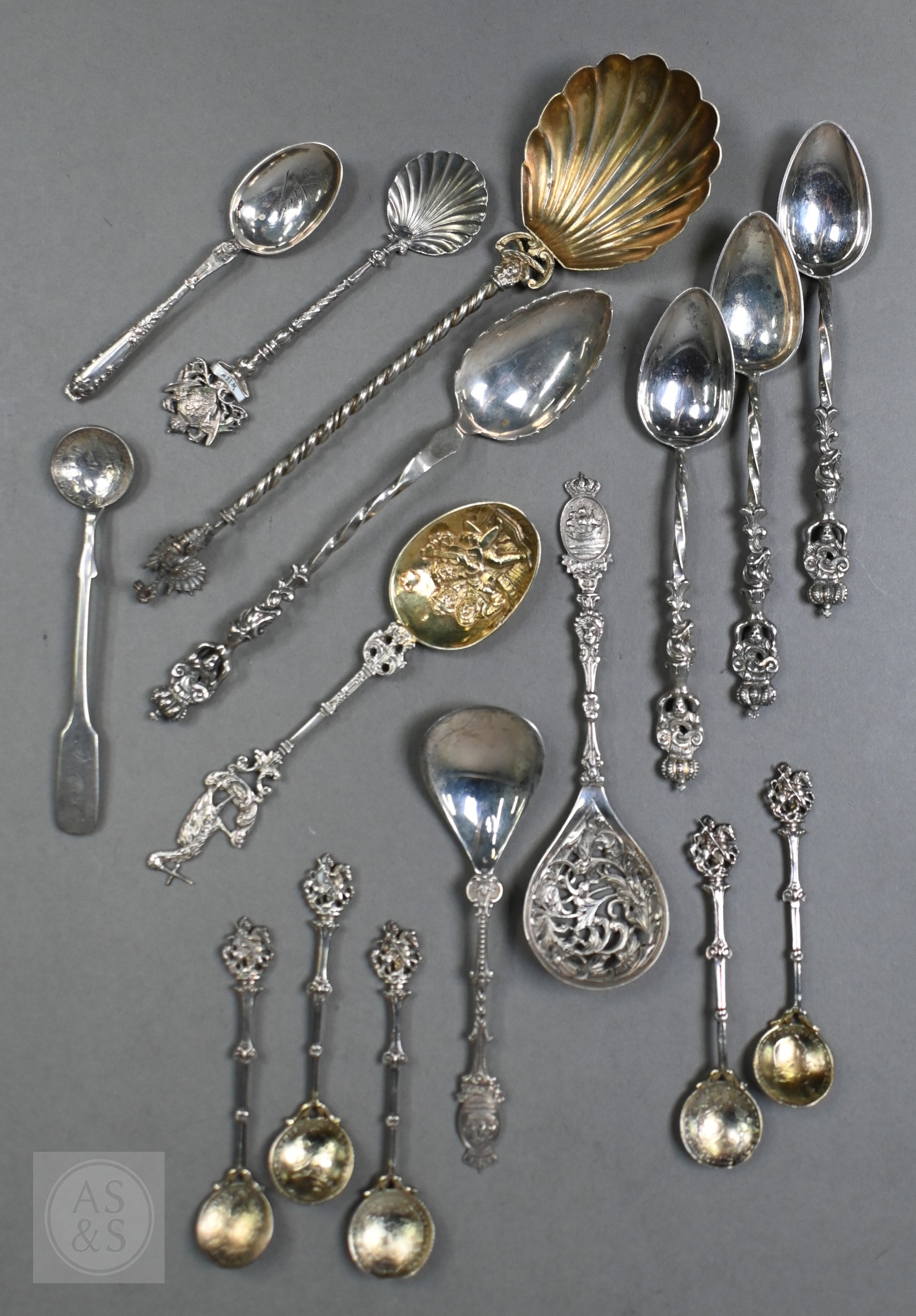 Various antique Continental silver and unmarked white metal decorative spoons, 9.8oz