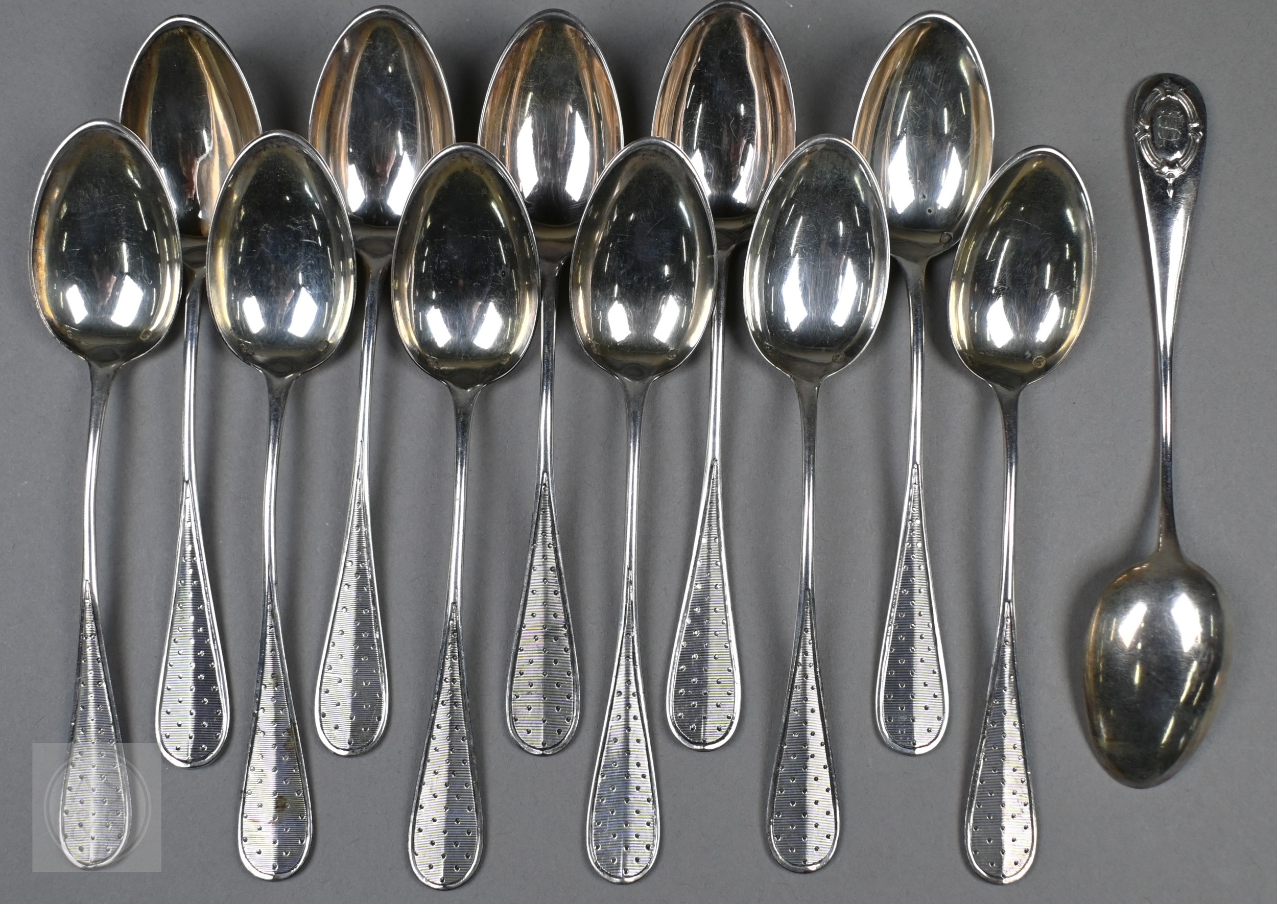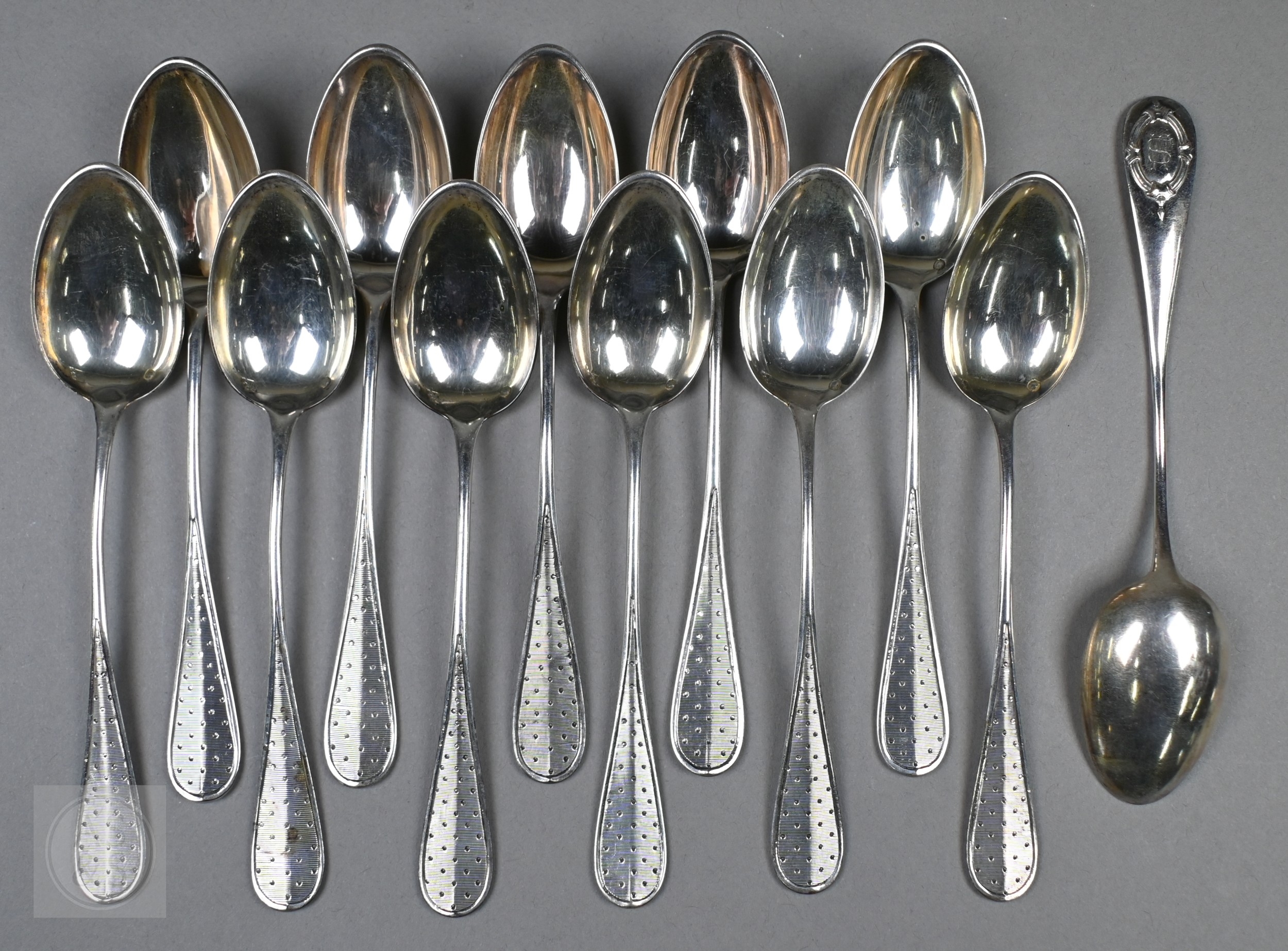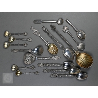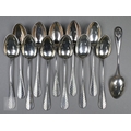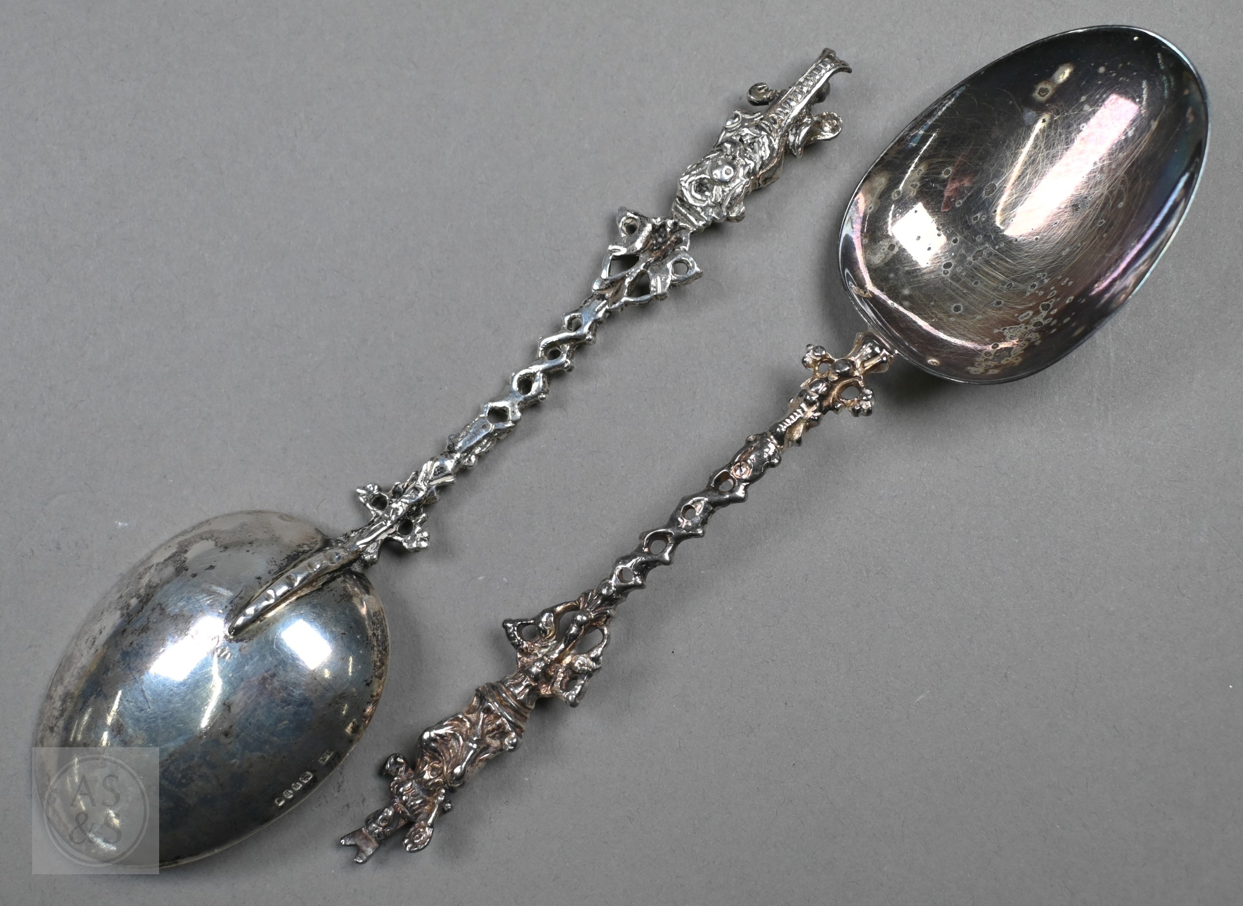 A pair of Continental silver cabinet spoons, the ornate cast stems with seated figure finials, London import 1892, 4ozt, 19cm long, to/w a set of twelve French .800 grade teaspoons with engraved stems, 7.2 ozt (14)