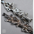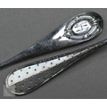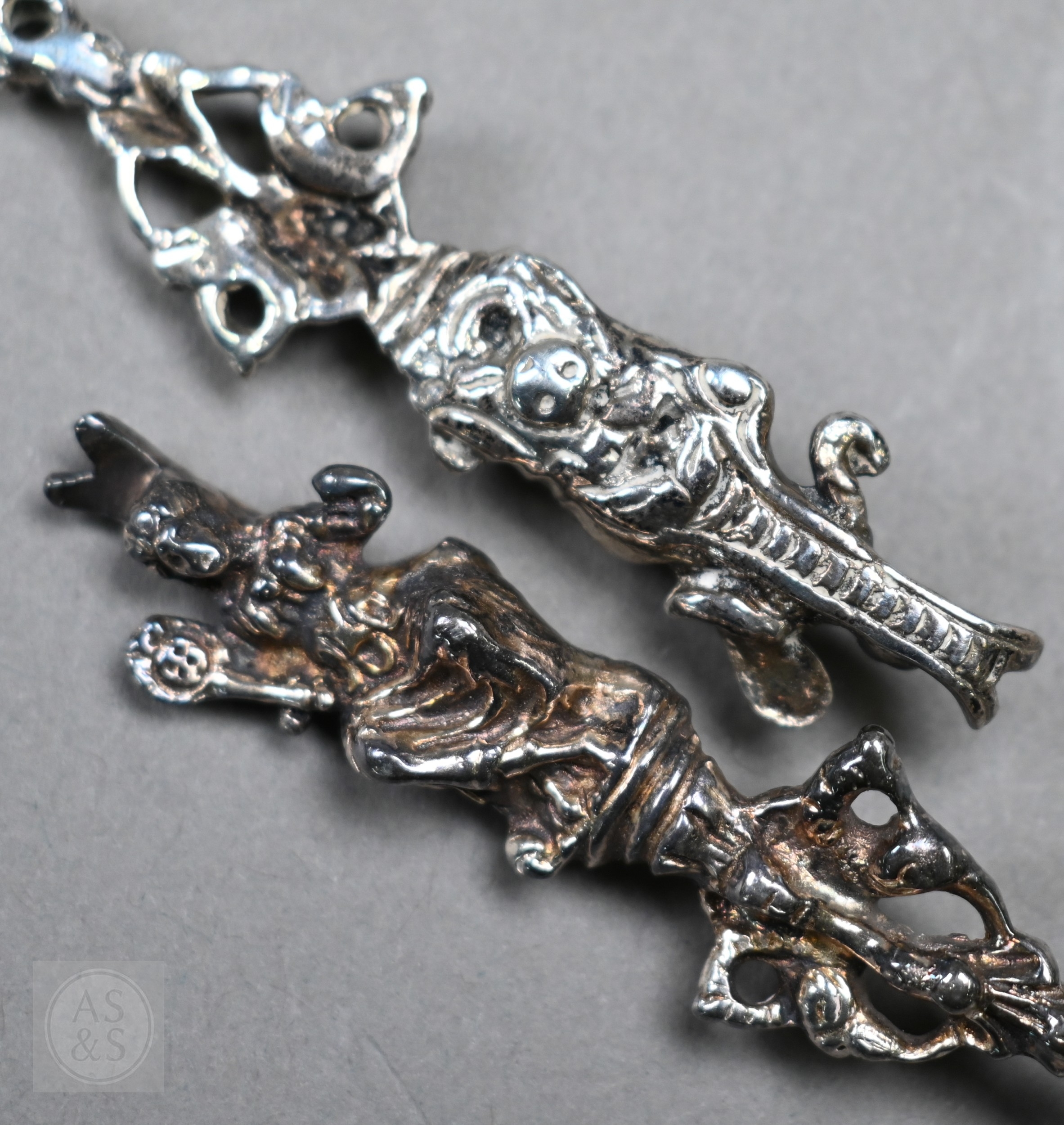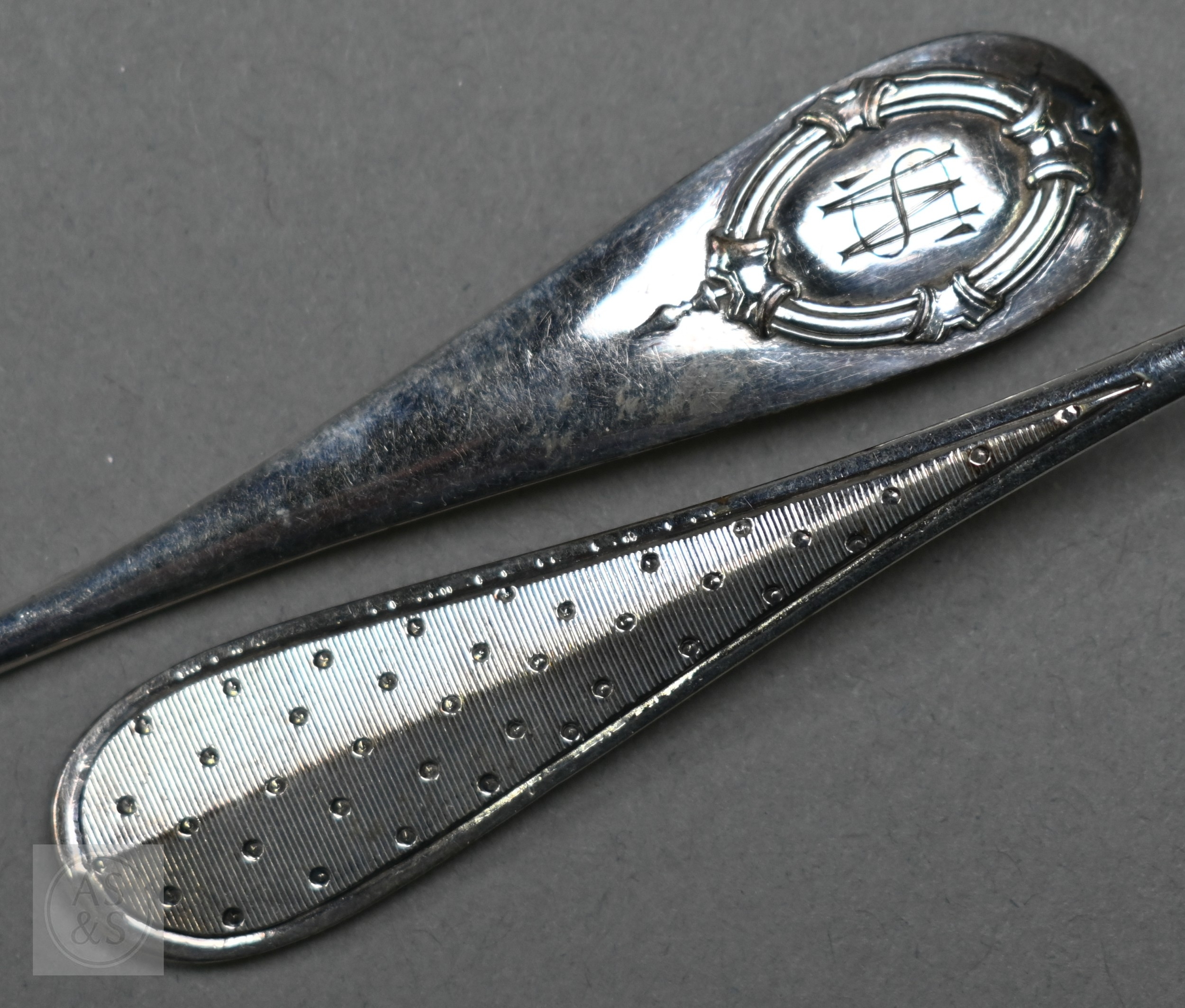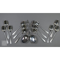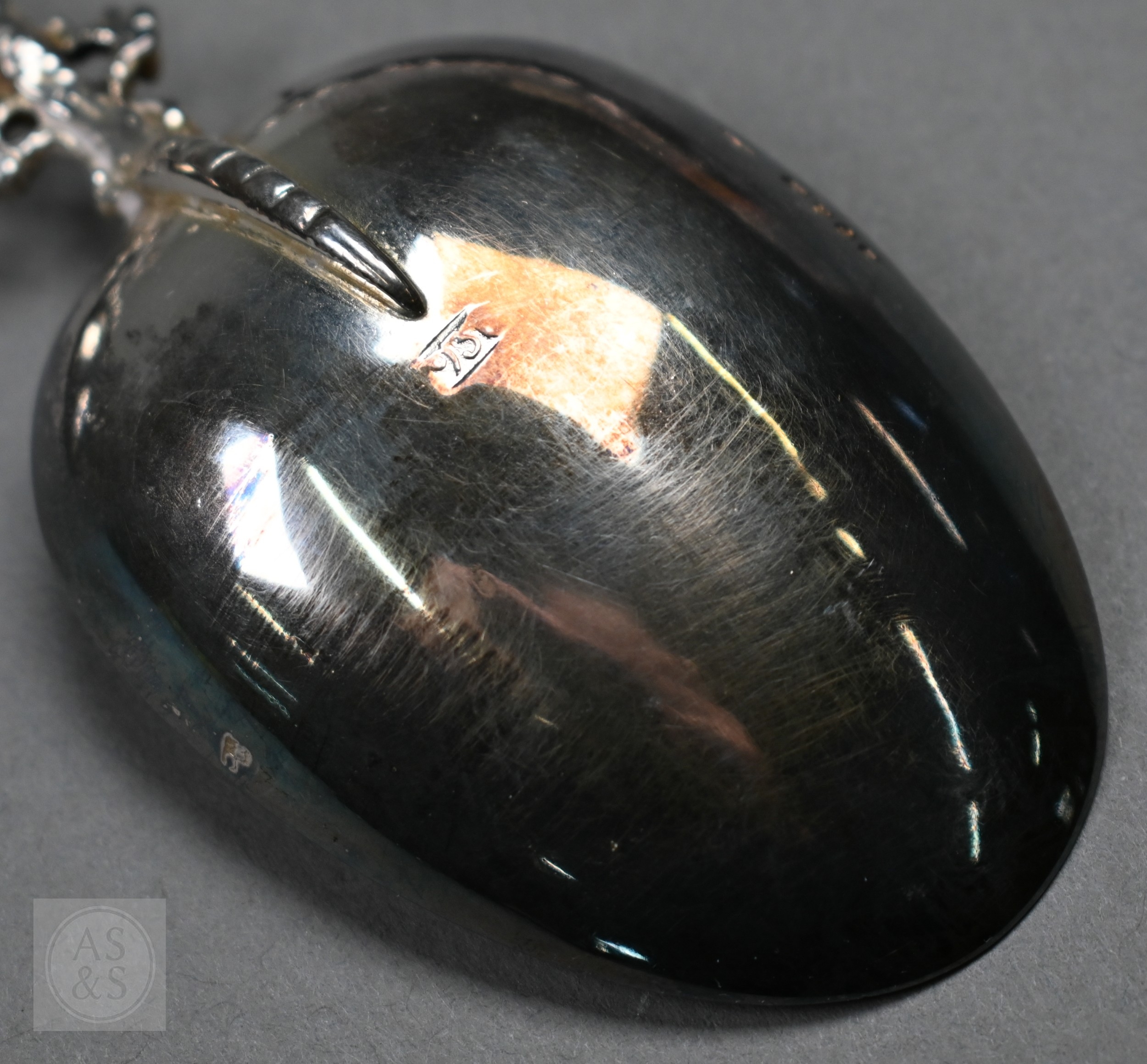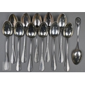 A pair of Continental silver cabinet spoons, the ornate cast stems with seated figure finials, London import 1892, 4ozt, 19cm long, to/w a set of twelve French .800 grade teaspoons with engraved stems, 7.2 ozt (14)