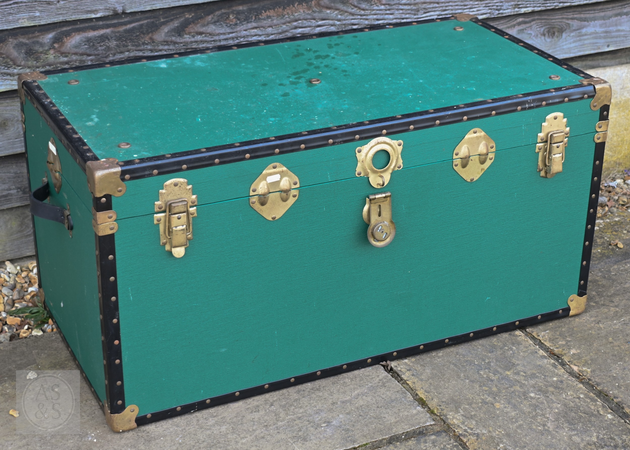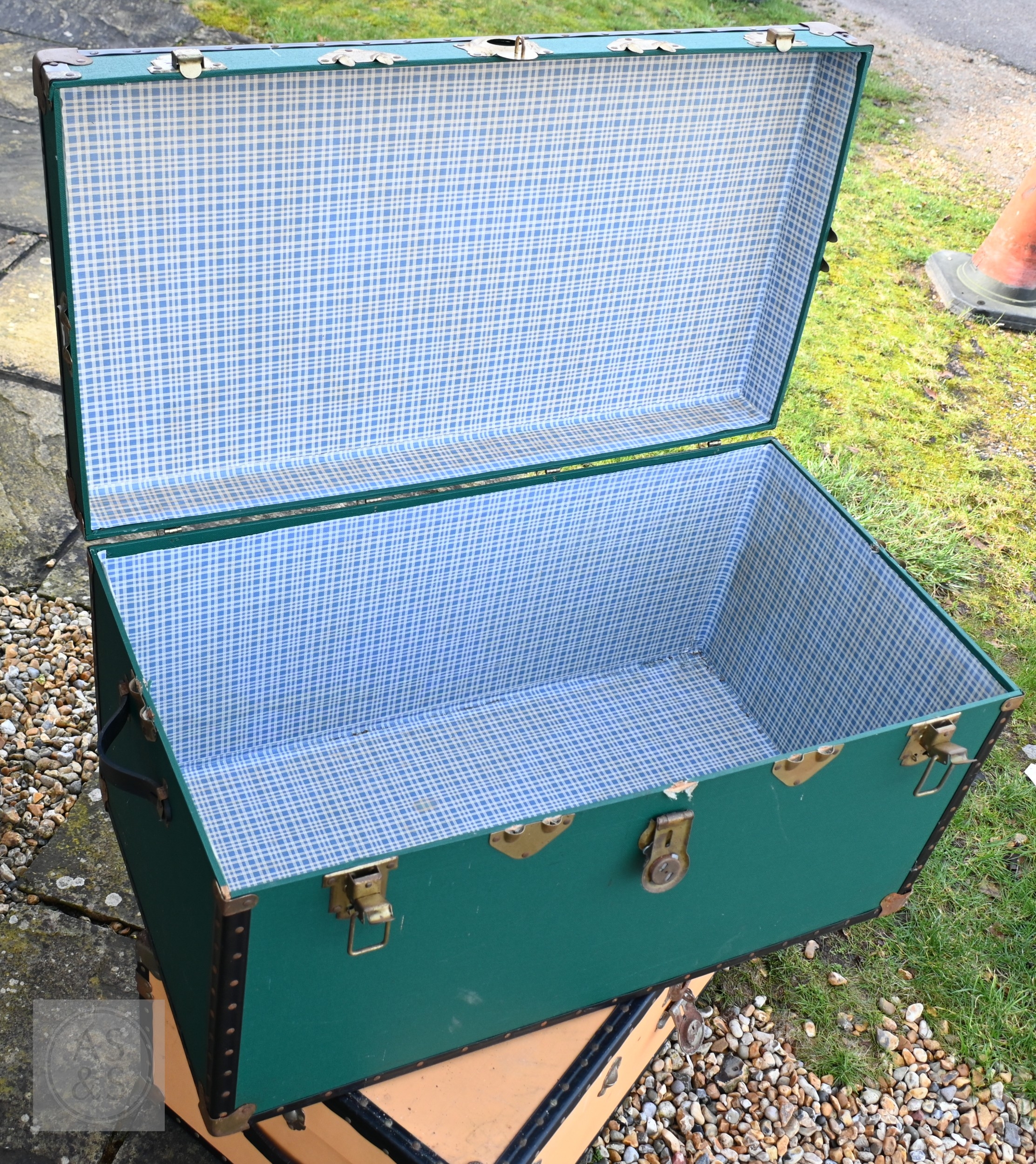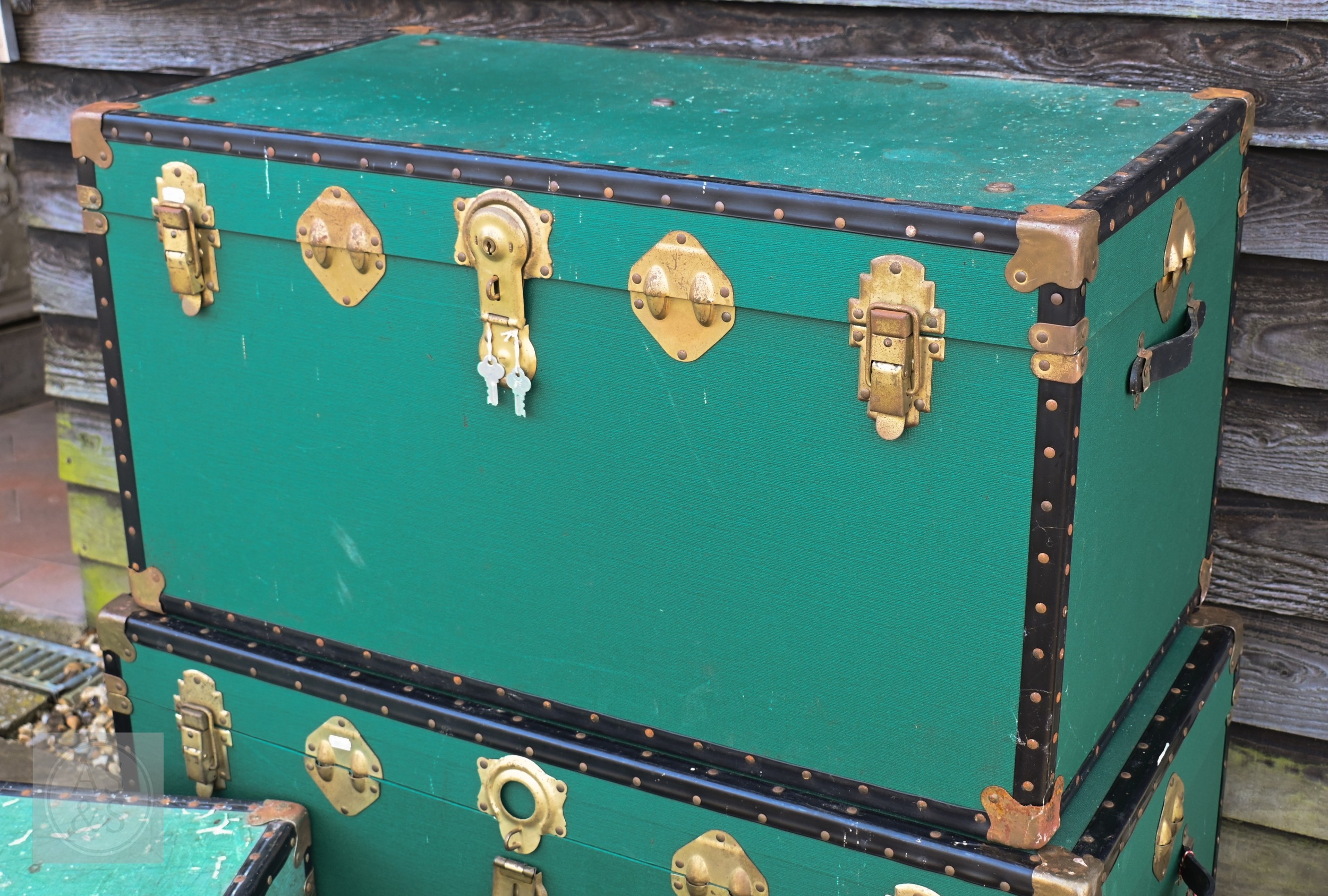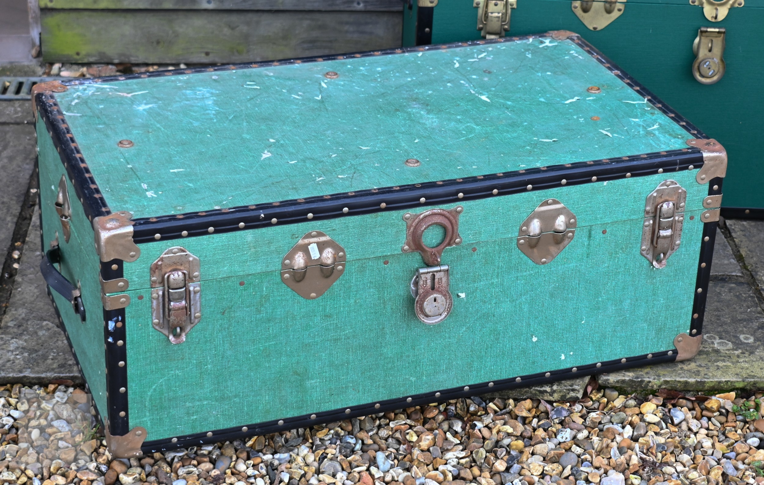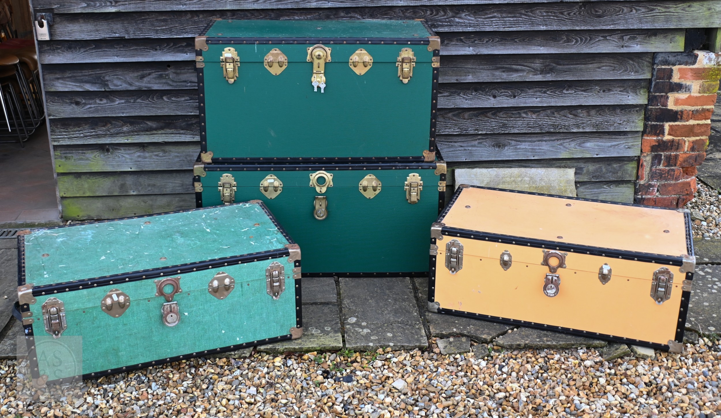 Four assorted traditional luggage trunks, three green 100 cm x 51 cm x 50 cm h; 93 cm x 51 cm x 49 cm h; 91 cm x 51 cm x 35 cm h; one yellow 91 cm x 51 cm x 36 cm h (4)
