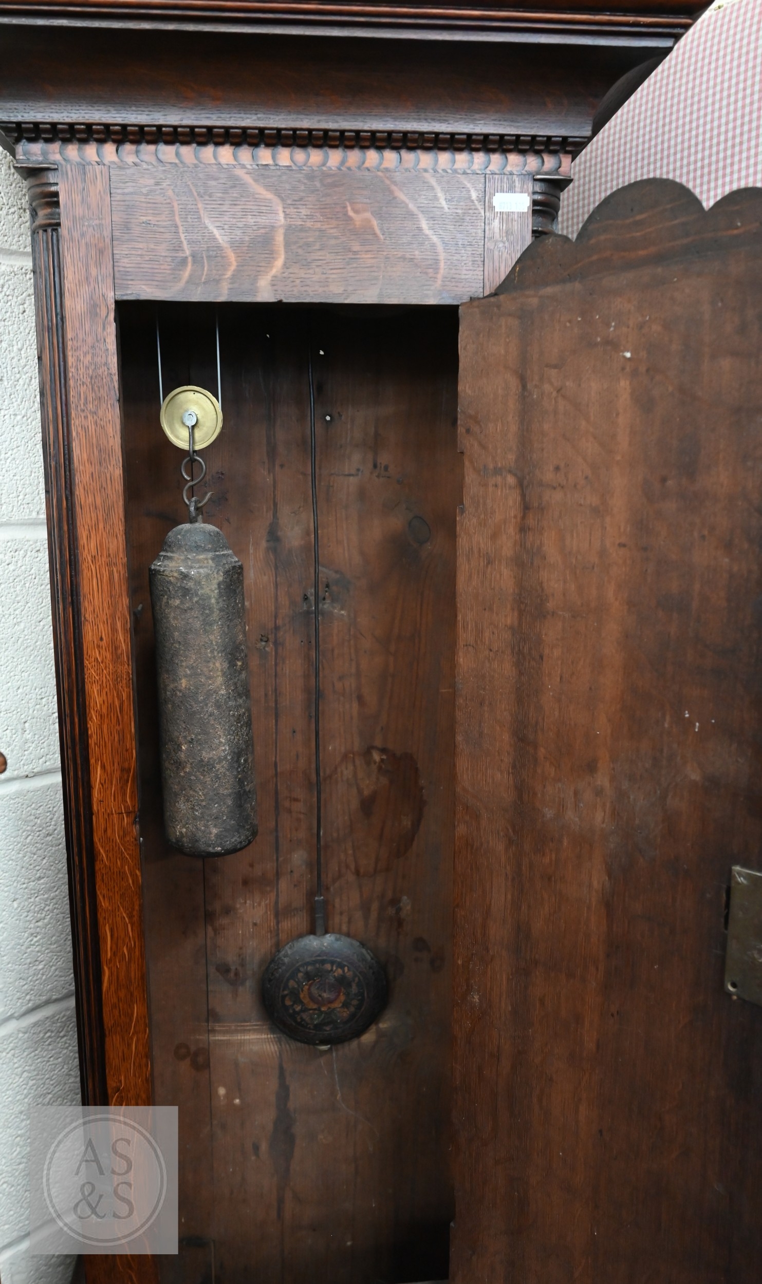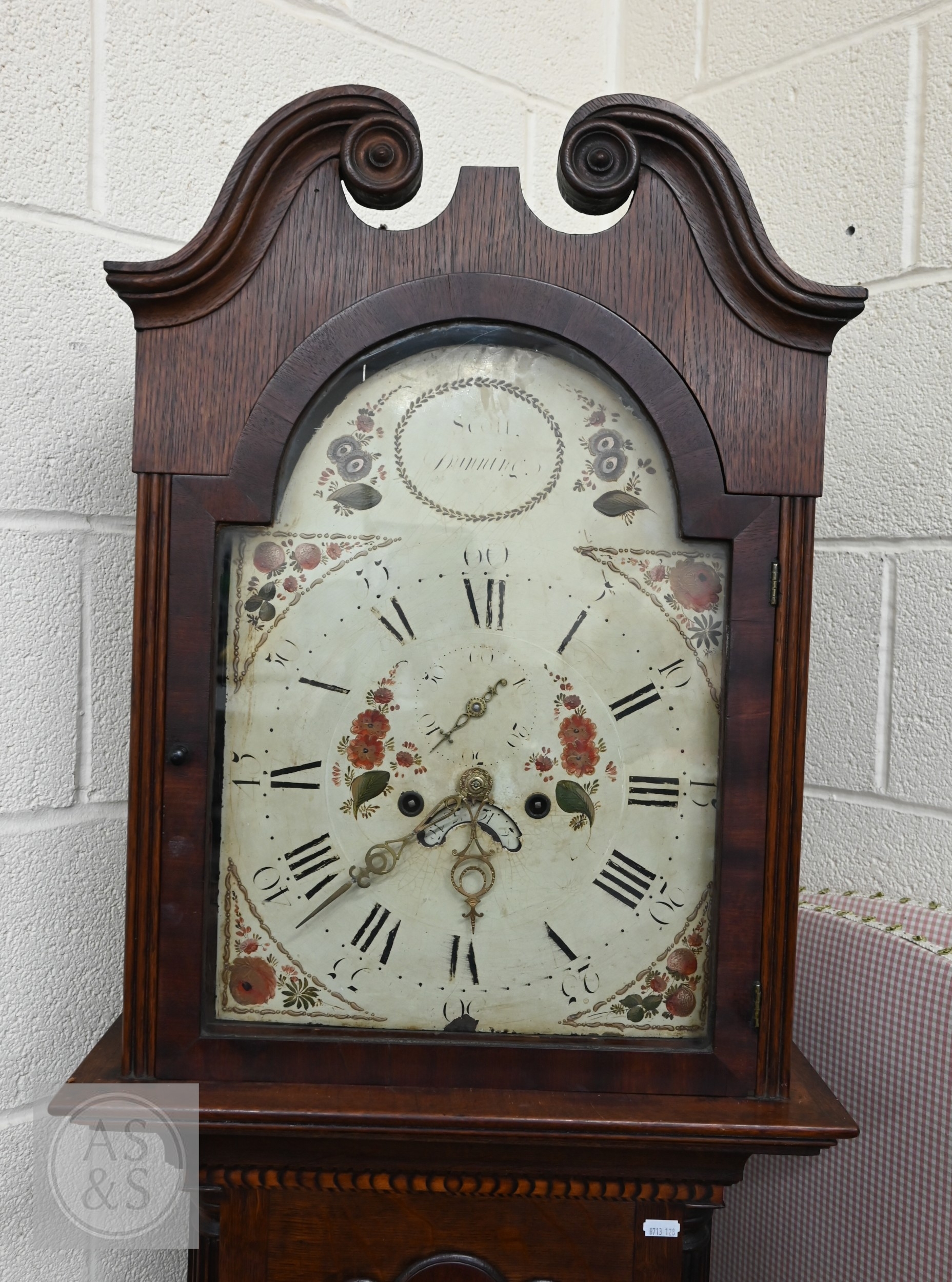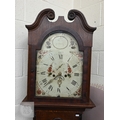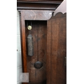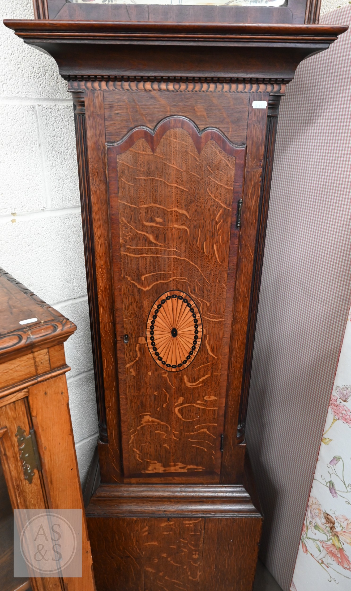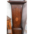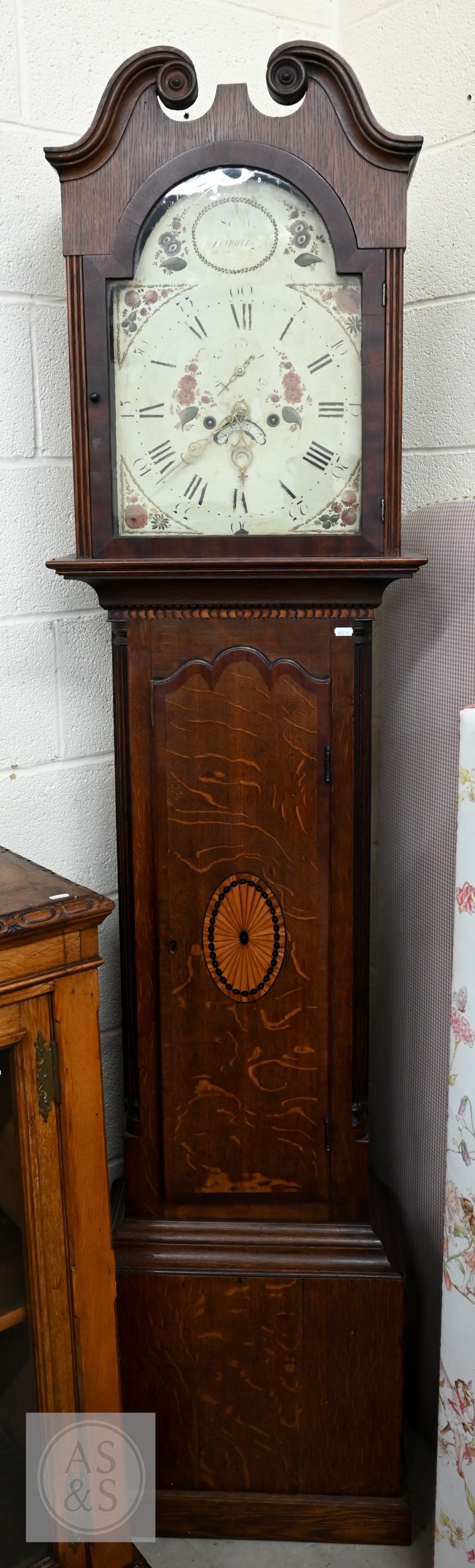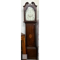 An early 19th century oak longcase clock with inlaid oval patera, eight-day movement with floral painted dial with subsidiary seconds dial and date aperture, c/w two weights and pendulum, 210 cm high