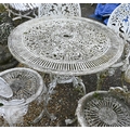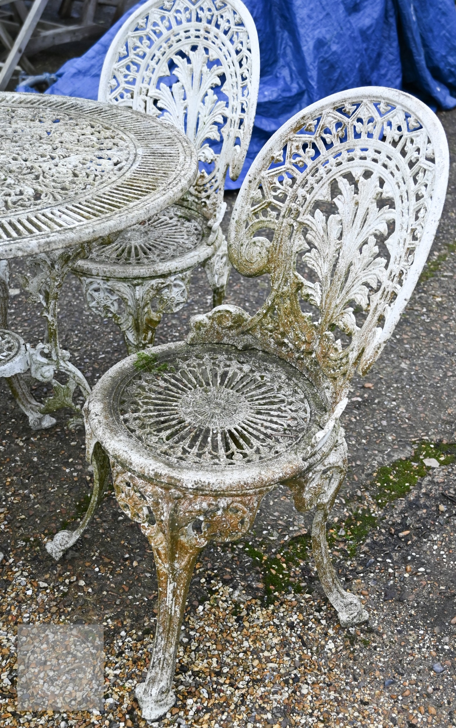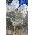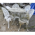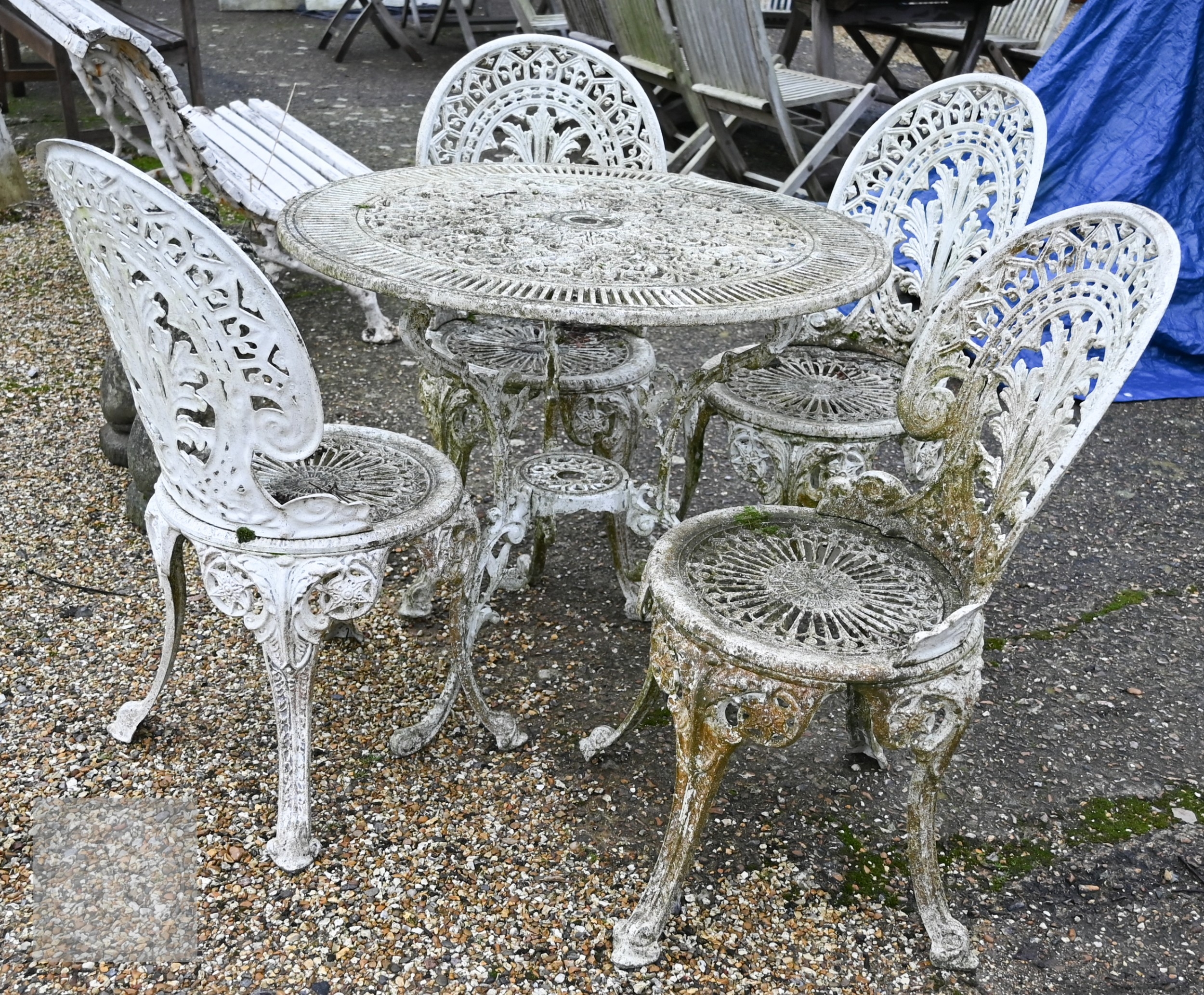 A weathered Victorian style cast alloy terrace breakfast set, comprising a circular table and four chairs, distressed white (5)