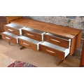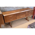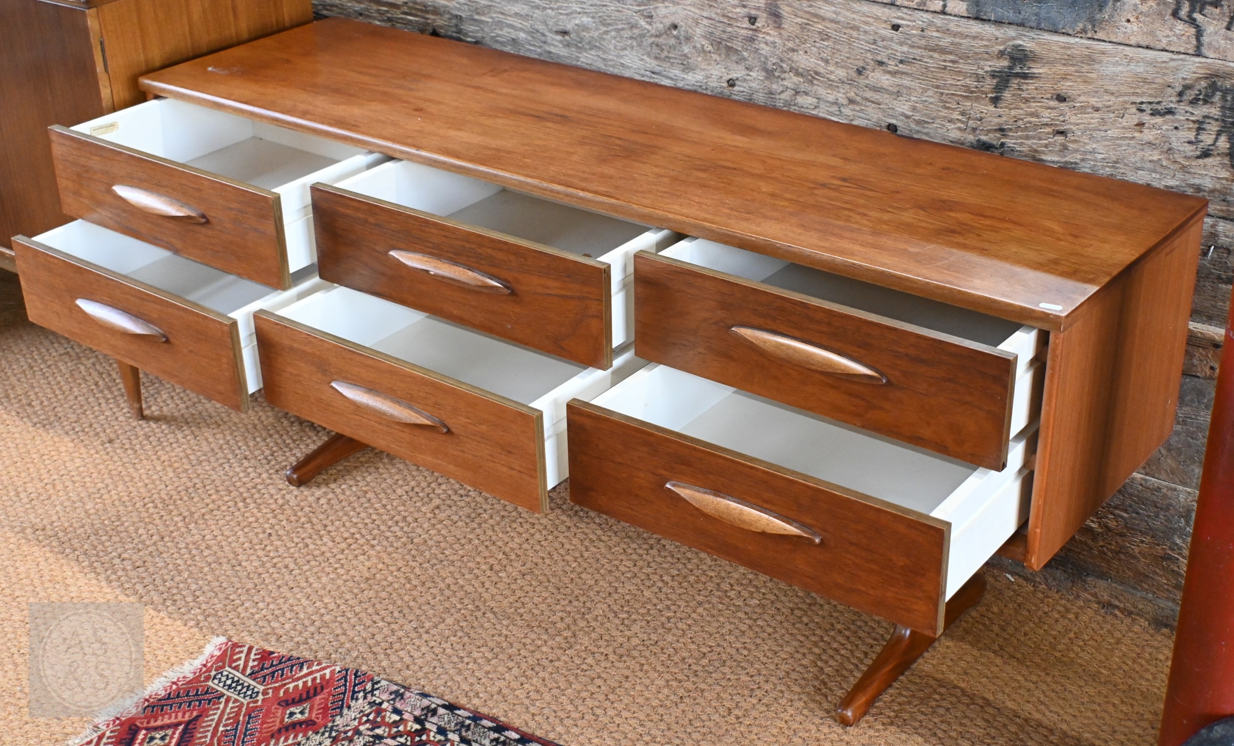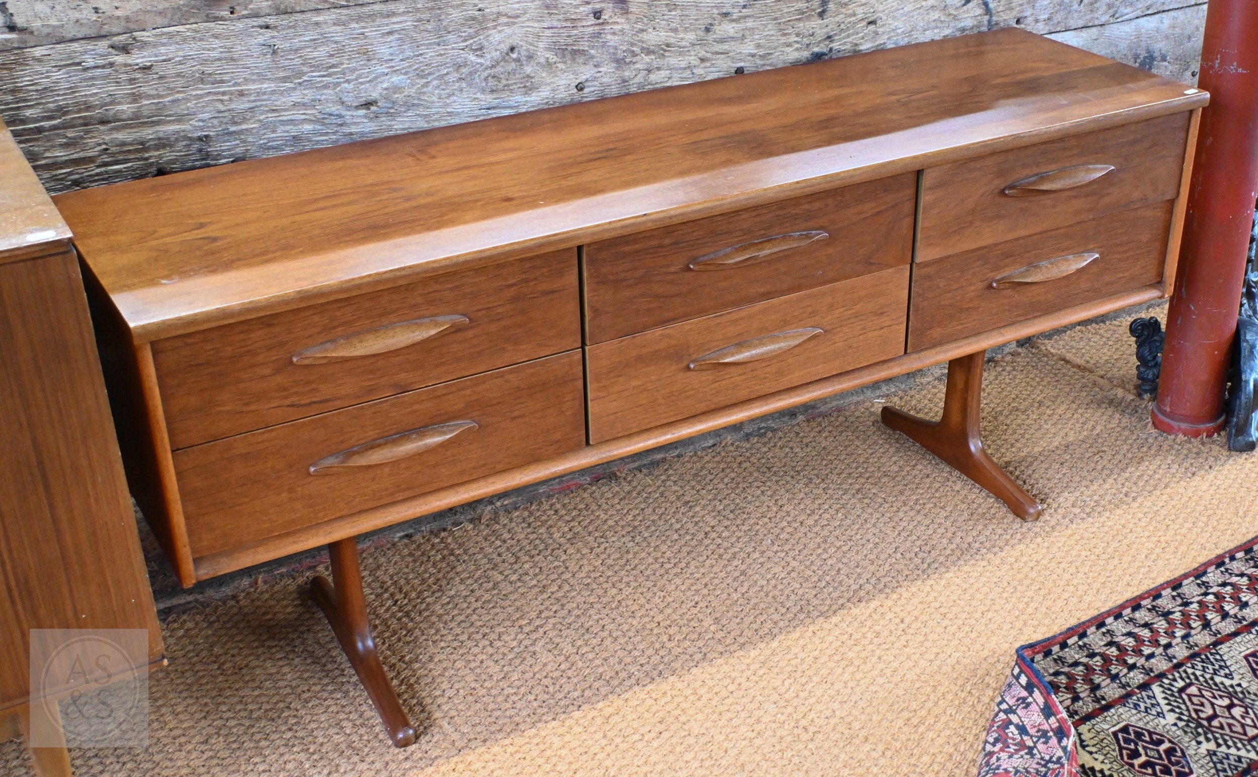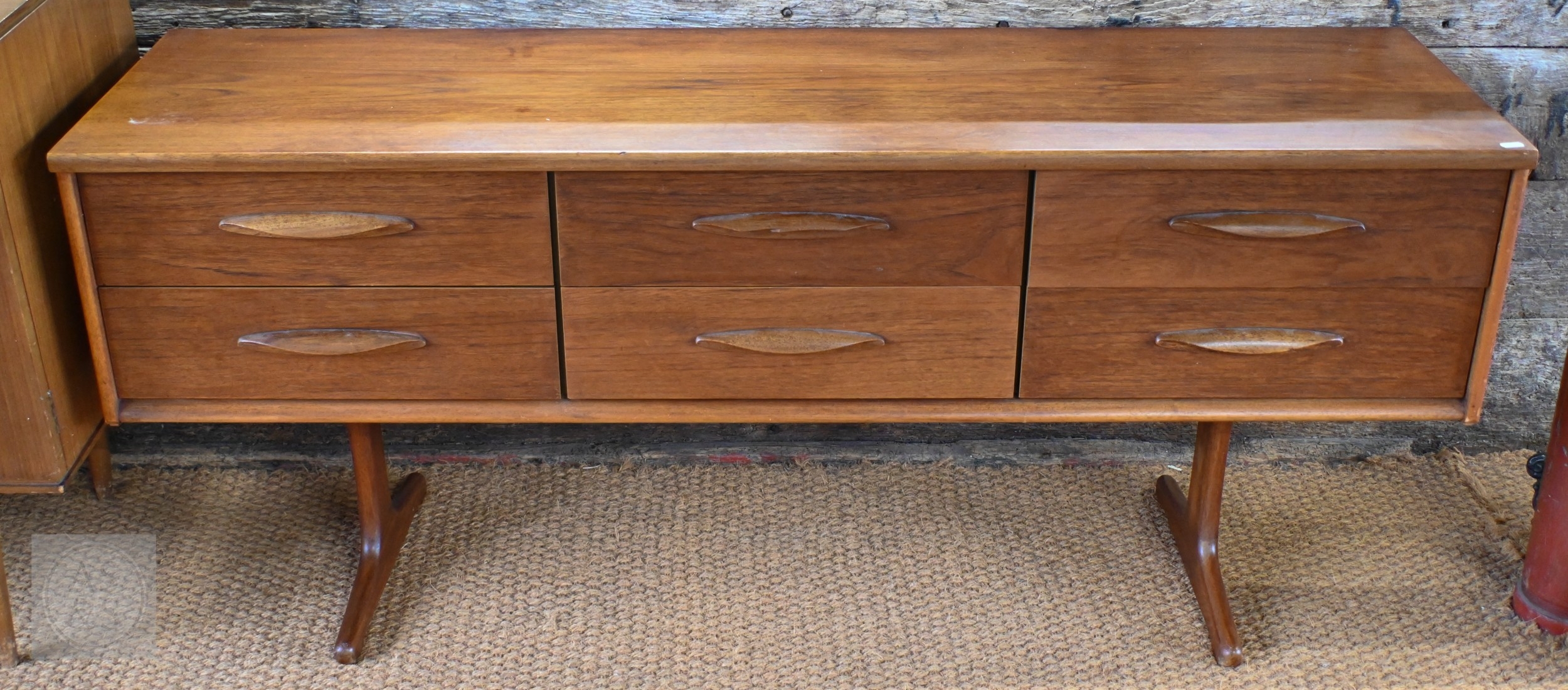 A mid-century teak sideboard by Austinsuite, with three over three short drawers and raised on trestle ends to sled feet, 155 cm x 43 cm x 87.5 cm h