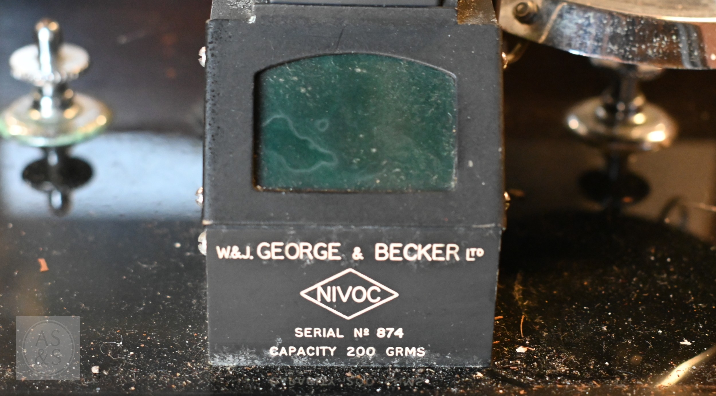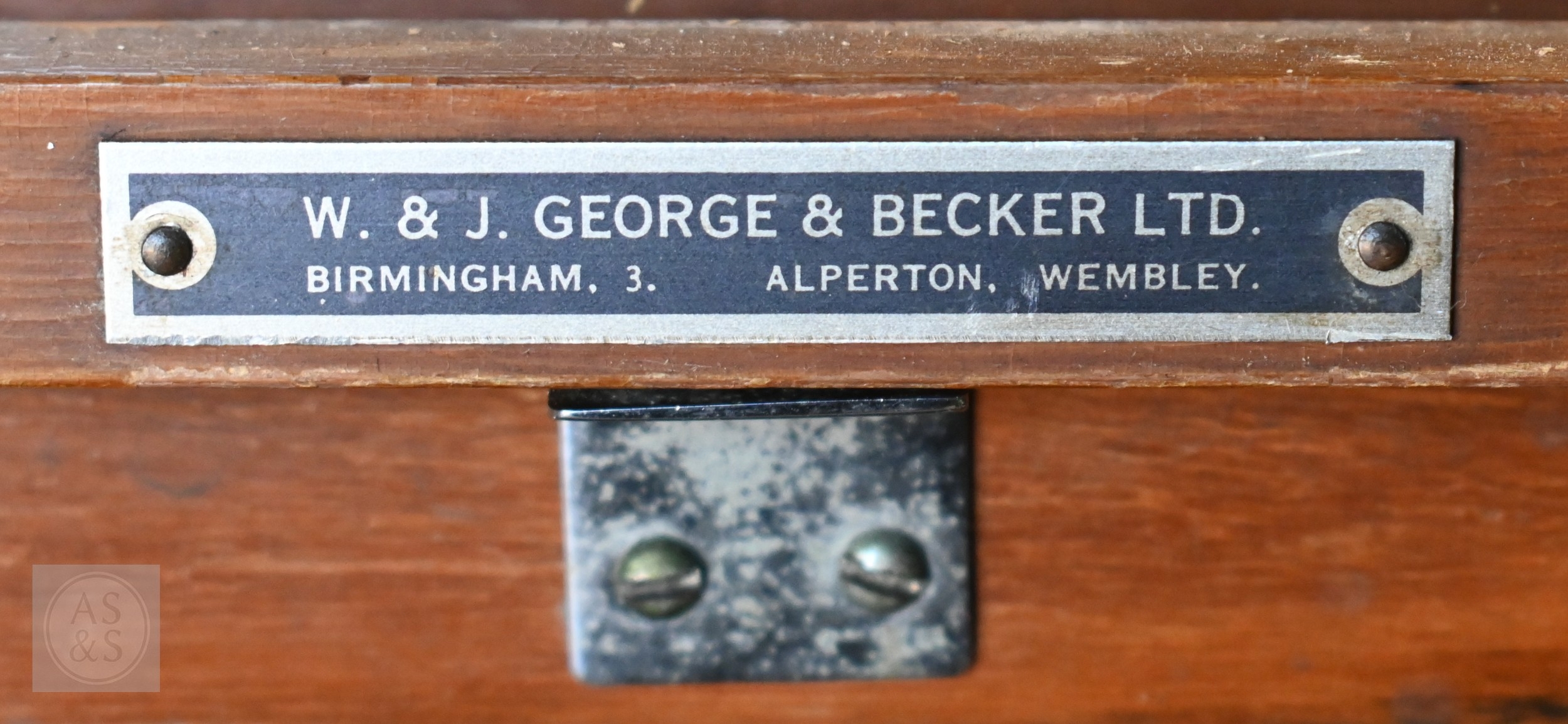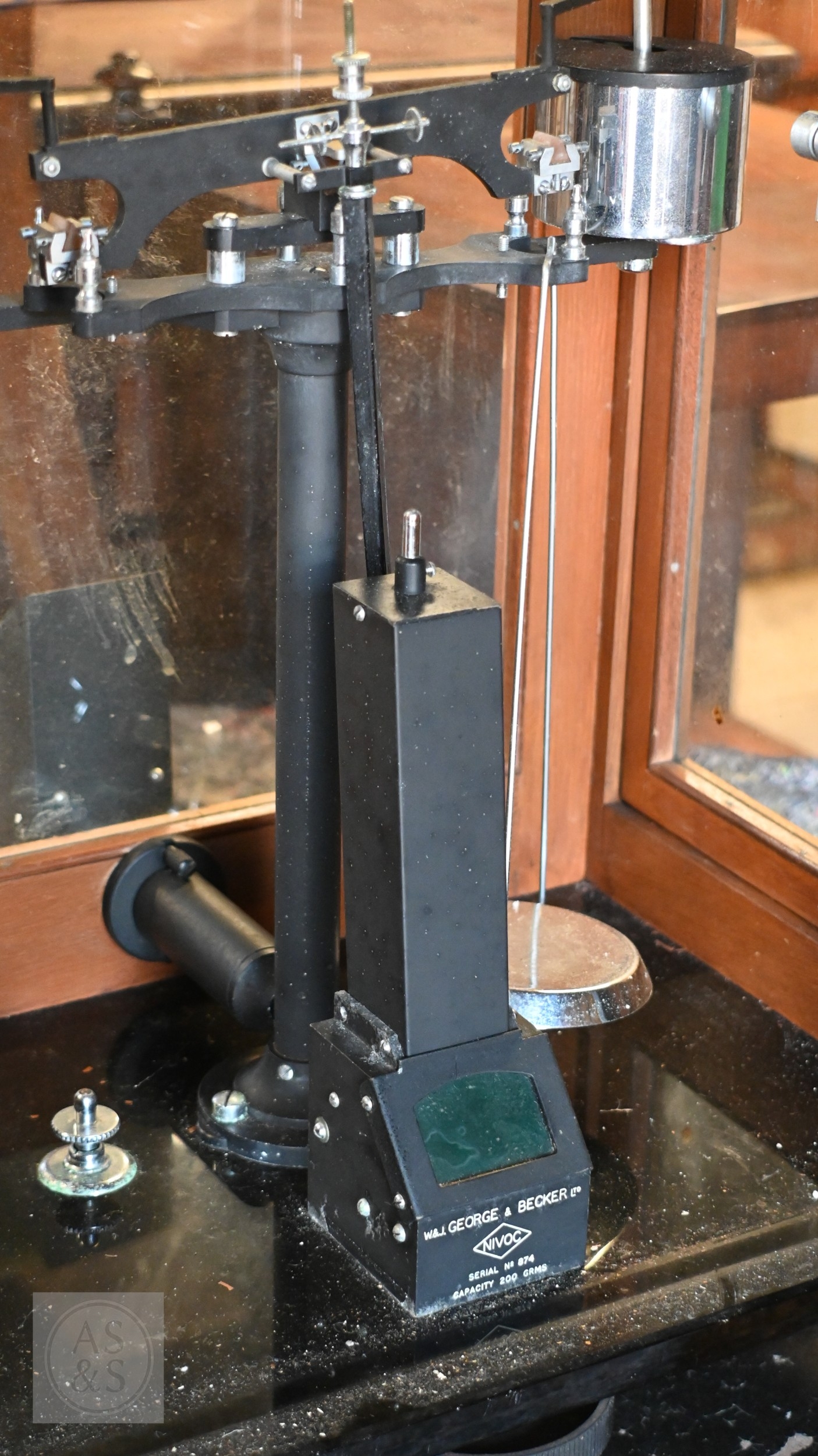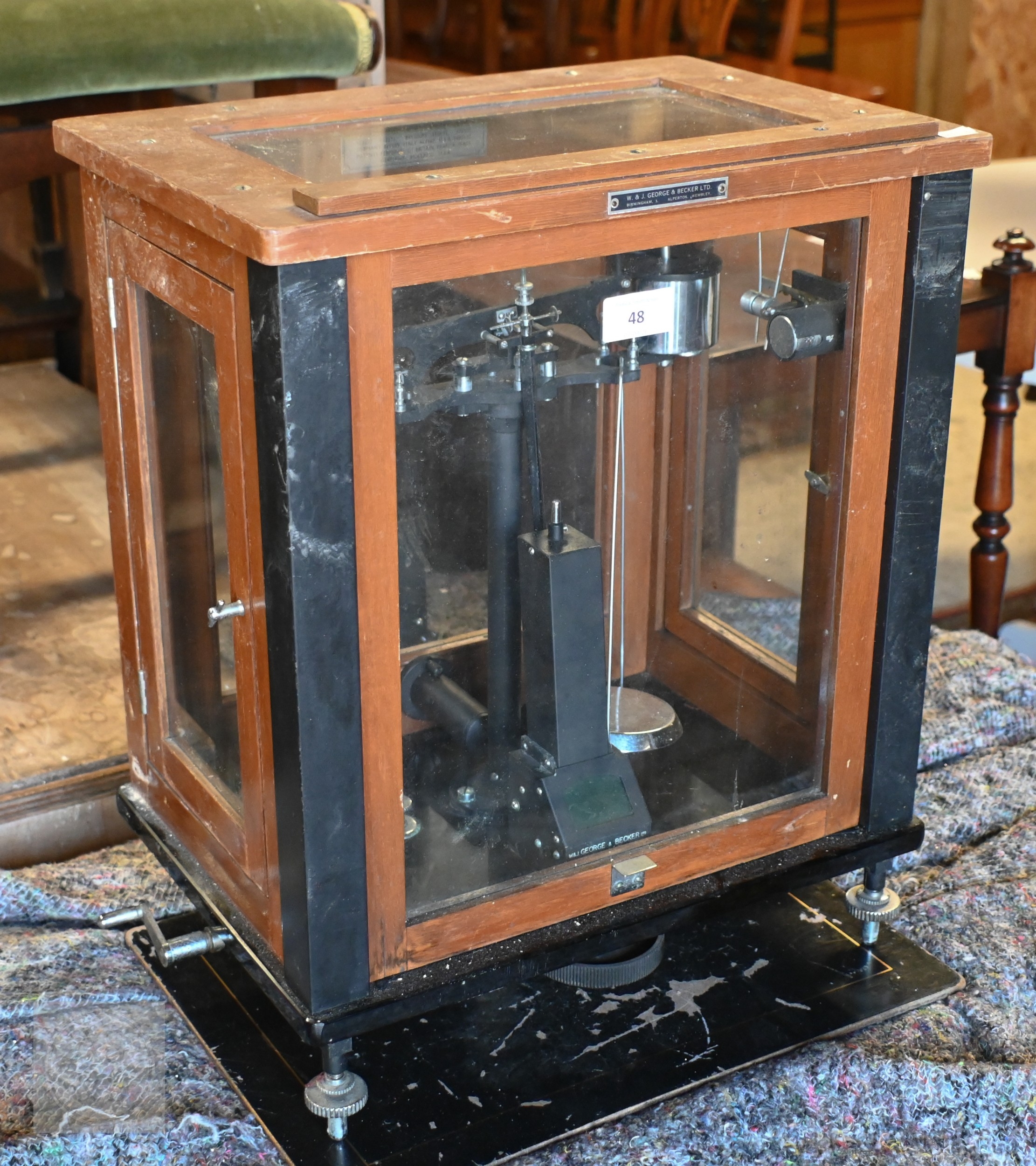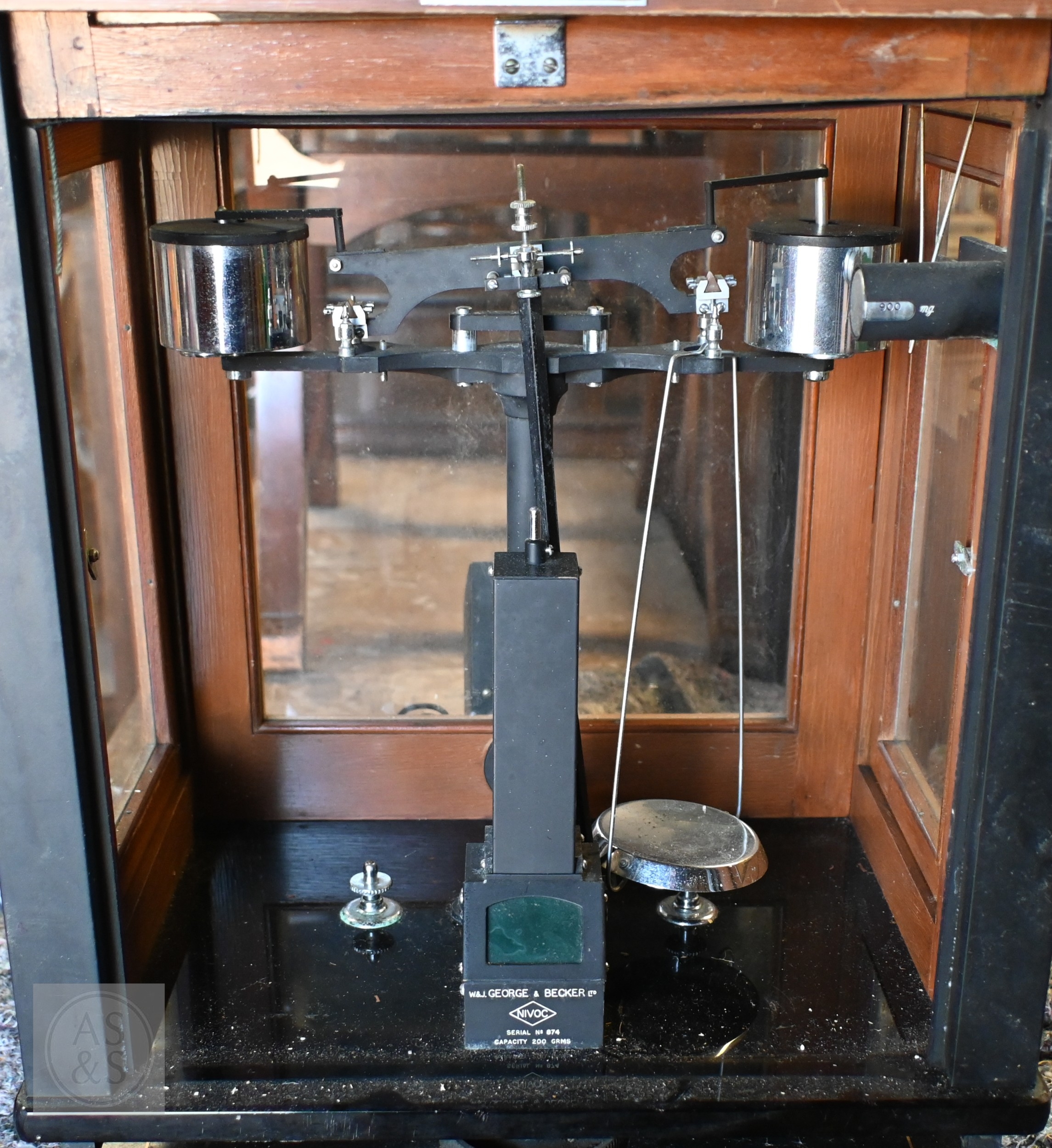 An early George & Becker Ltd glazed-in cased chemists scales, a/f