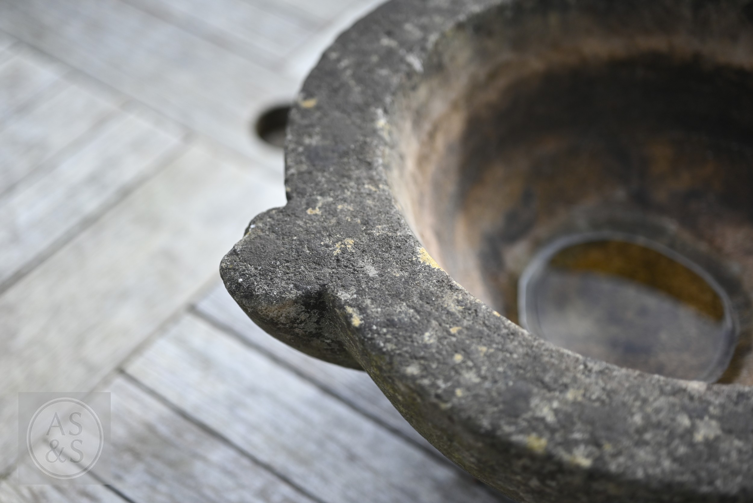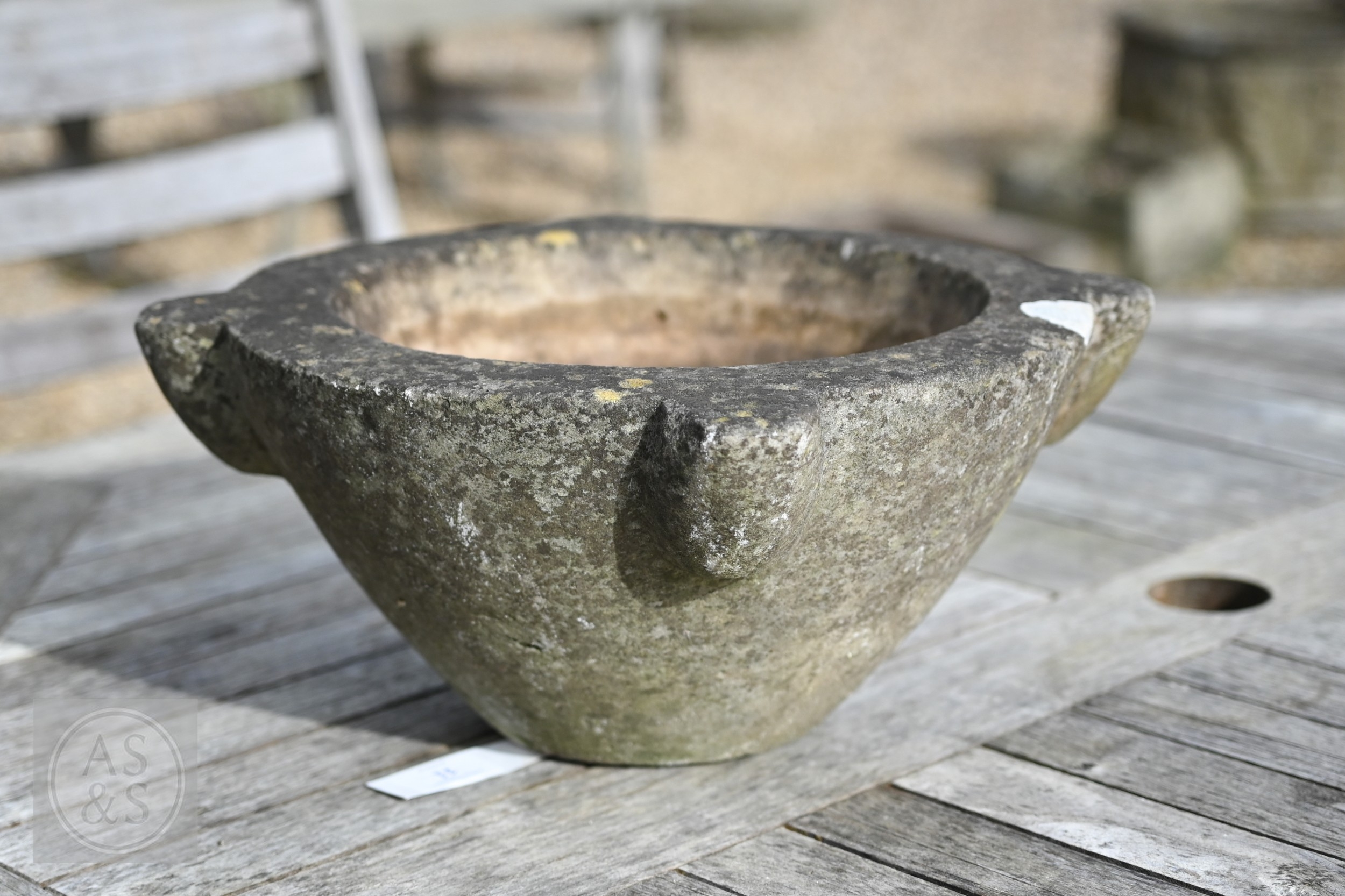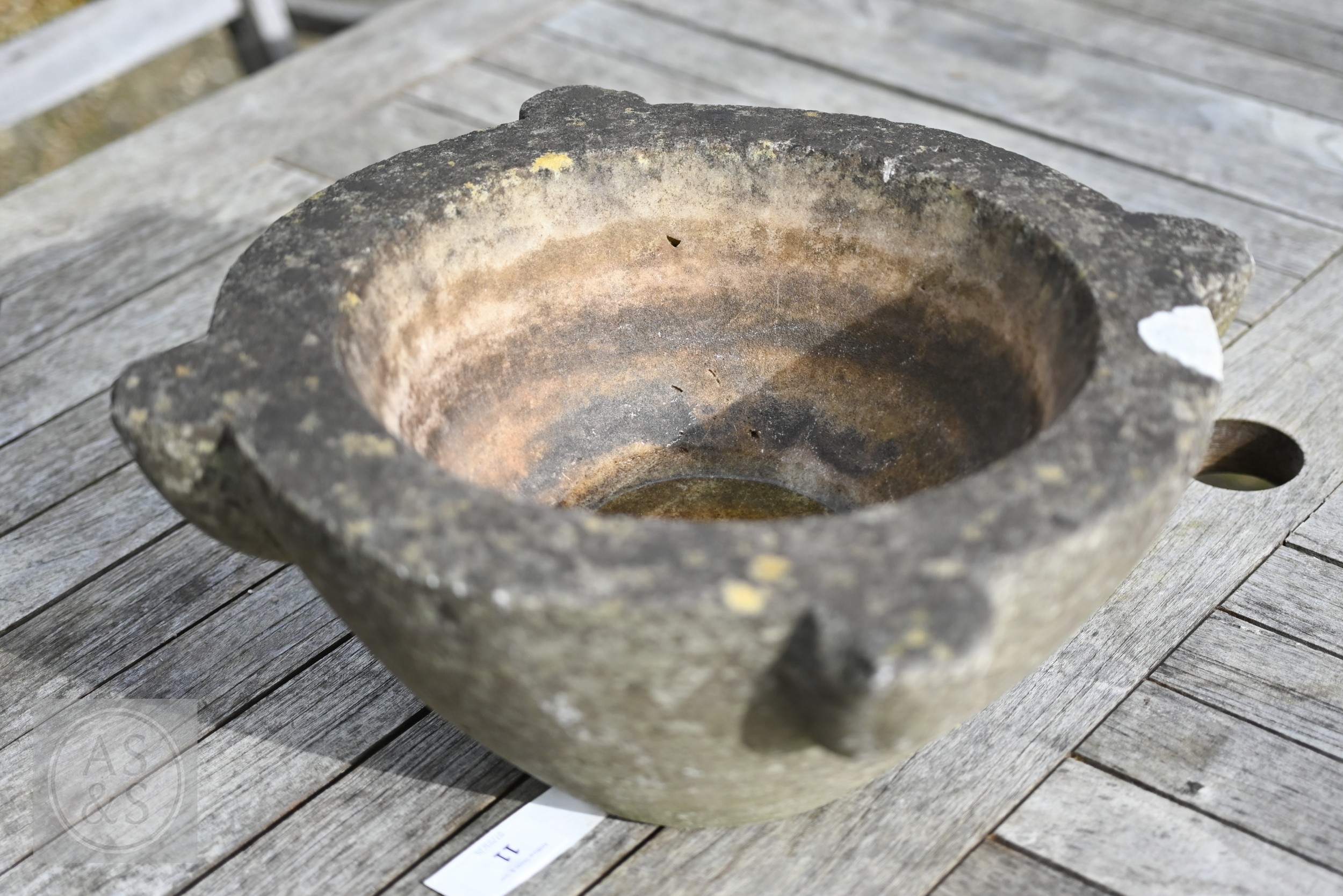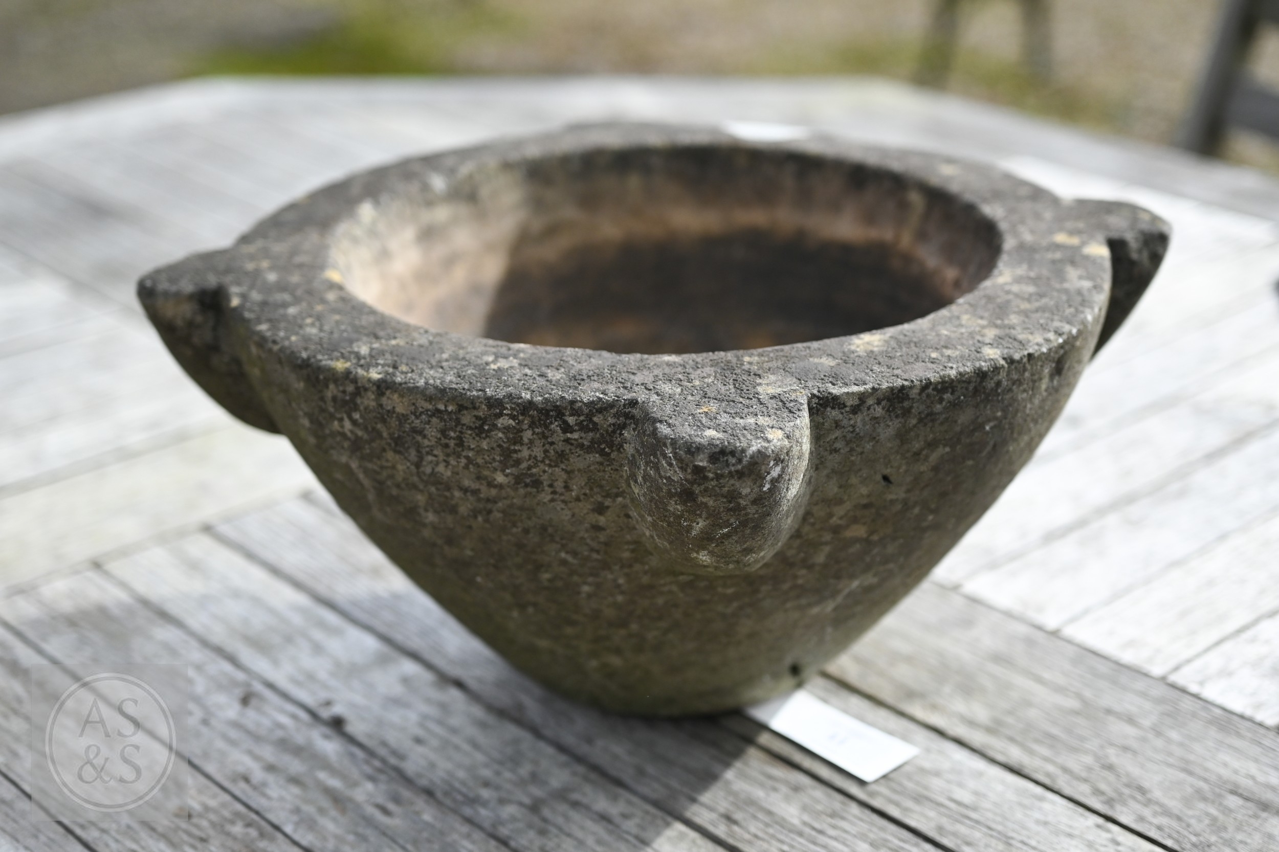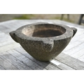 An antique weathered marble mortar, 38 cm dia. x 15 cm h