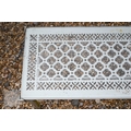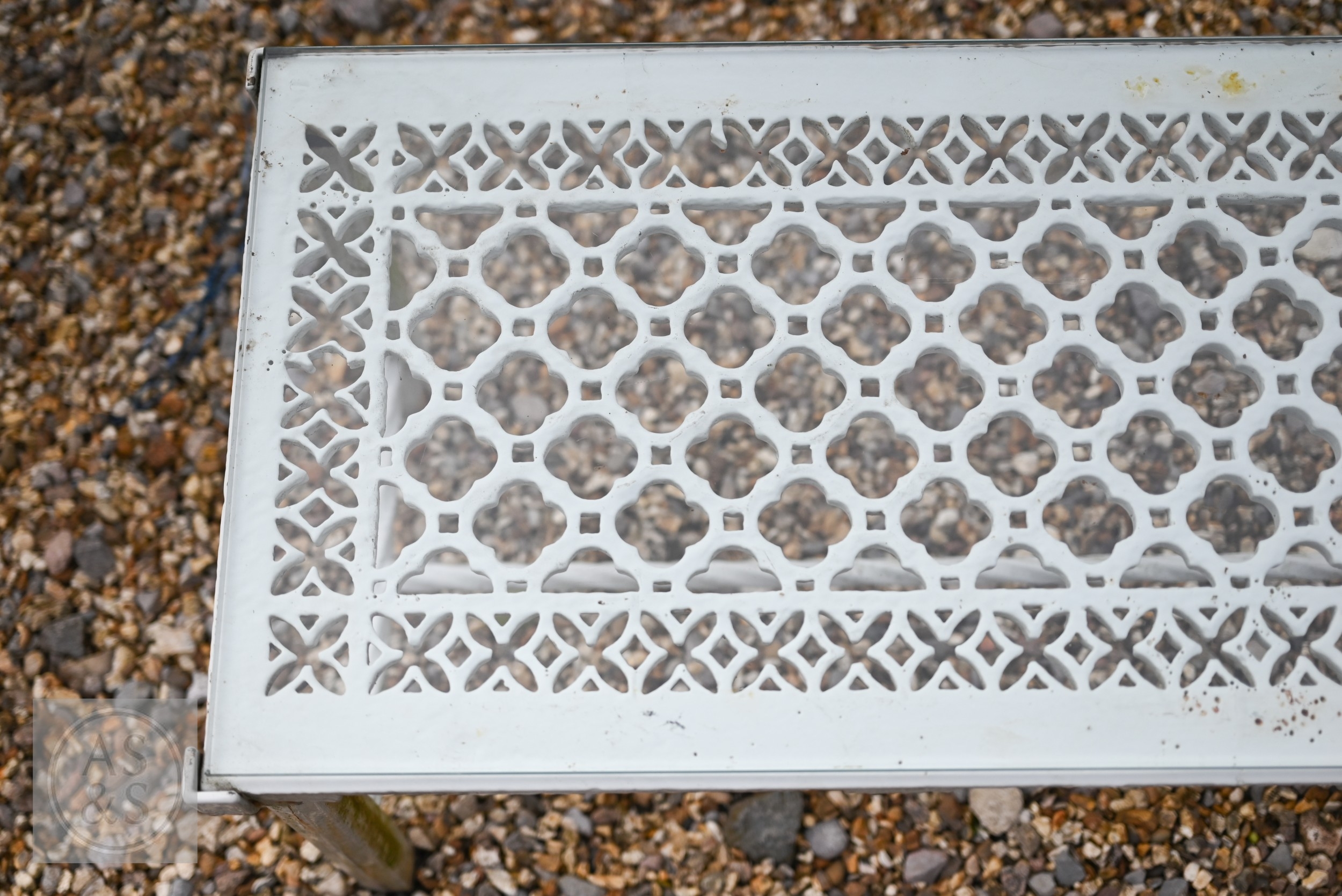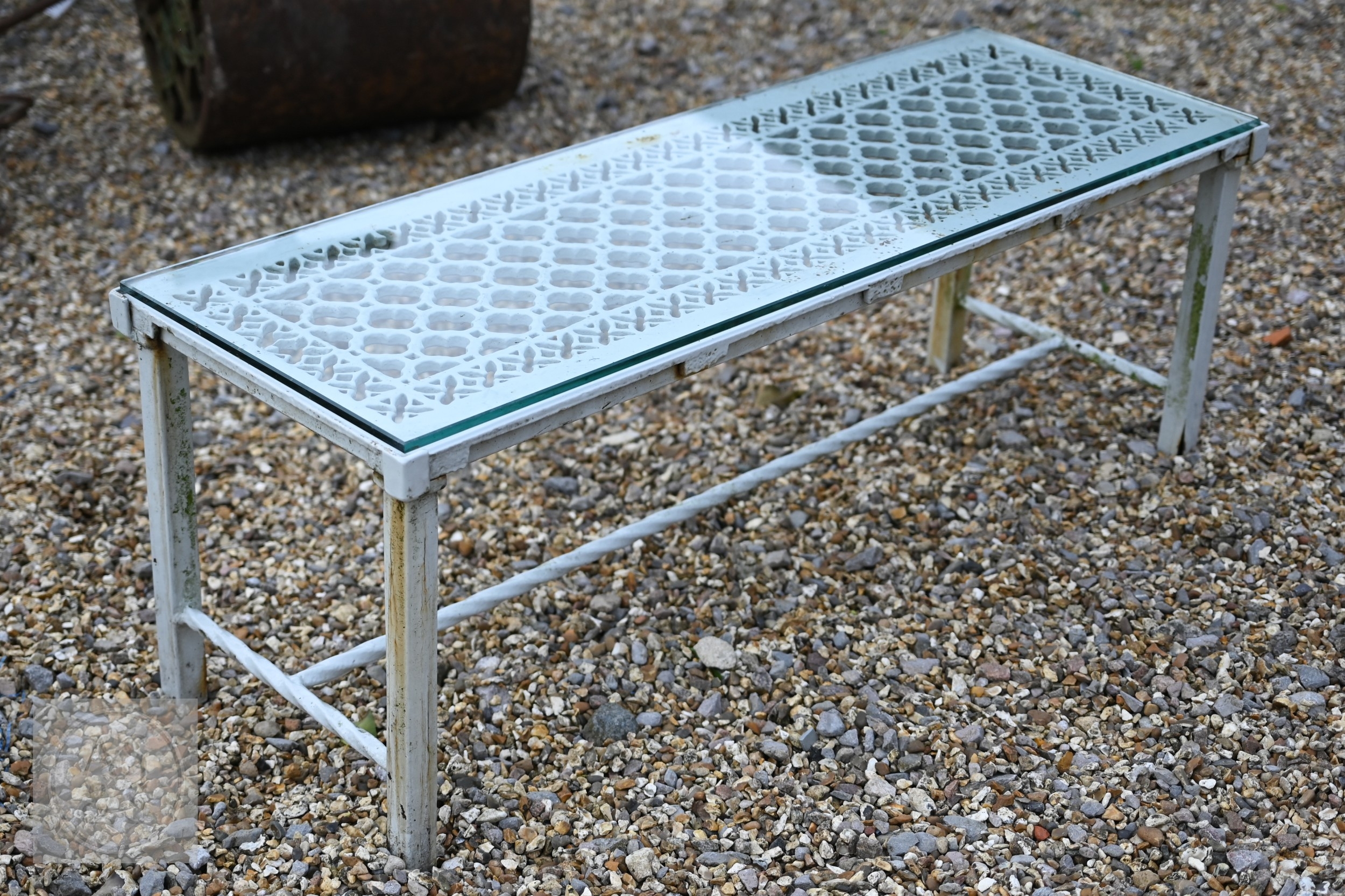A pierced decoration cast iron grill as a conservatory coffee table, glass top, 112 cm x 38 cm x 39 cm h
