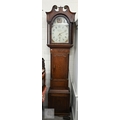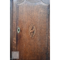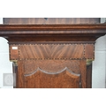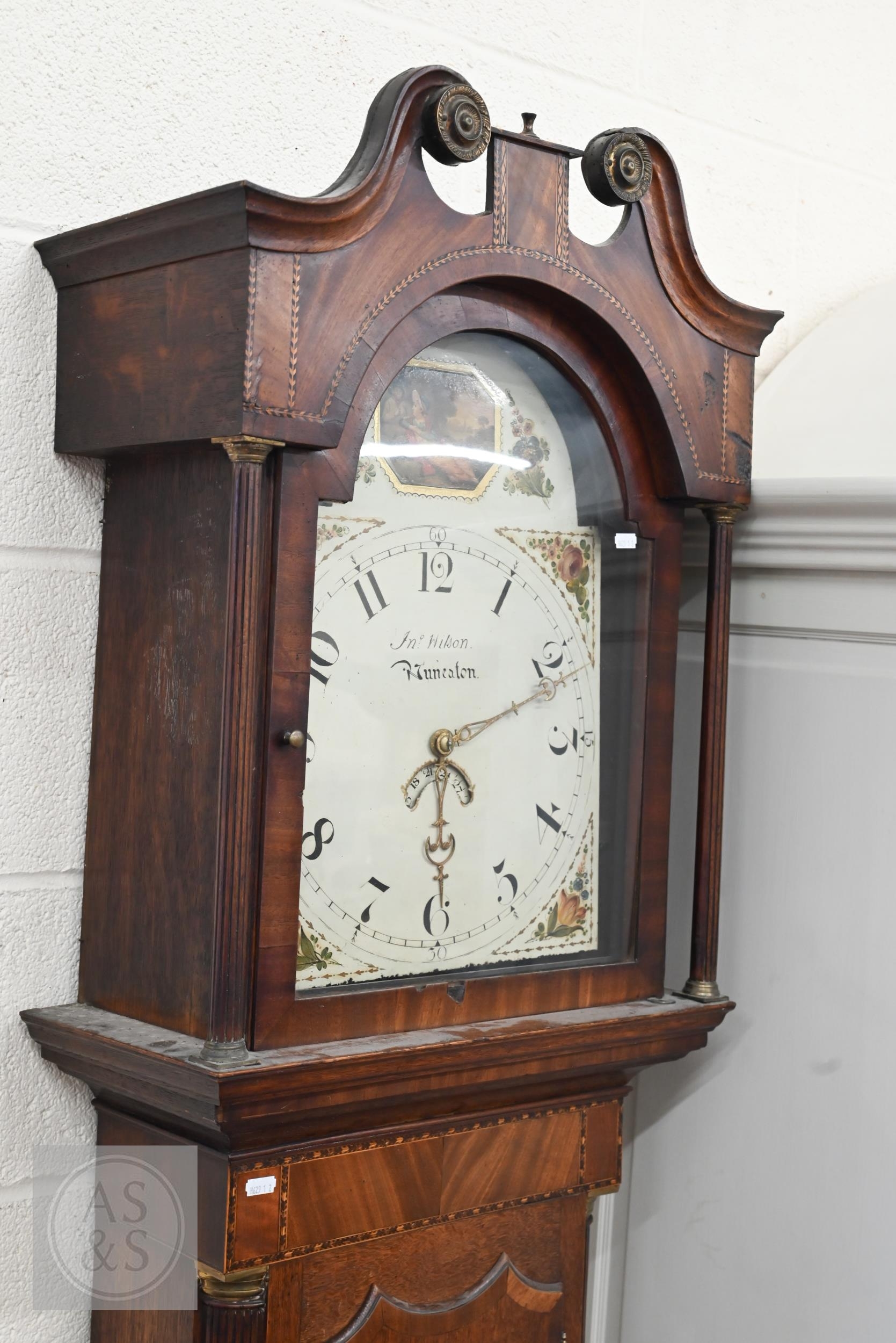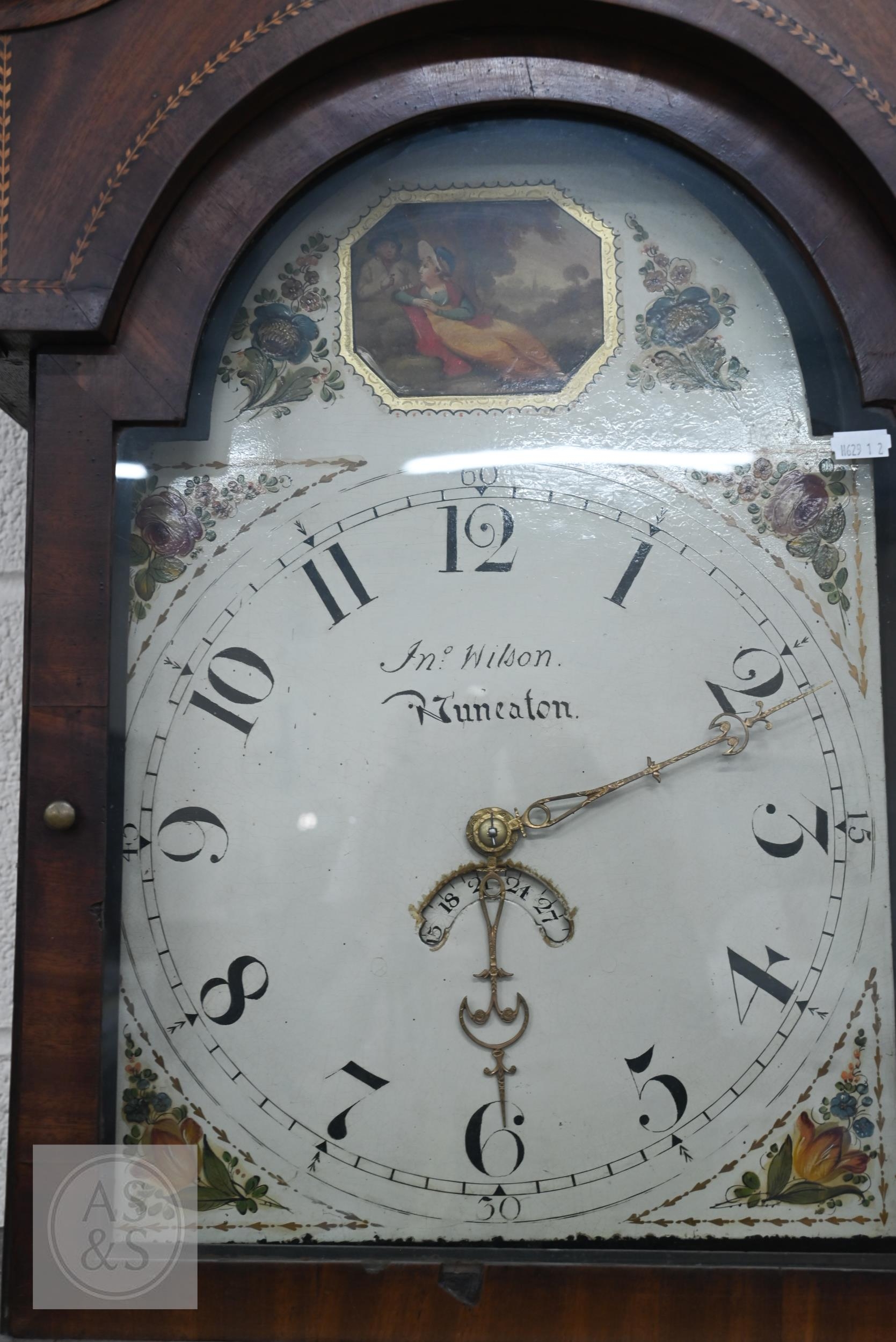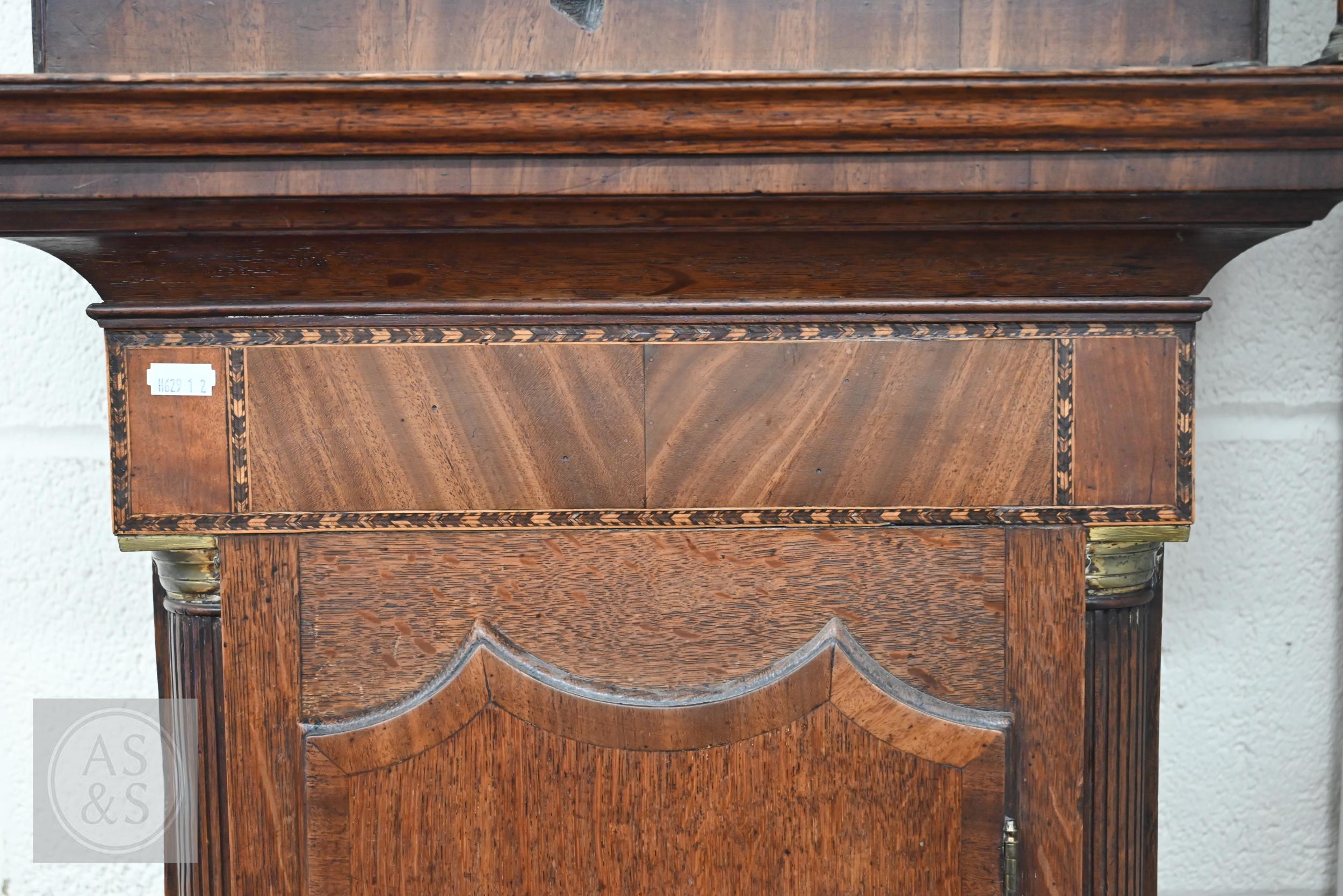 # An antique oak shell inlaid longcase clock, painted dial with date window signed 'J N Wilson Nuneaton' on 30 hour movement c/w weight and pendulum, without key, 216 cm high