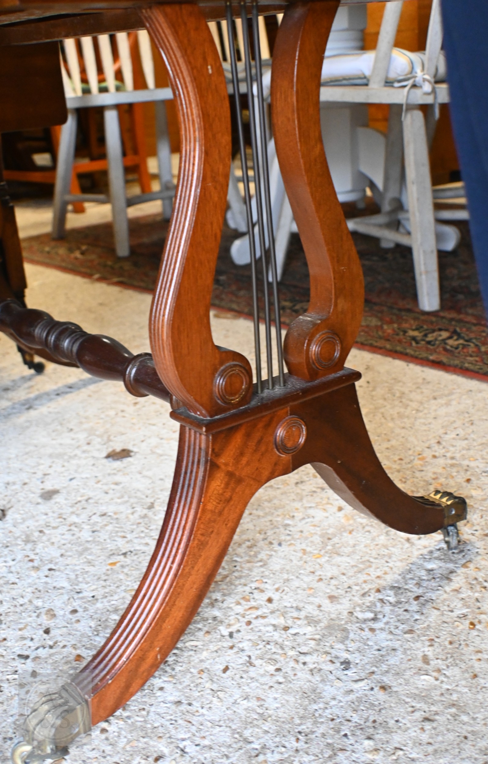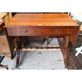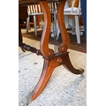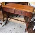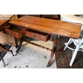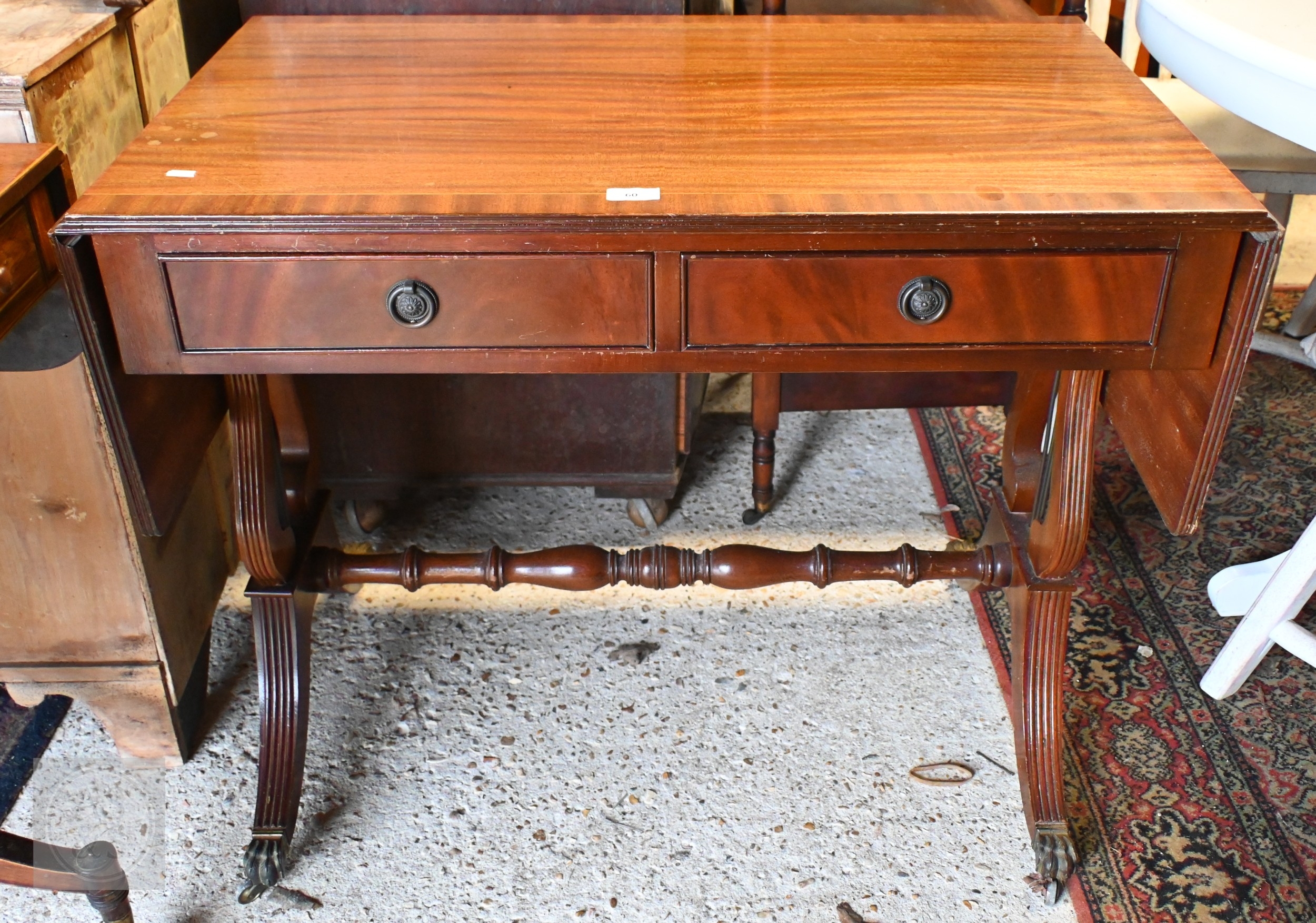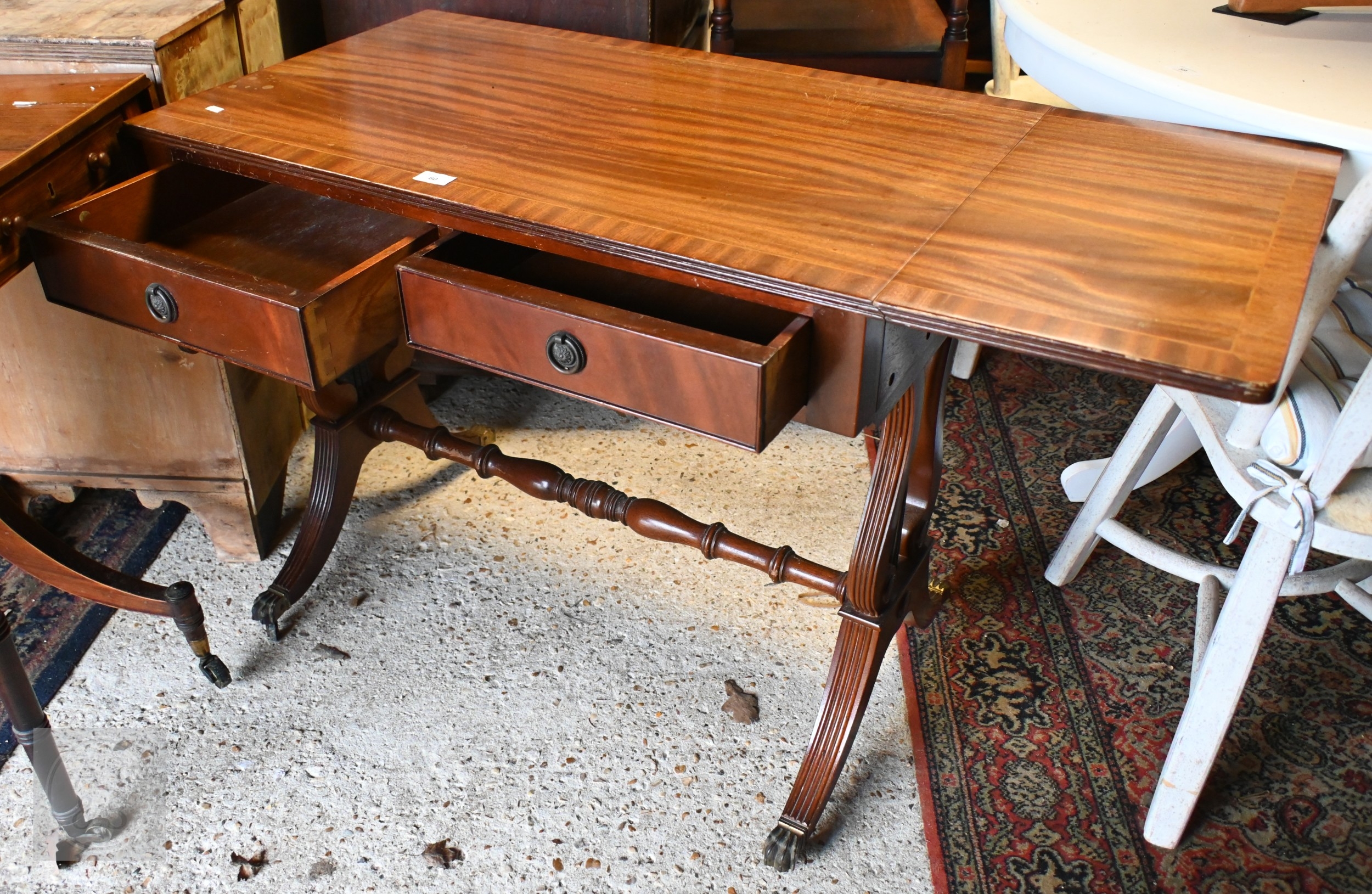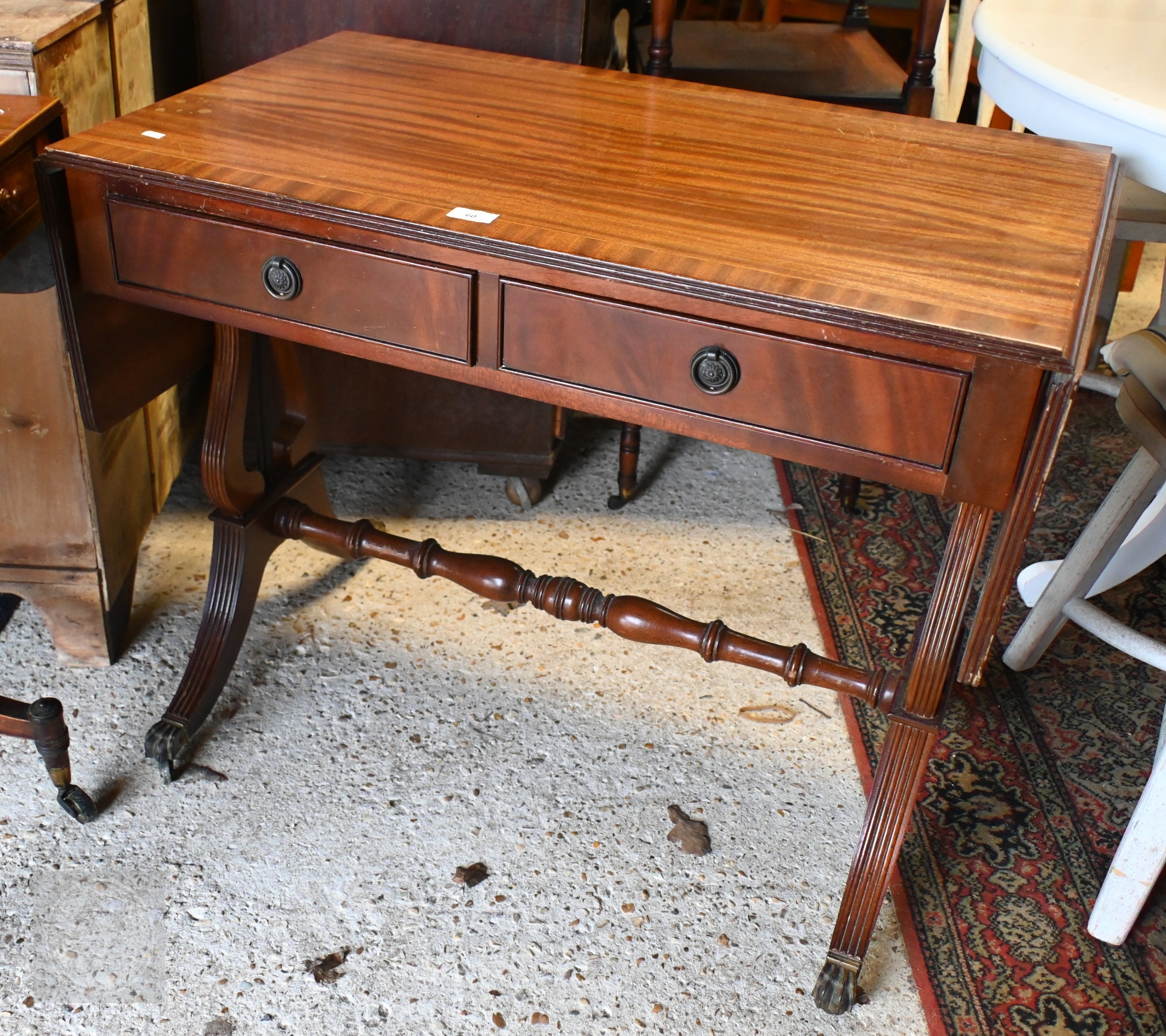 A reproduction cross-banded bright mahogany two drawer drop leaf sofa table, raised on brass paws and castors, 88 cm x 51 cm x 72 cm h