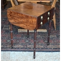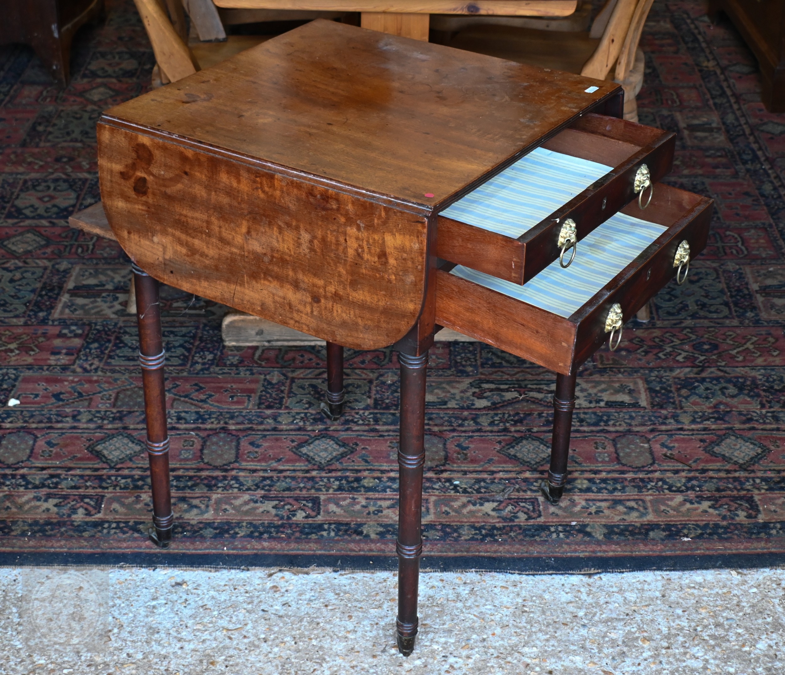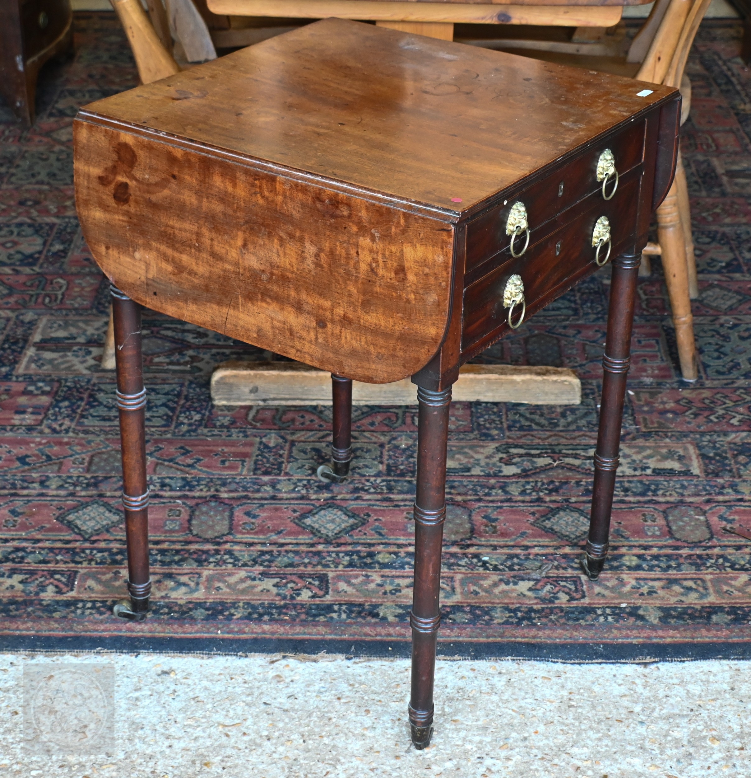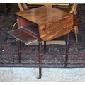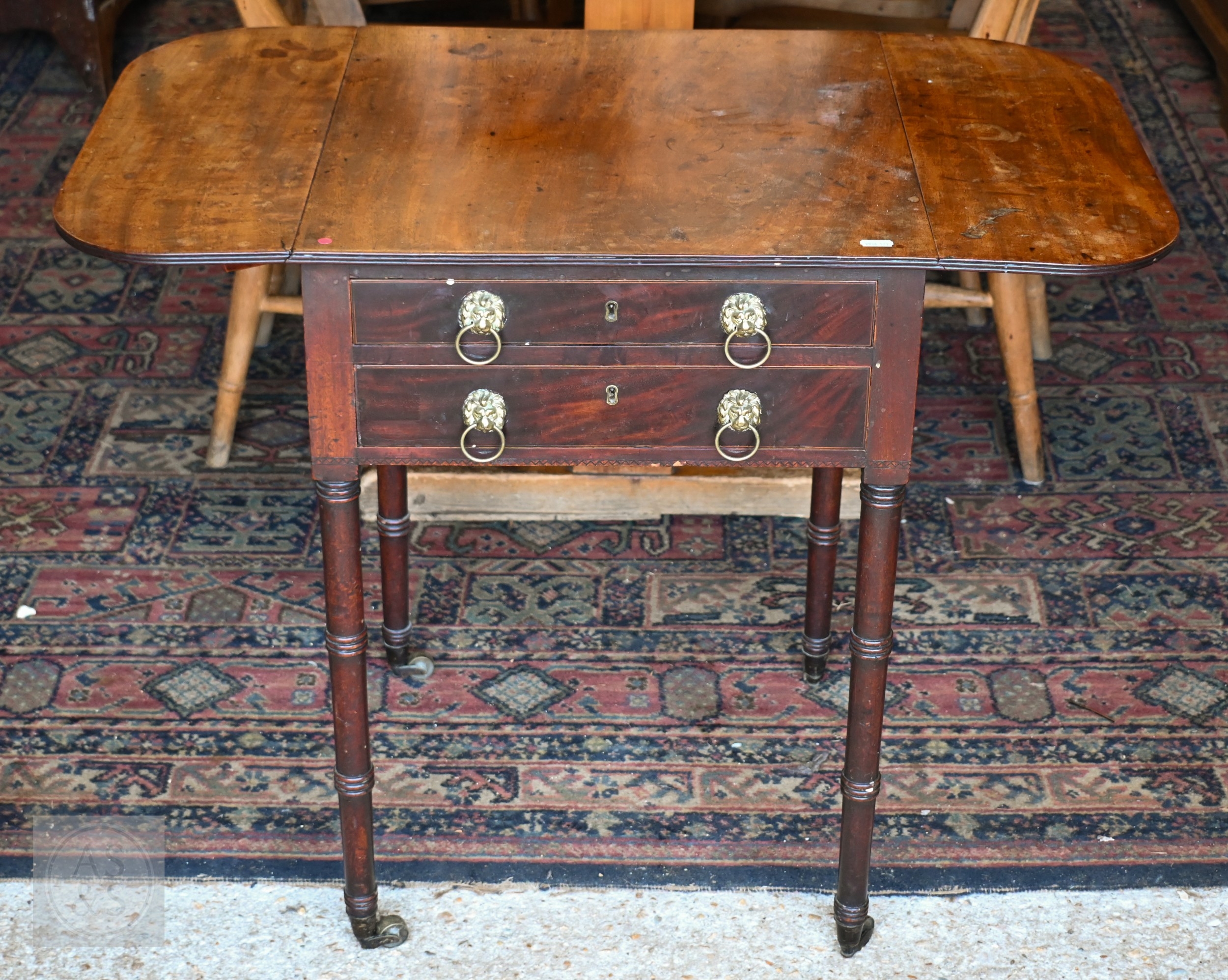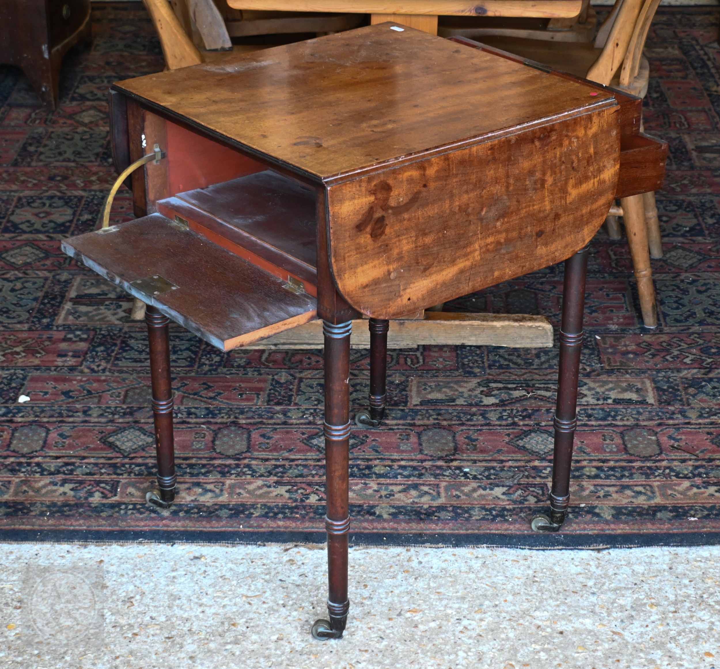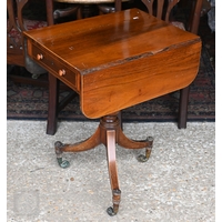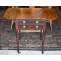 A Victorian mahogany drop-leaf night table, with two drawers opposing a fall front and raised on ring turned supports to brass castors, 50 cm x 50 cm x 70 cm h