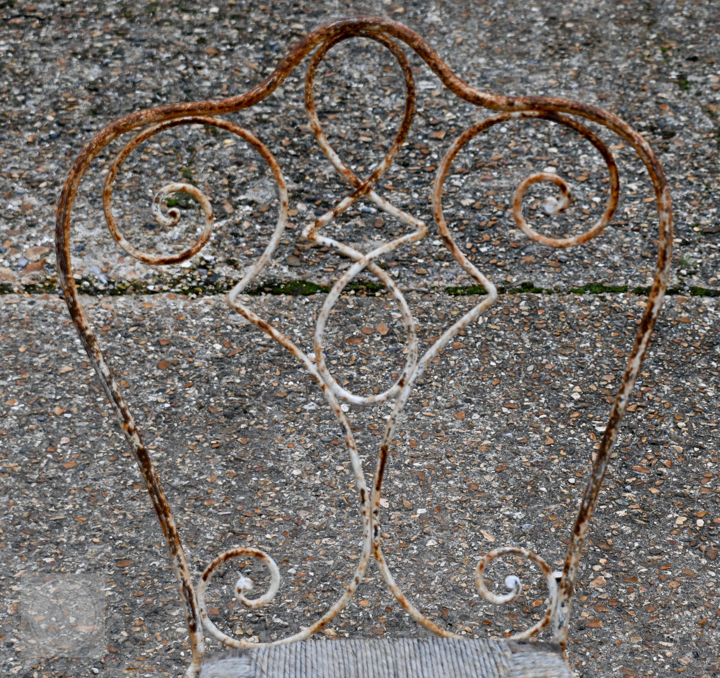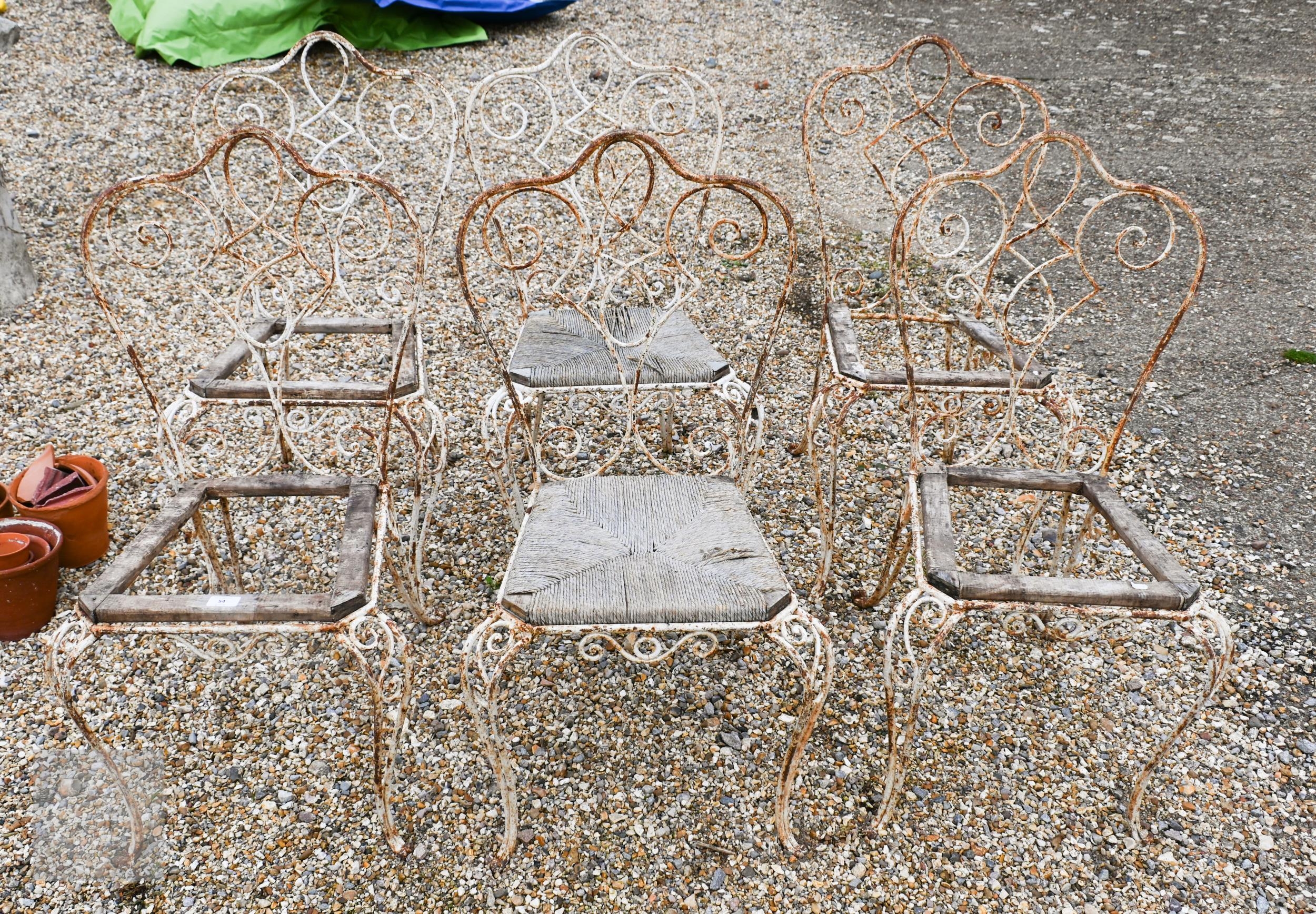 A set of six weathered antique French wrought iron terrace chairs, with remnants of the original timber framed rope seat panels, a/f but frames sound(6)