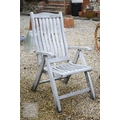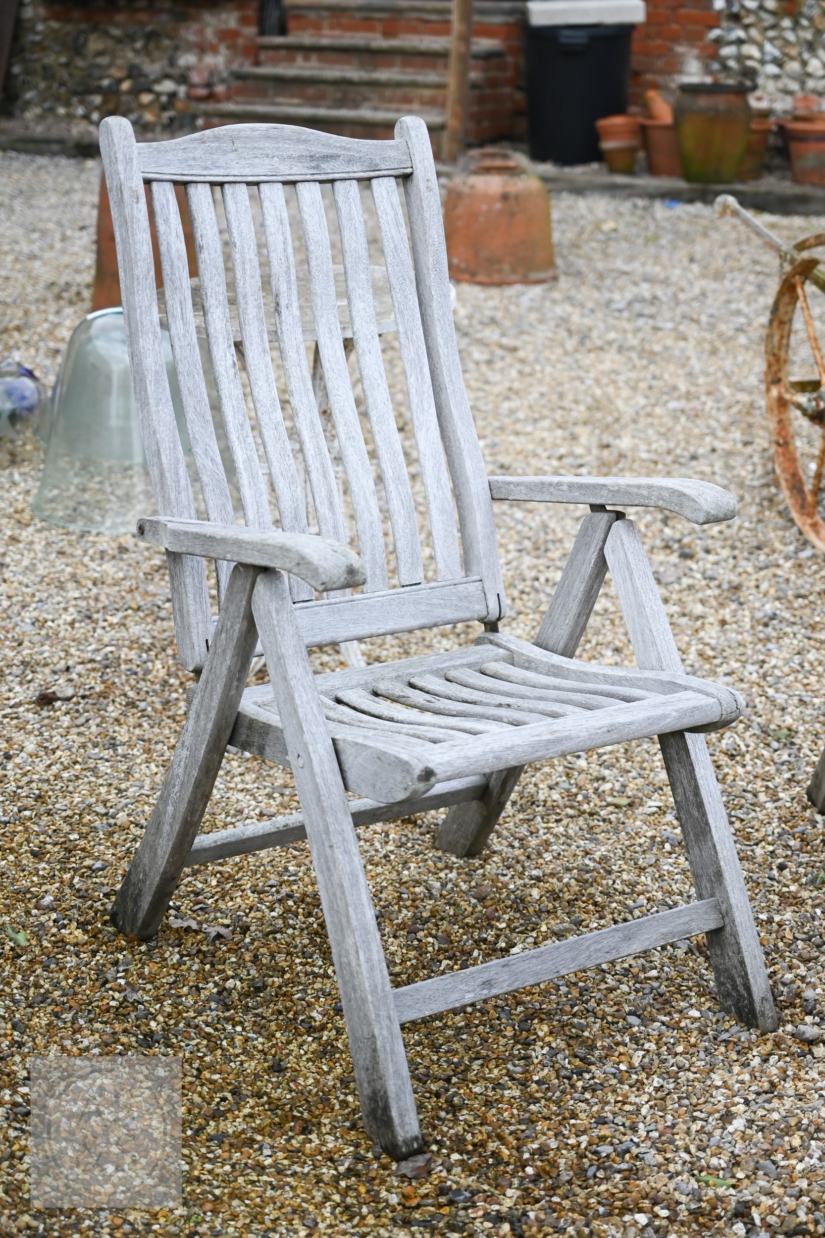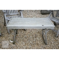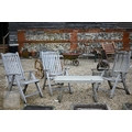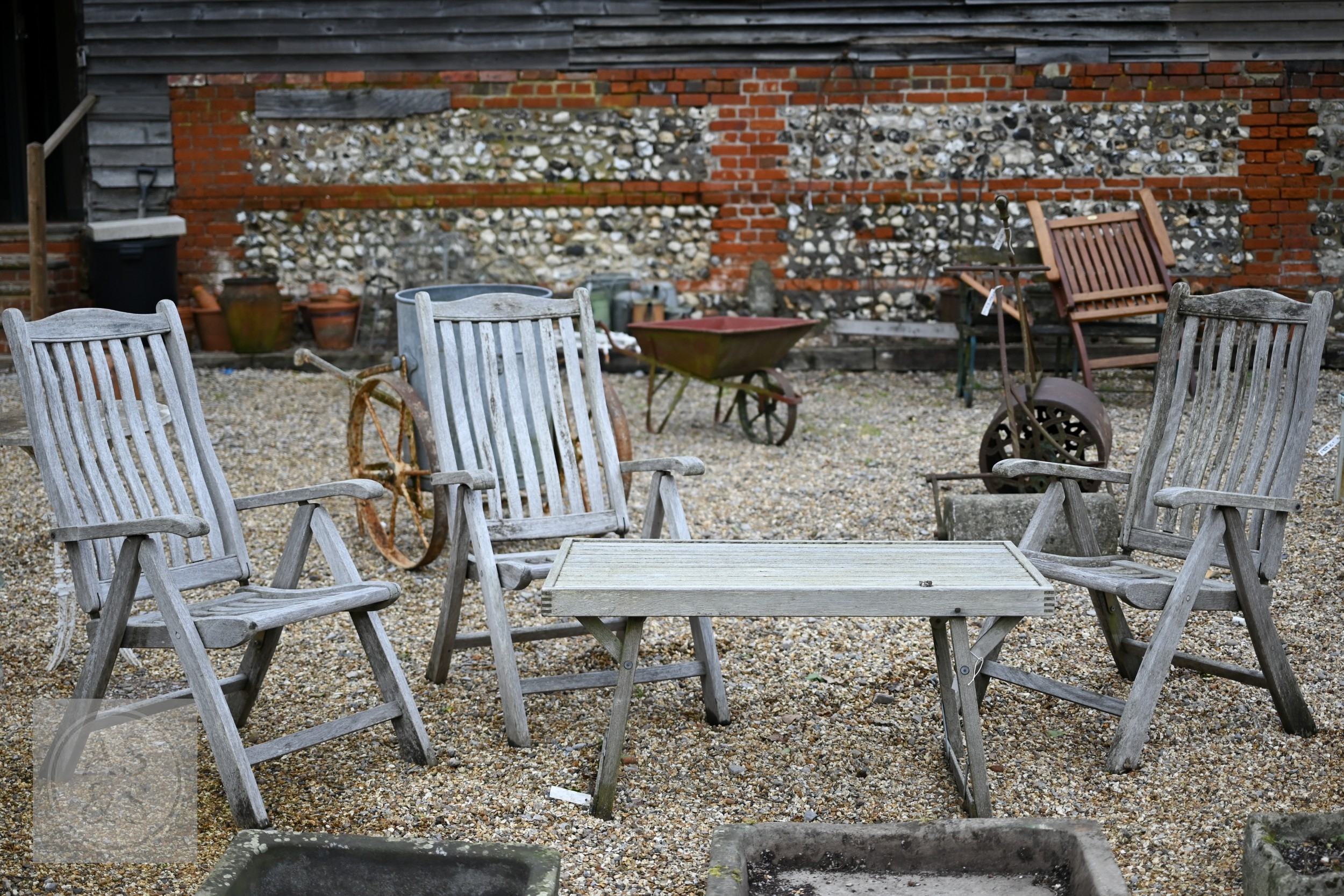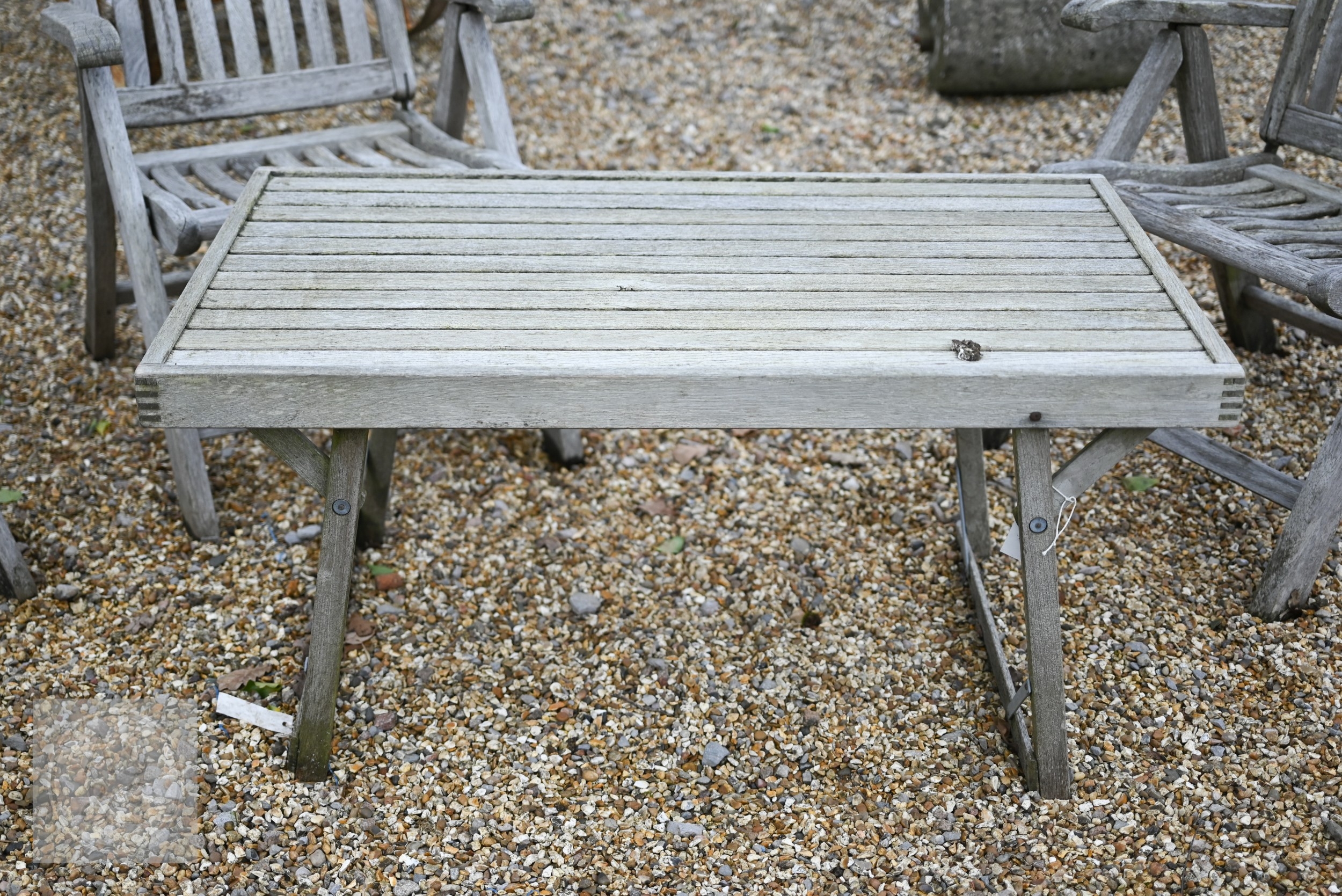 Three weathered teak folding armchairs by Alexander Rose to/with a teak coffee table (4)