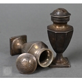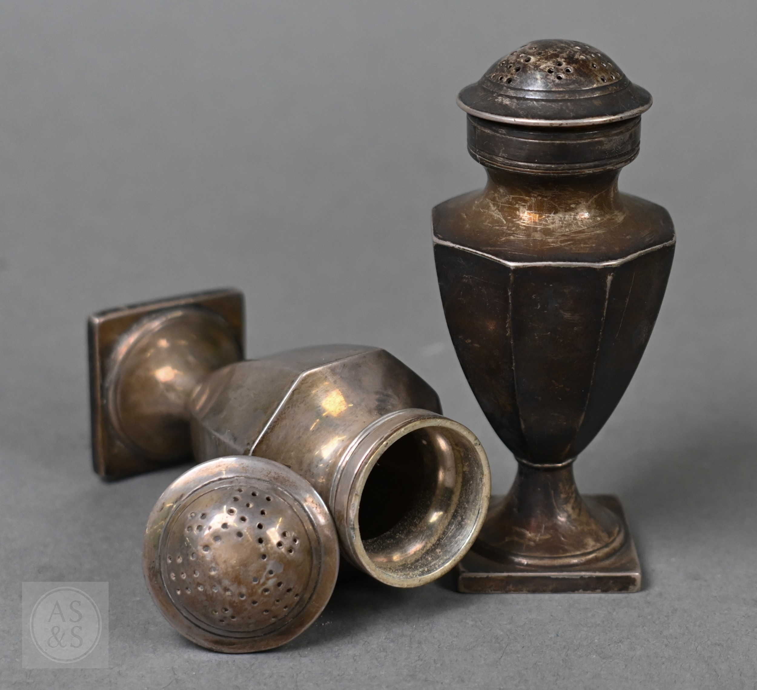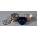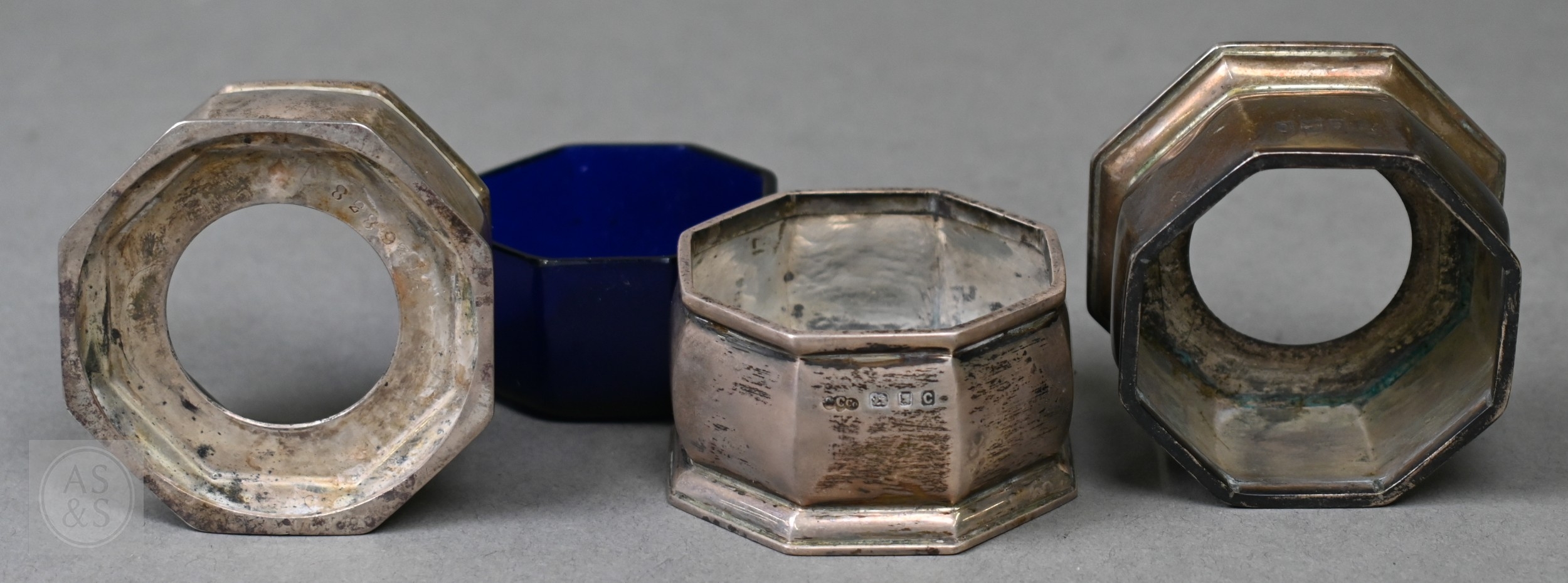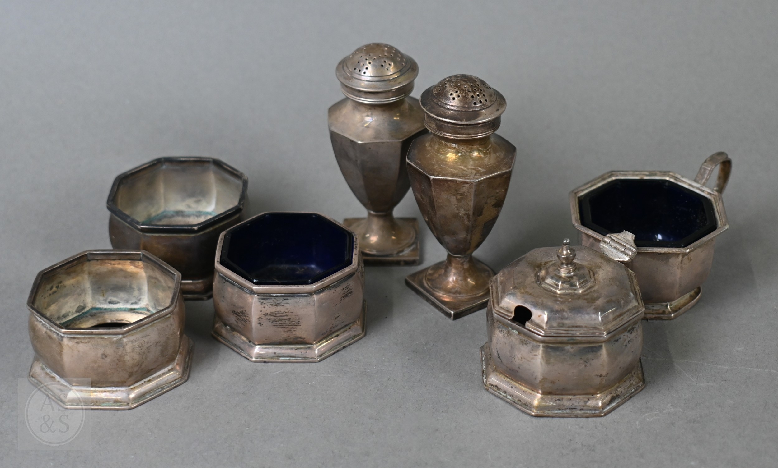 An octagonal silver seven-piece condiment set, Birmingham 1927/32, 8.6ozt net of glass liners (a/f)