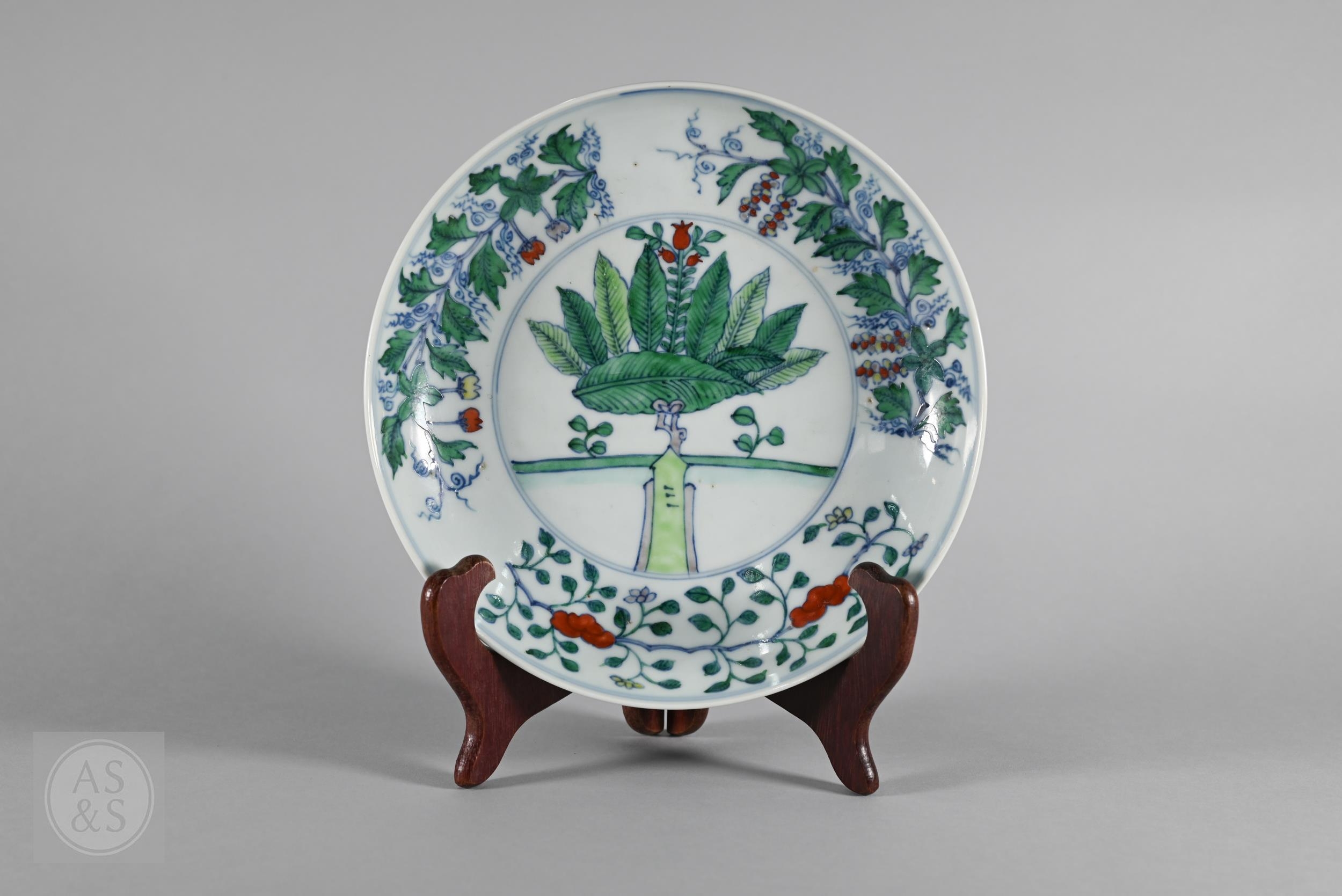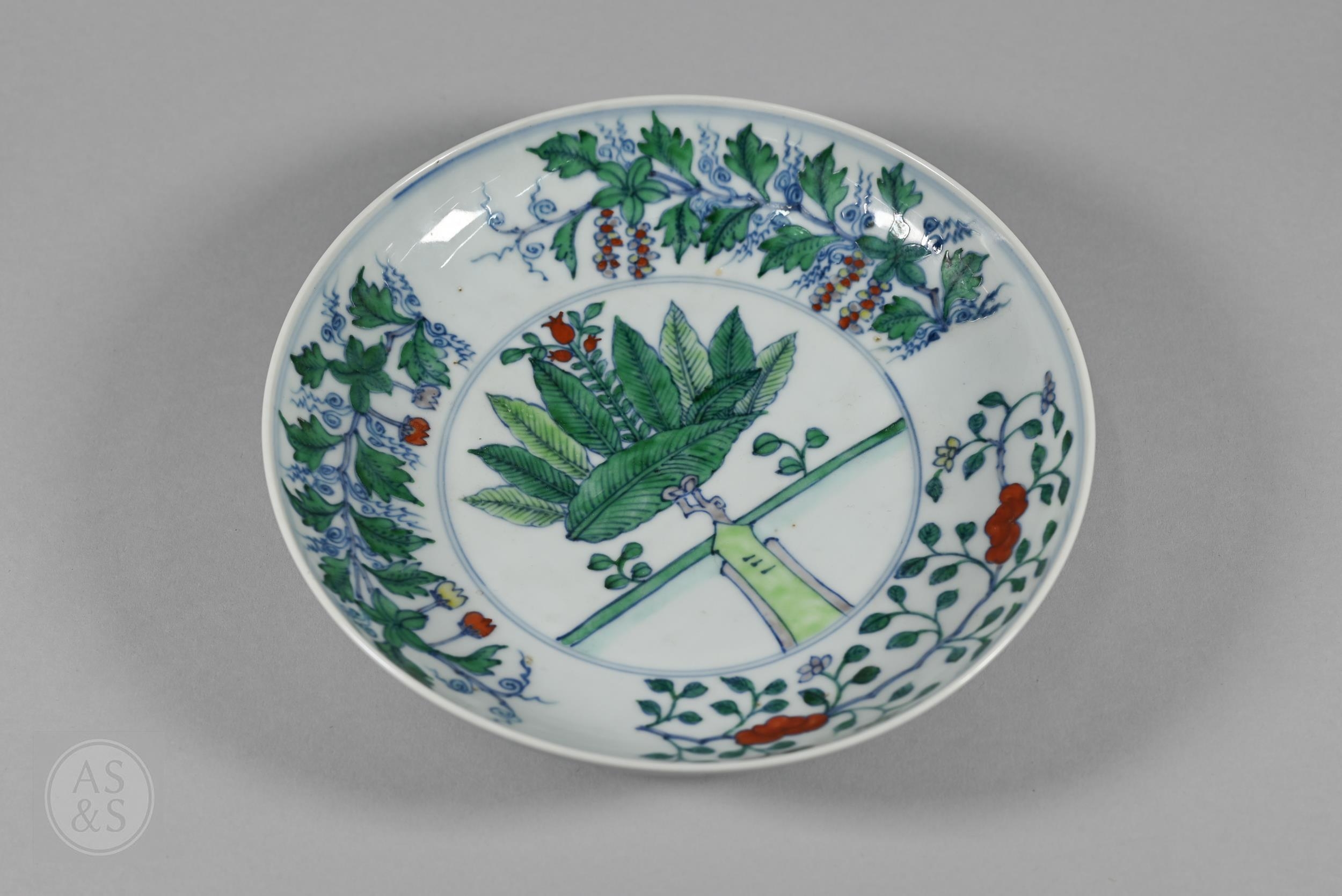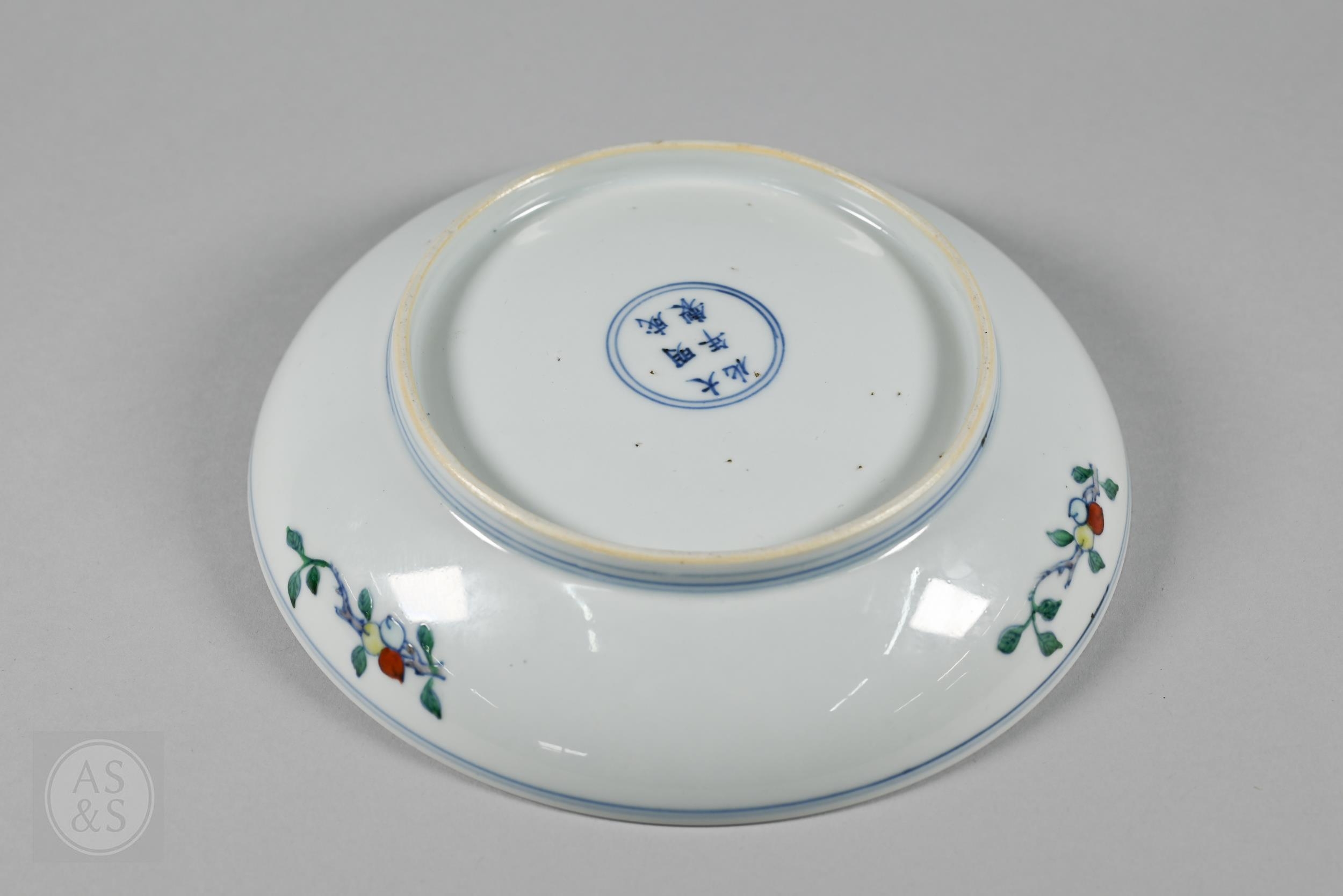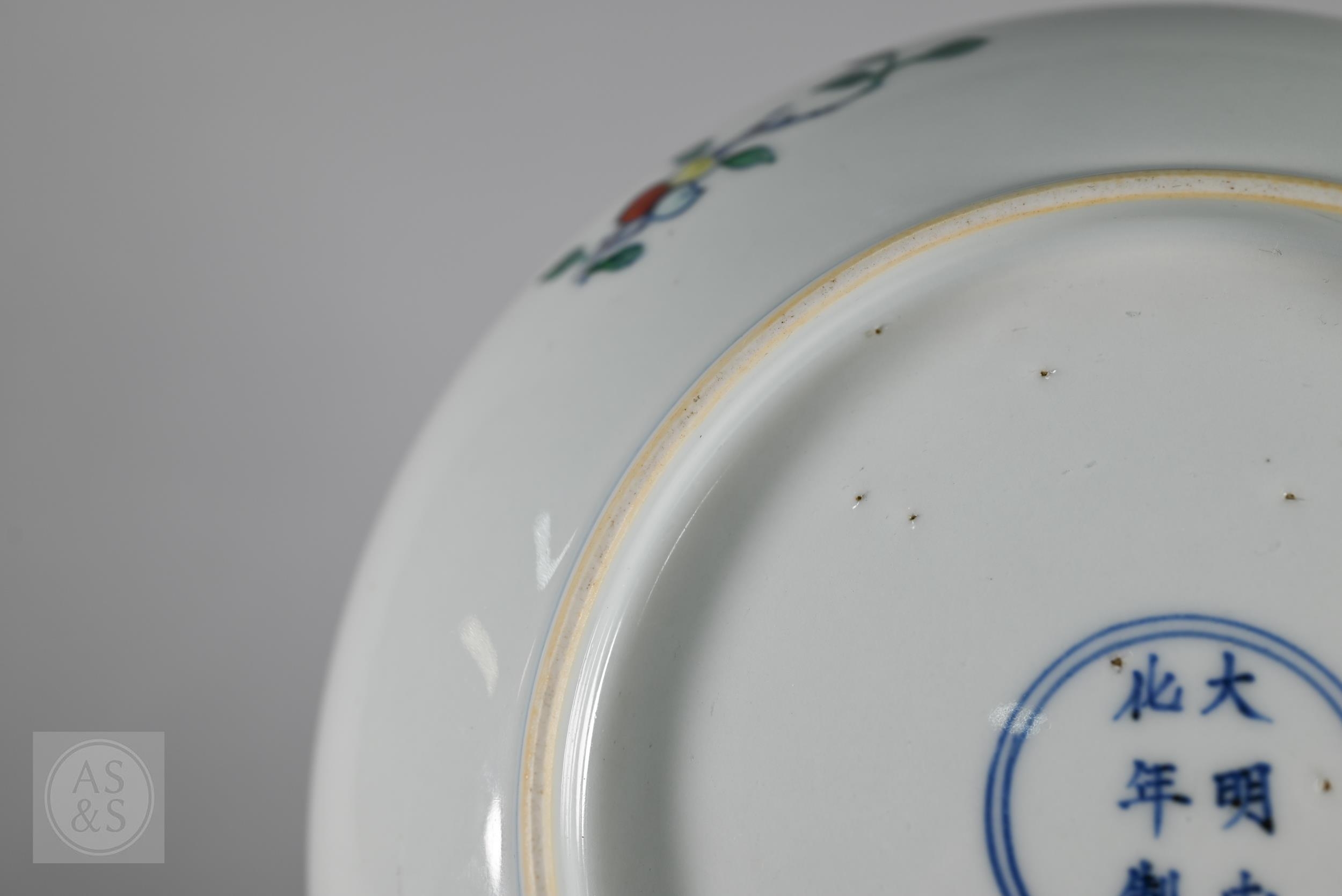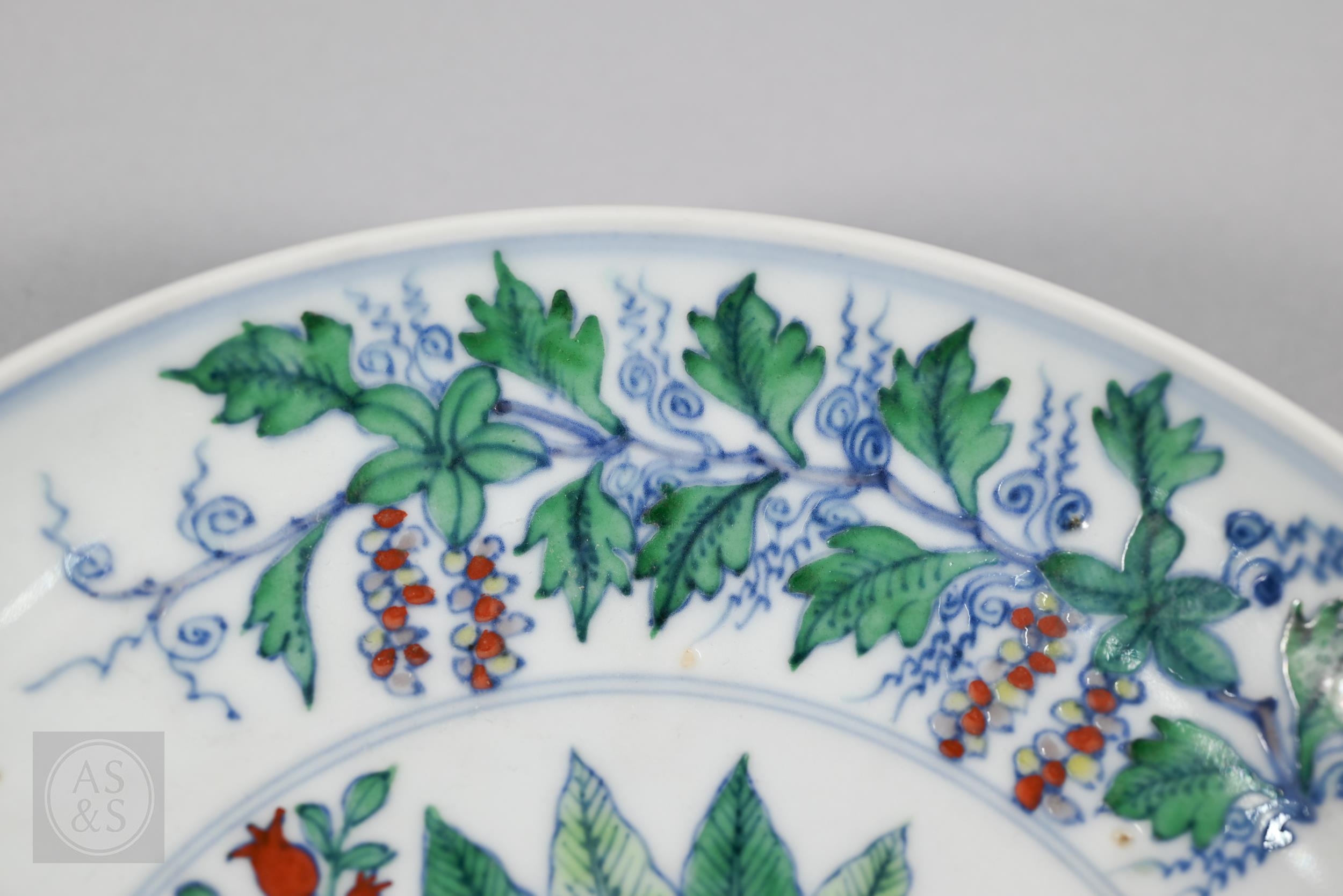 A Chinese Doucai pomegranate dish, the stylised central tree surrounded by grape, peach and pomegranate sprays in polychrome enamels with underglaze blue outlines and the base with Ming dynasty six character Chenghua mark within a double circle but later in date, possibly mid Qing dynasty, 20.5 cm diameter x 4.5 cm high