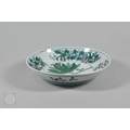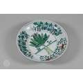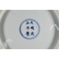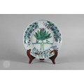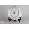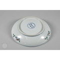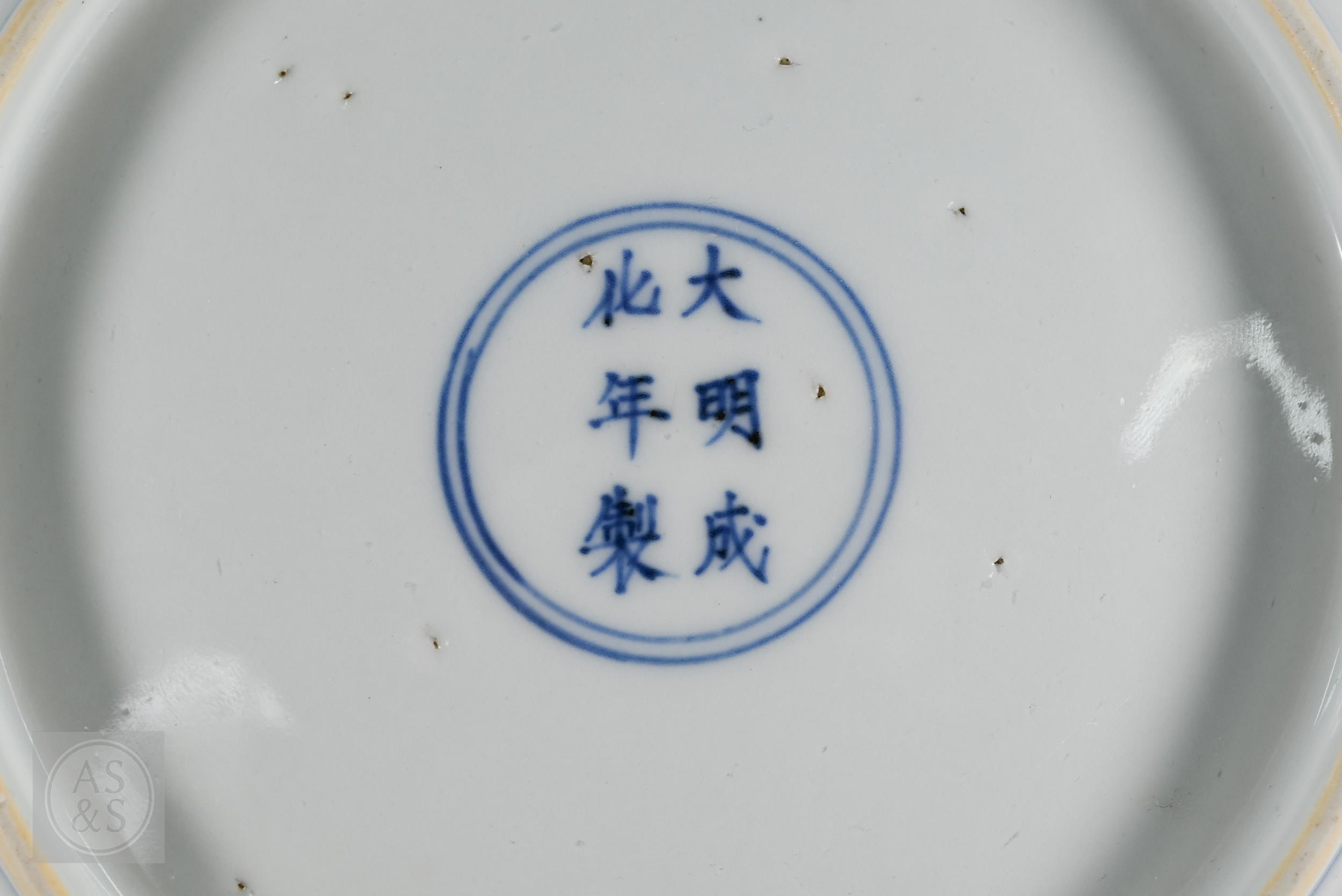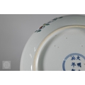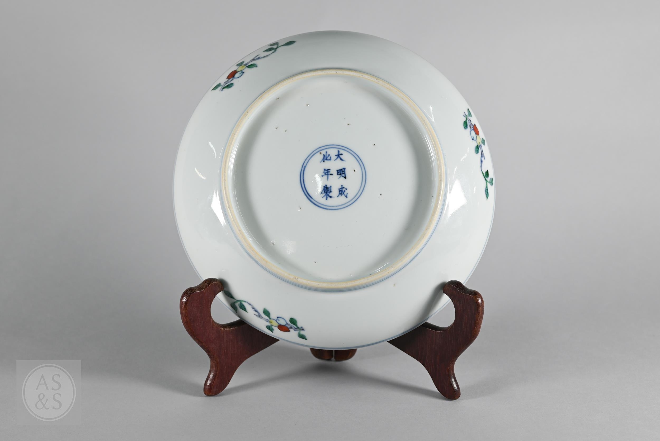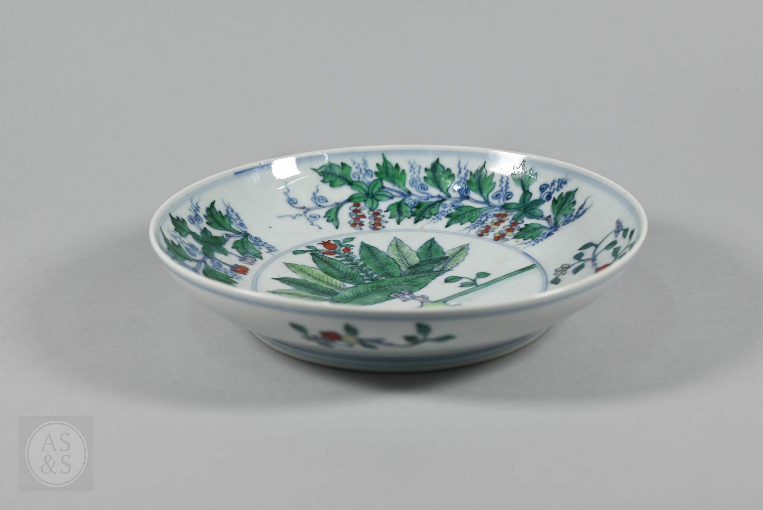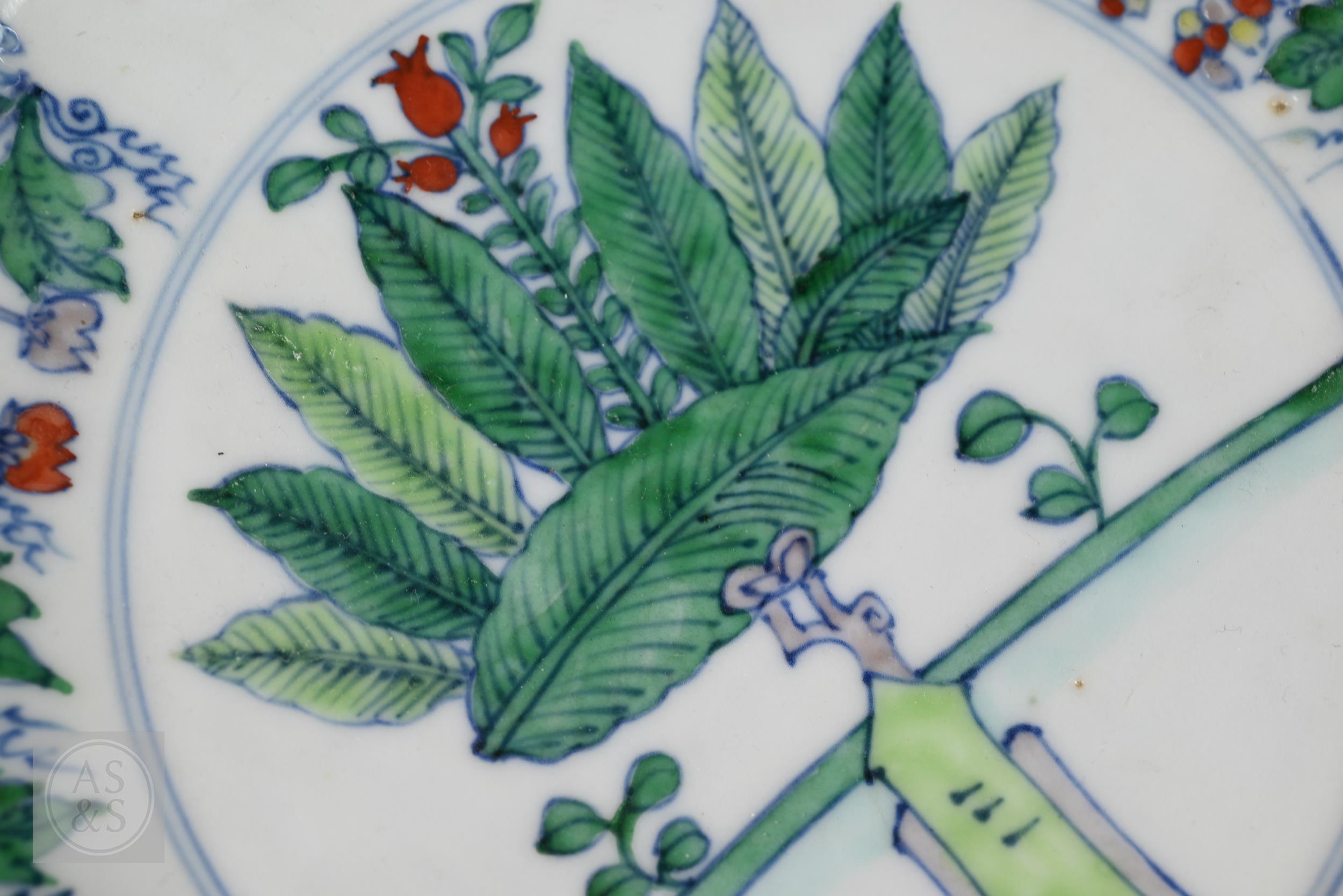 A Chinese Doucai pomegranate dish, the stylised central tree surrounded by grape, peach and pomegranate sprays in polychrome enamels with underglaze blue outlines and the base with Ming dynasty six character Chenghua mark within a double circle but later in date, possibly mid Qing dynasty, 20.5 cm diameter x 4.5 cm high