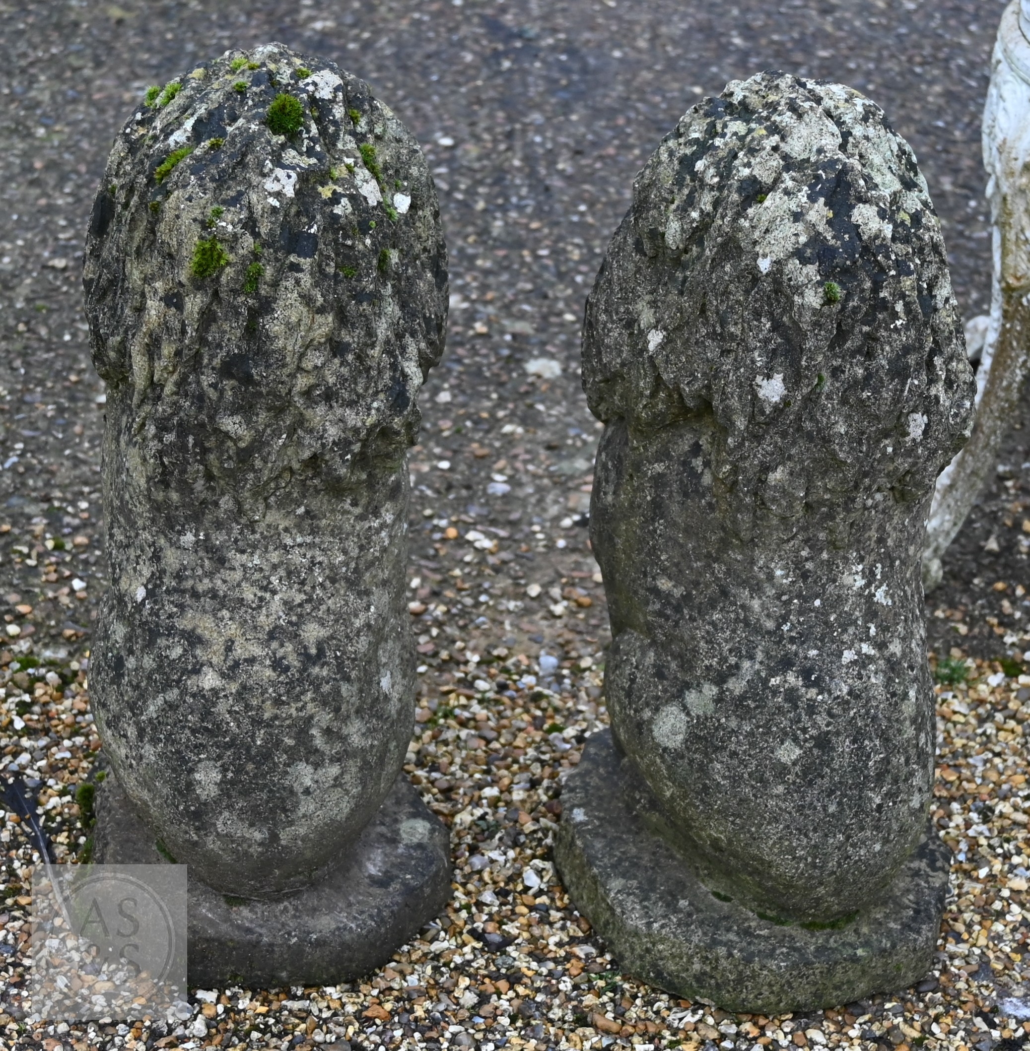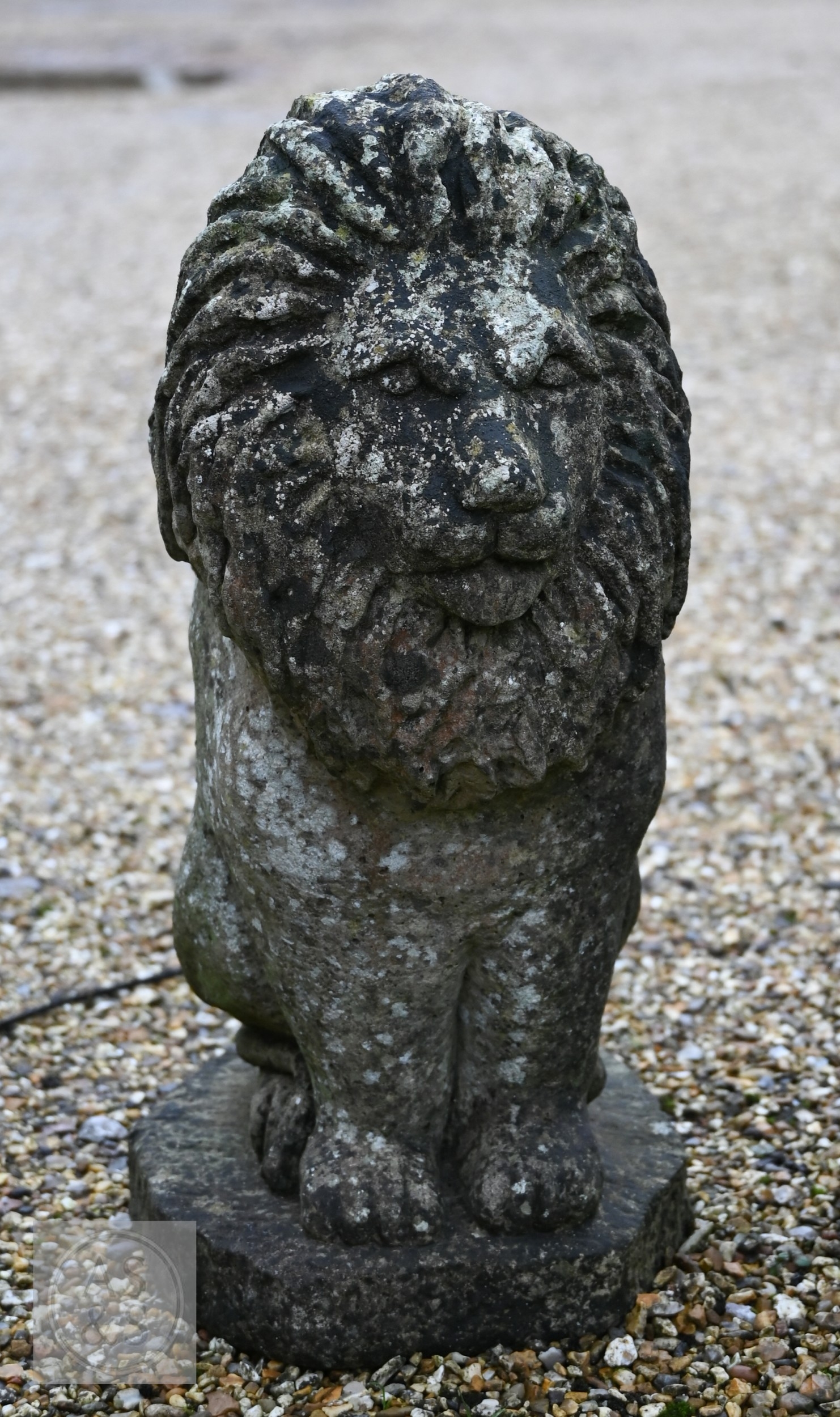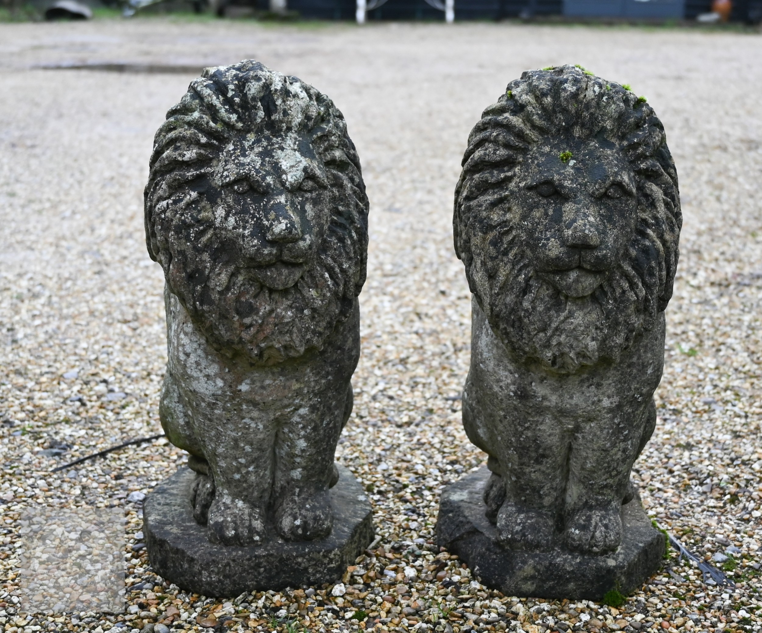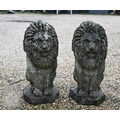 A pair of weathered reconstituted stone lions (2)