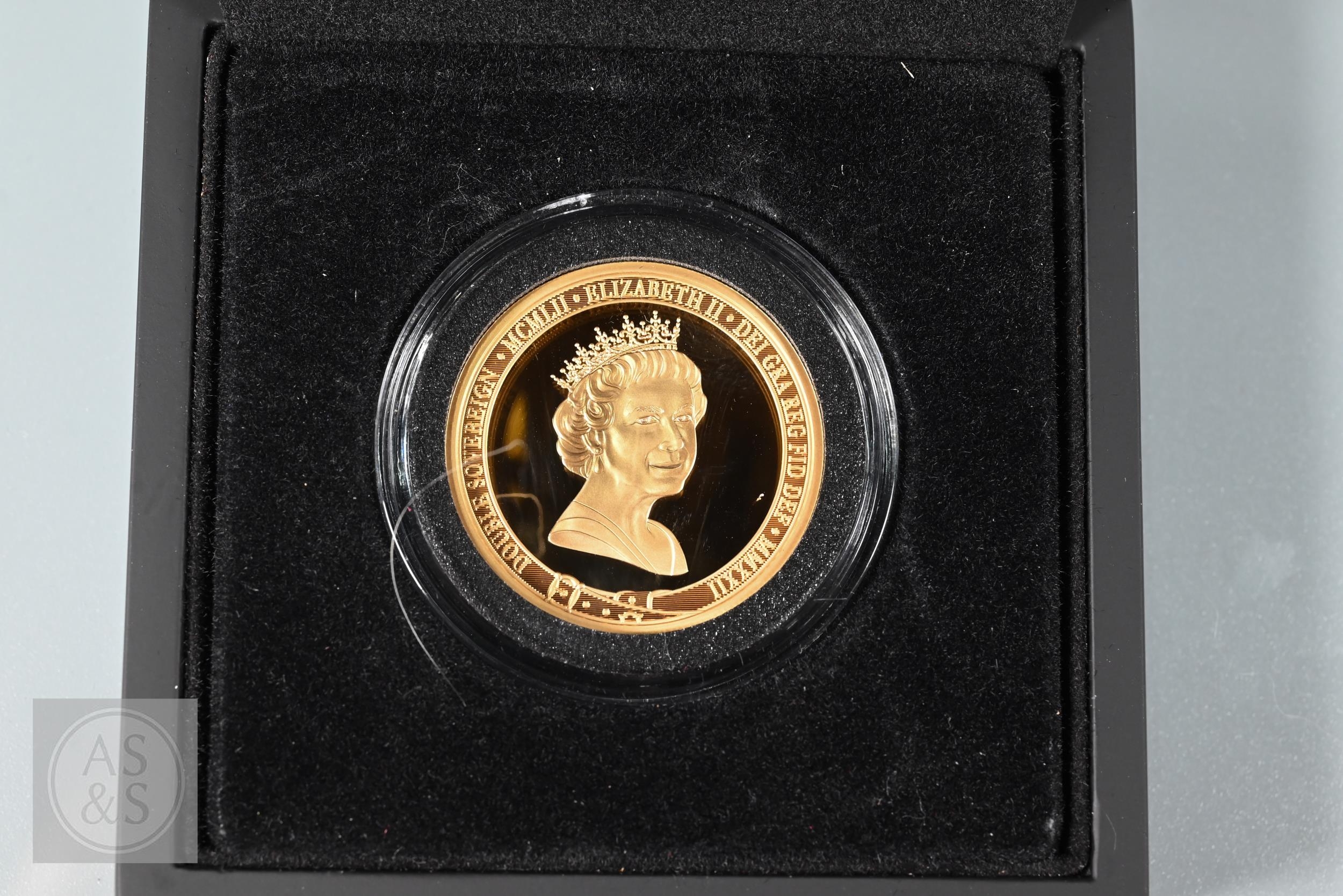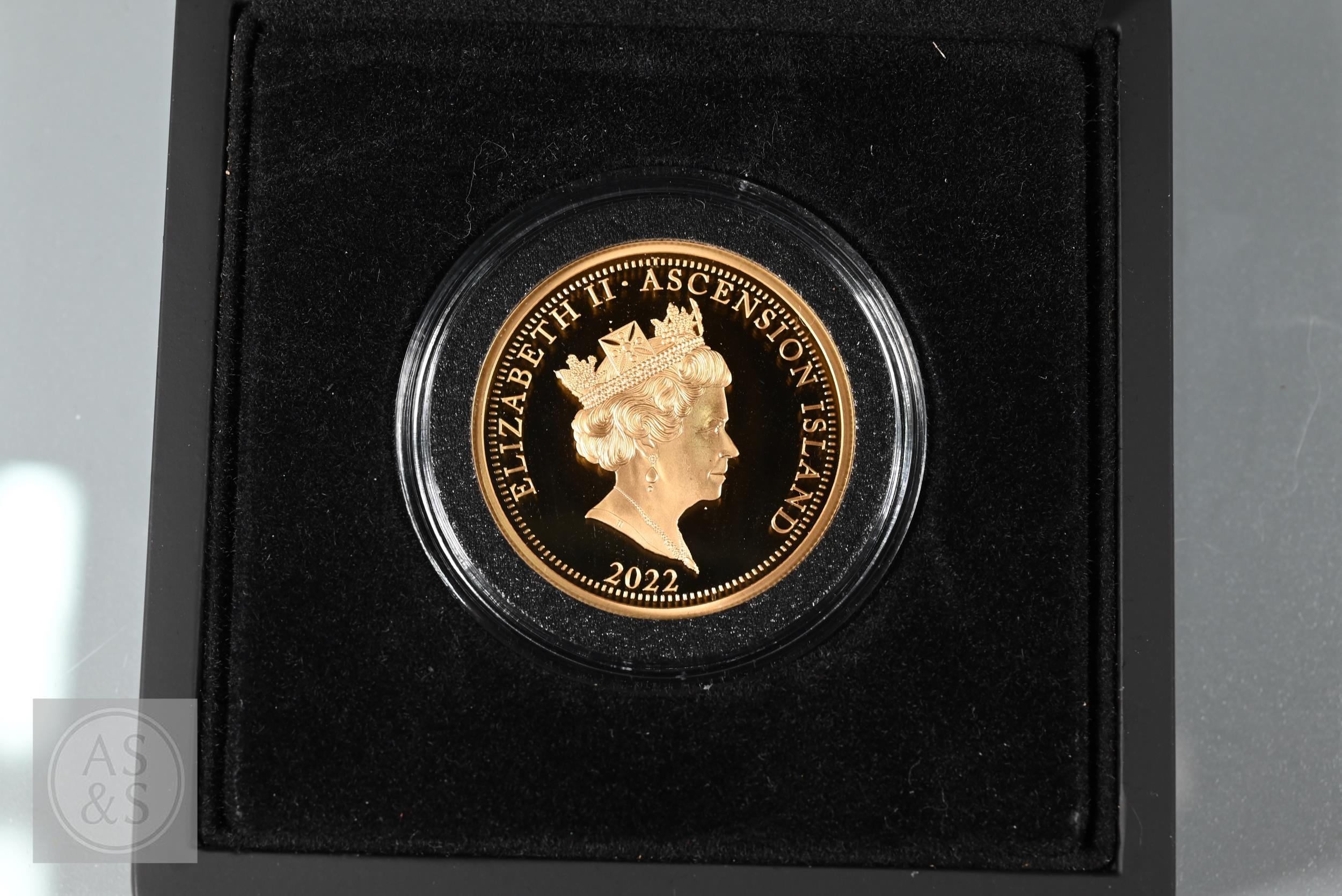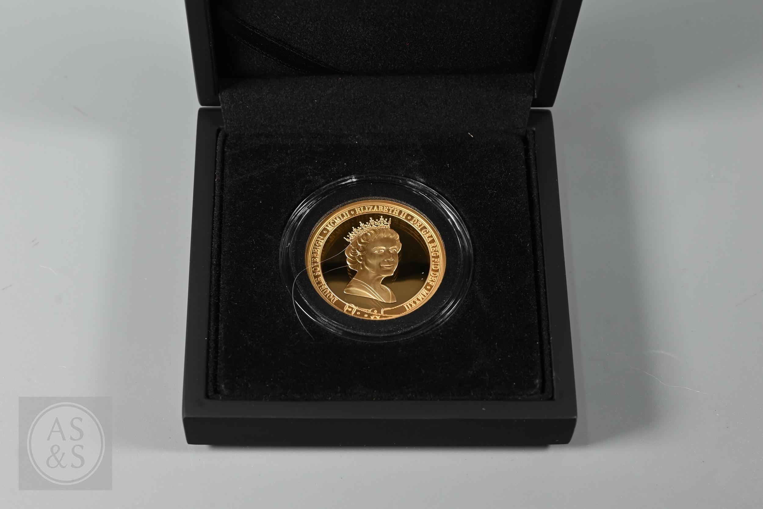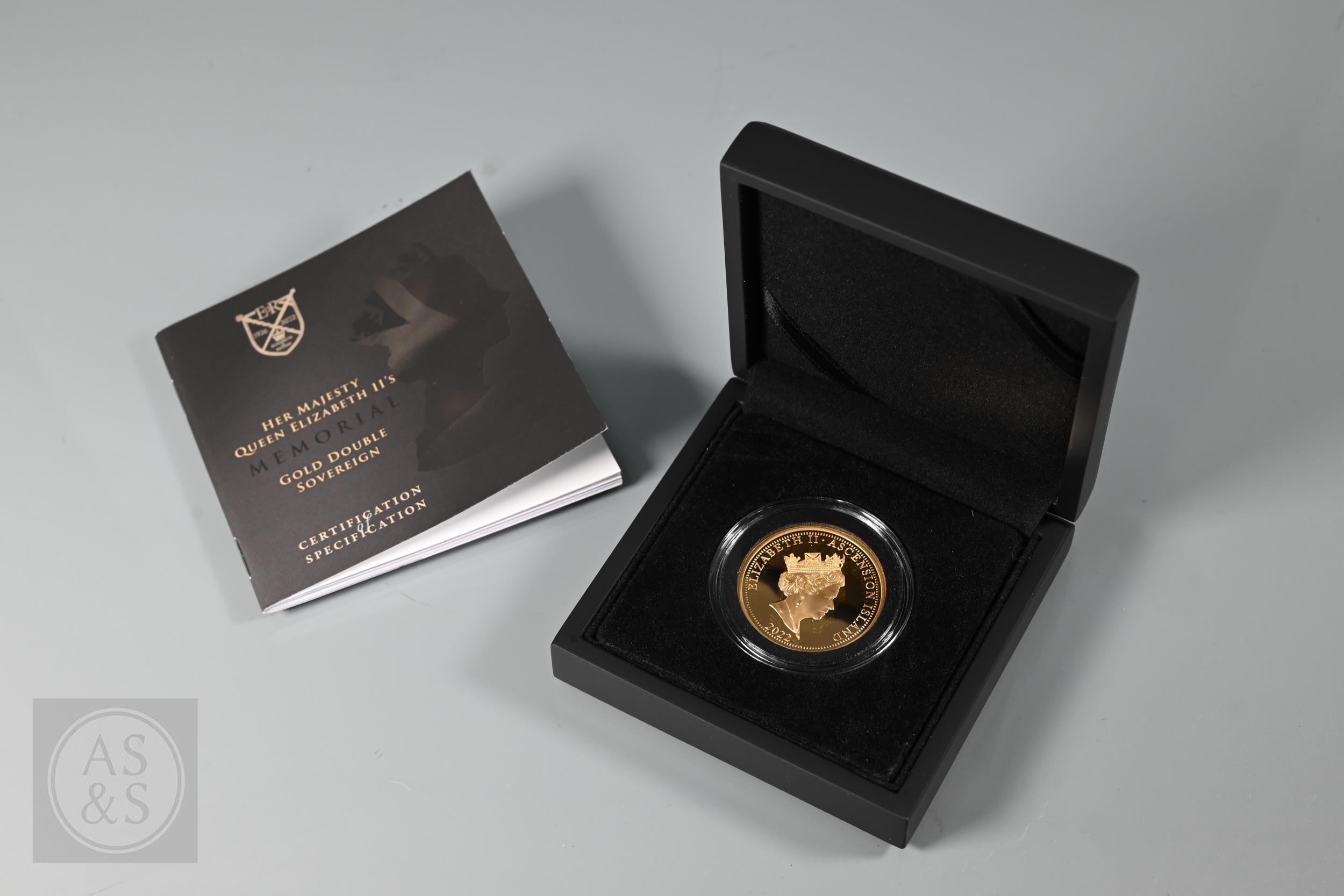 A Queen Elizabeth II Memorial gold double sovereign, 2022, 32mm, 16g, Ascension Island, edition of 96, c/w certificate of specification, boxed